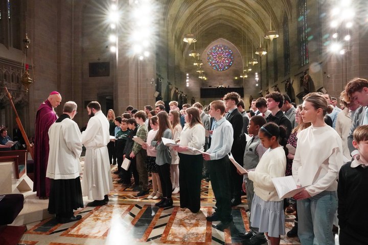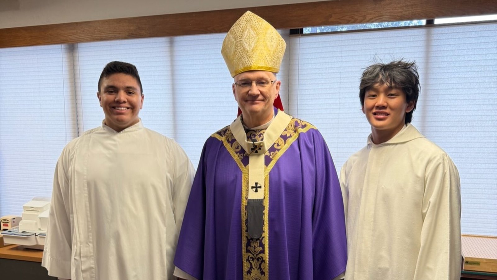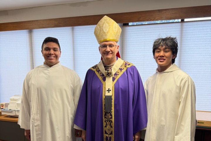 On Friday, Feb. 20, Archbishop Weisenburger returned to his former Diocese of Tucson, Arizona, to attend the installation Mass of his successor, Bishop James A. Misko, center, at St. Augustine Cathedral. Bishop Misko, the Diocese of Tucson's eighth bishop, succeeds Archbishop Weisenburger, who served as bishop of the southern Arizona diocese from 2017 until his appointment as Detroit's archbishop last year. Bishop Gerald F. Kicanas, left, Tucson's sixth bishop, who served as the diocese's apostolic administrator until Bishop Misko's recent appointment, is also pictured.