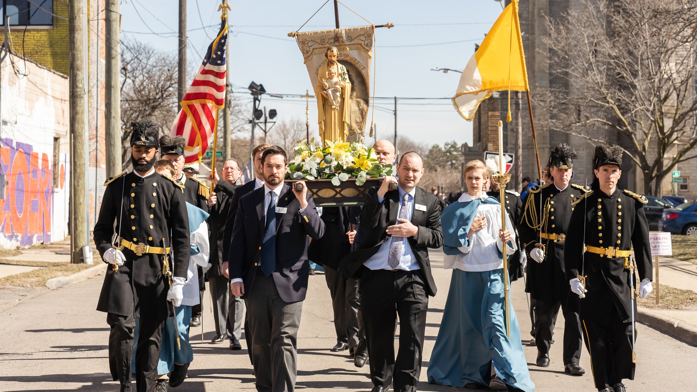 The presence of Cardinal Burke allowed for the celebration of a Pontifical High Mass — the first at St. Joseph Shrine in decades — before the congregation gathered for a procession across Gratiot Avenue and toward the sheds of Eastern Market, where the faithful venerated a second-class relic of St. Joseph.