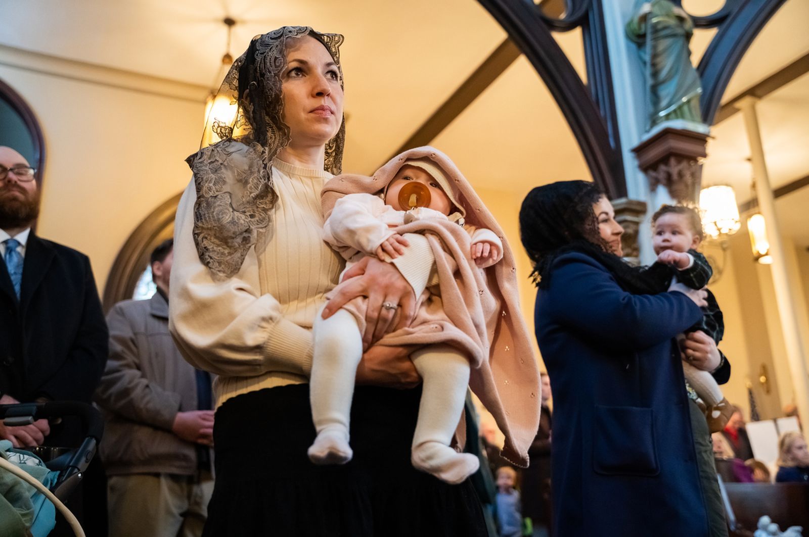 Nine years later, the parish is alive again — nearly 700 people of all ages come to church on Sundays to attend one of its three Masses, filling the tightly lined pews. The church’s perfect acoustics make it so the sounds of the countless parish children and babies in the back reach Canon Jean-Baptiste Commins, ICKSP, up at the altar.