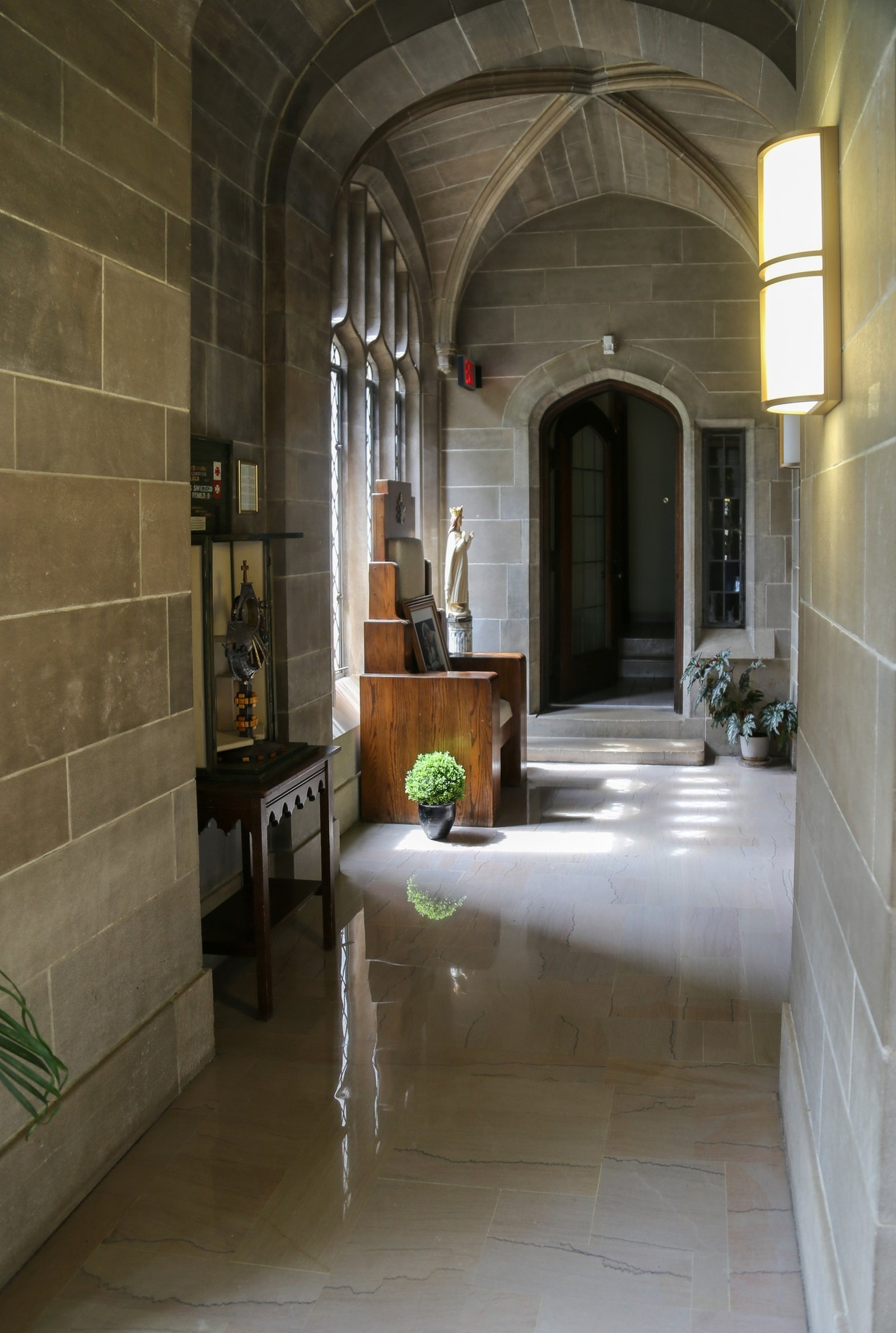 Stop by the parish office for a formal tour with the staff (and maybe, if you're lucky, a chance to pet Fr. Mech’s friendly rescue dog, Annie). The office hallway is lined with artwork Fr. Mech rescued from disposal or from closed churches — on one wall, pilgrims can study various paintings of Jesus Christ and contemplate holy scenes from his life. Parallel to this wall, curious visitors can look at pictures and read about the history of the cathedral. The hallway from the parish offices leads down through the sacristy to the sanctuary.