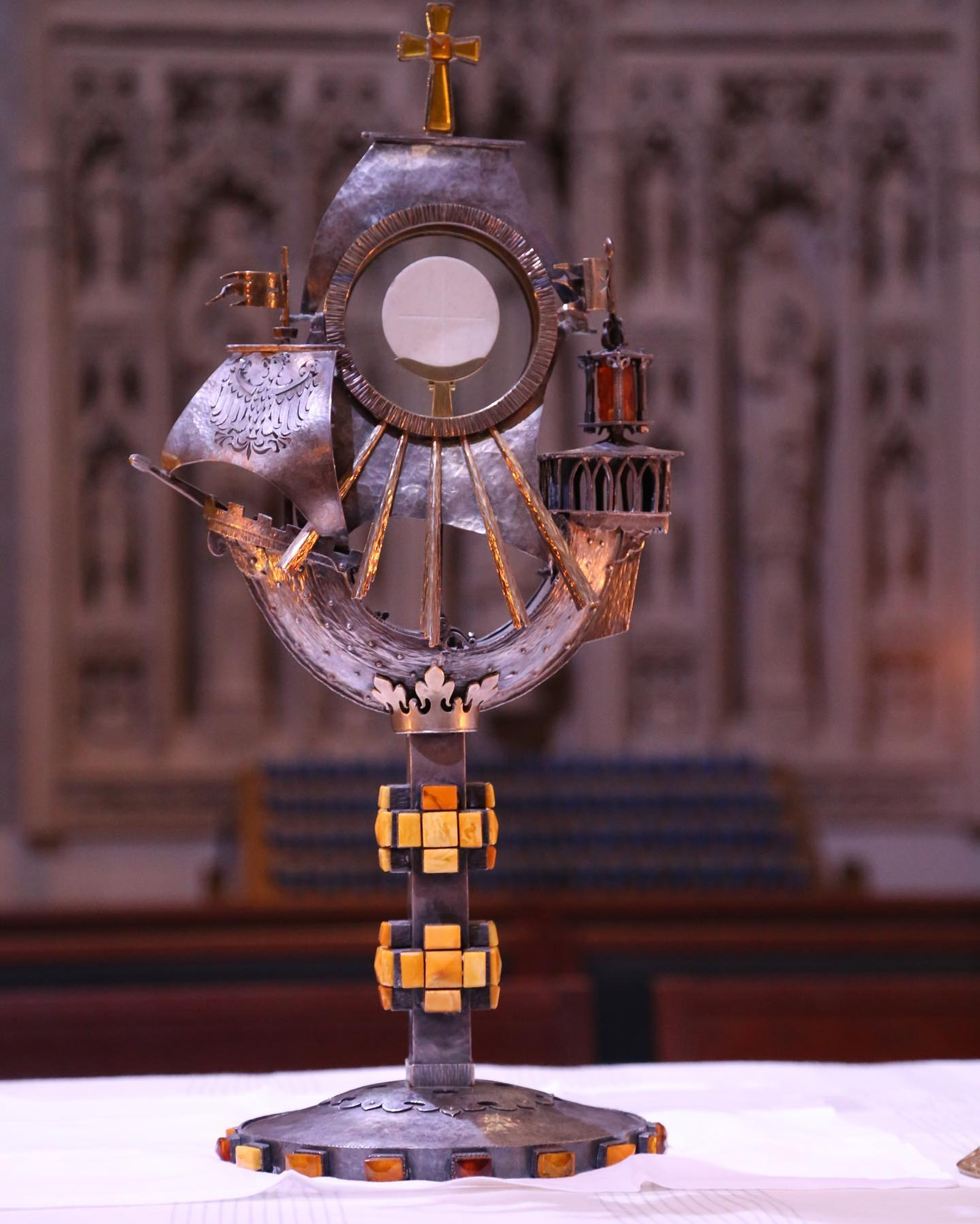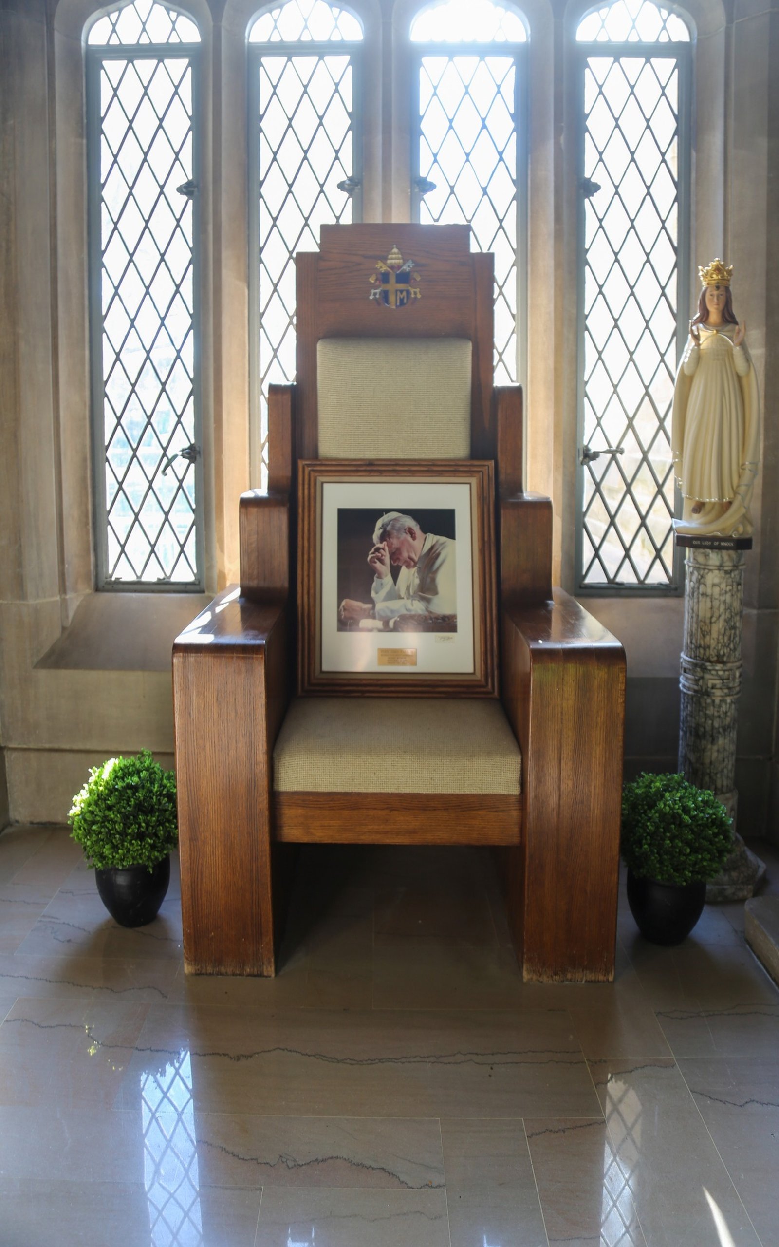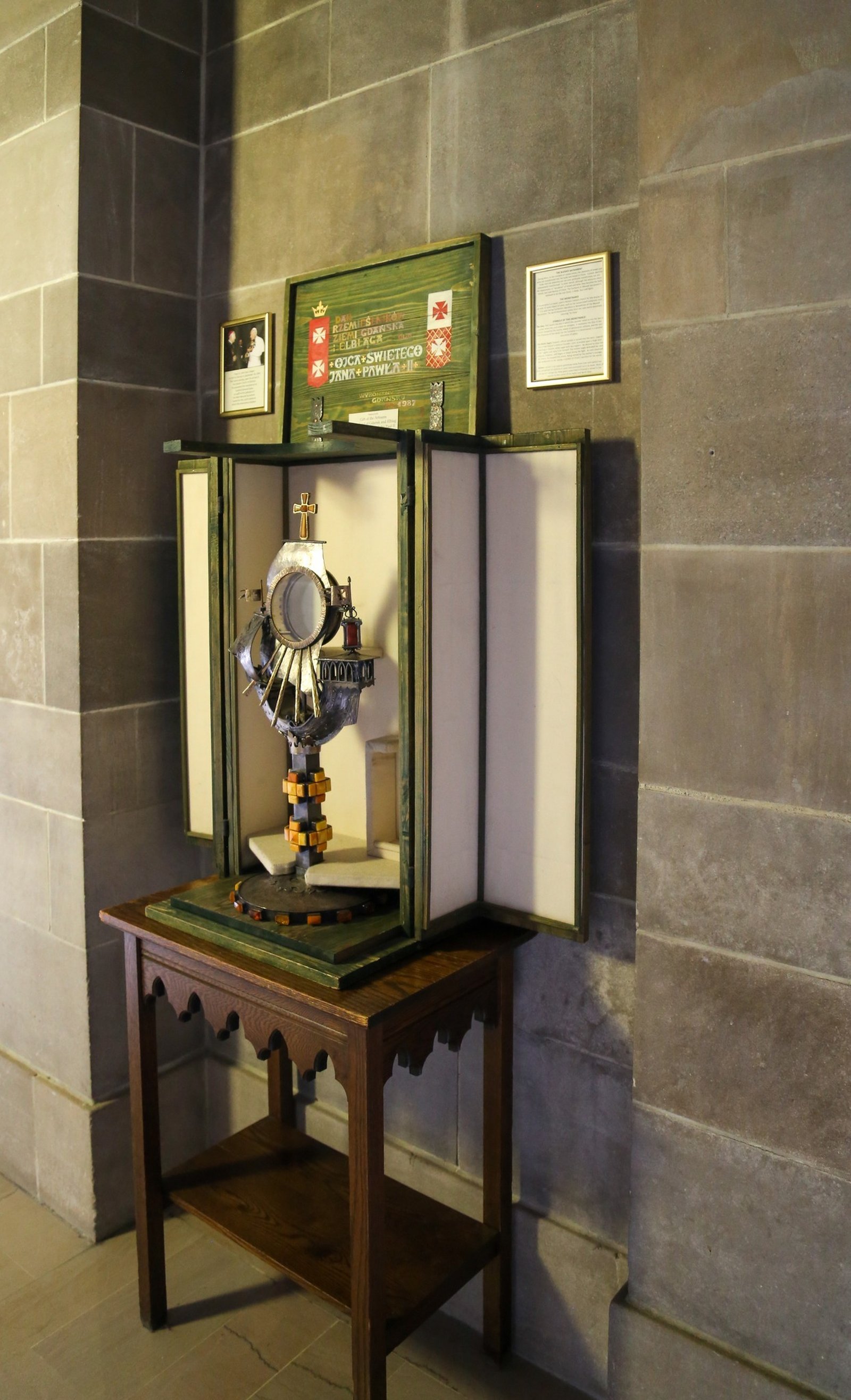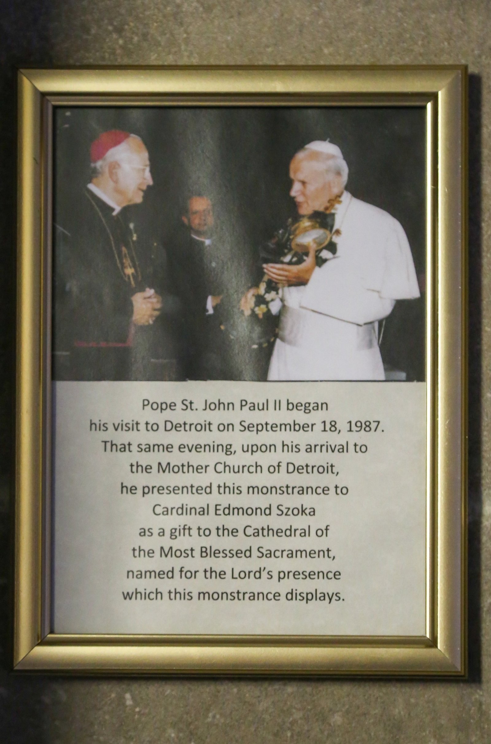 In the hallway off to the side of the sanctuary, visitors can study various treasures from the history of the local Church, including the ceremonial throne made for Pope St. John Paul II during his visit to Detroit in September 1987, which is now a second-class relic. Next to the chair is a beautiful Polish-made brutalist monstrance in the shape of a ship, gifted to the cathedral by the pope during his visit. Go down further to see stone carvings from the former cathedral structure as well as two paneled paintings of the apostles, which experts from the Detroit Institute of Arts believe are from the 13th century.