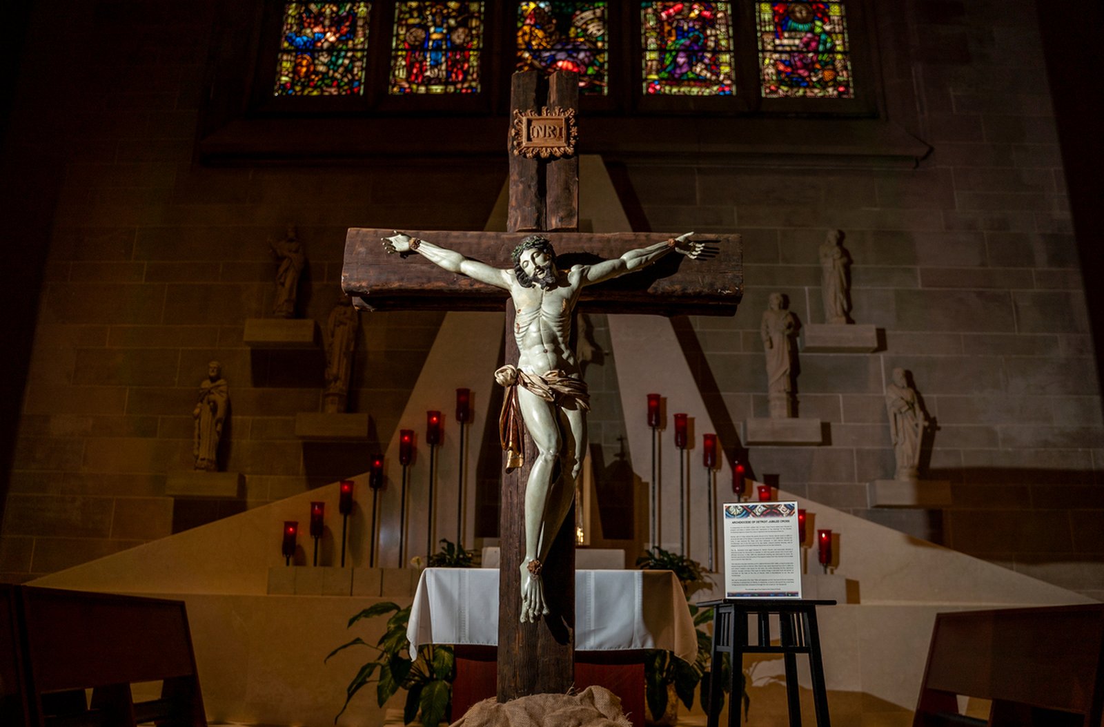 Fr. Mech said the destruction of the former cathedral and the repurposing of its beams for a new crucifix parallel Detroit's hopeful history.