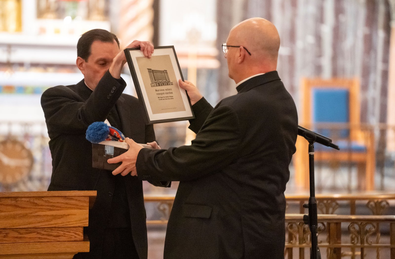 Fr. Jeffrey Day, moderator of the curia, presented Archbishop-designate Weisenburger with a few gifts on behalf of the local Church, including a photo of Michigan Central Station with the motto of the city of Detroit, "Speramus Meliora; Resurget Cineribus," which means, "We hope for better things; it will arise from the ashes."