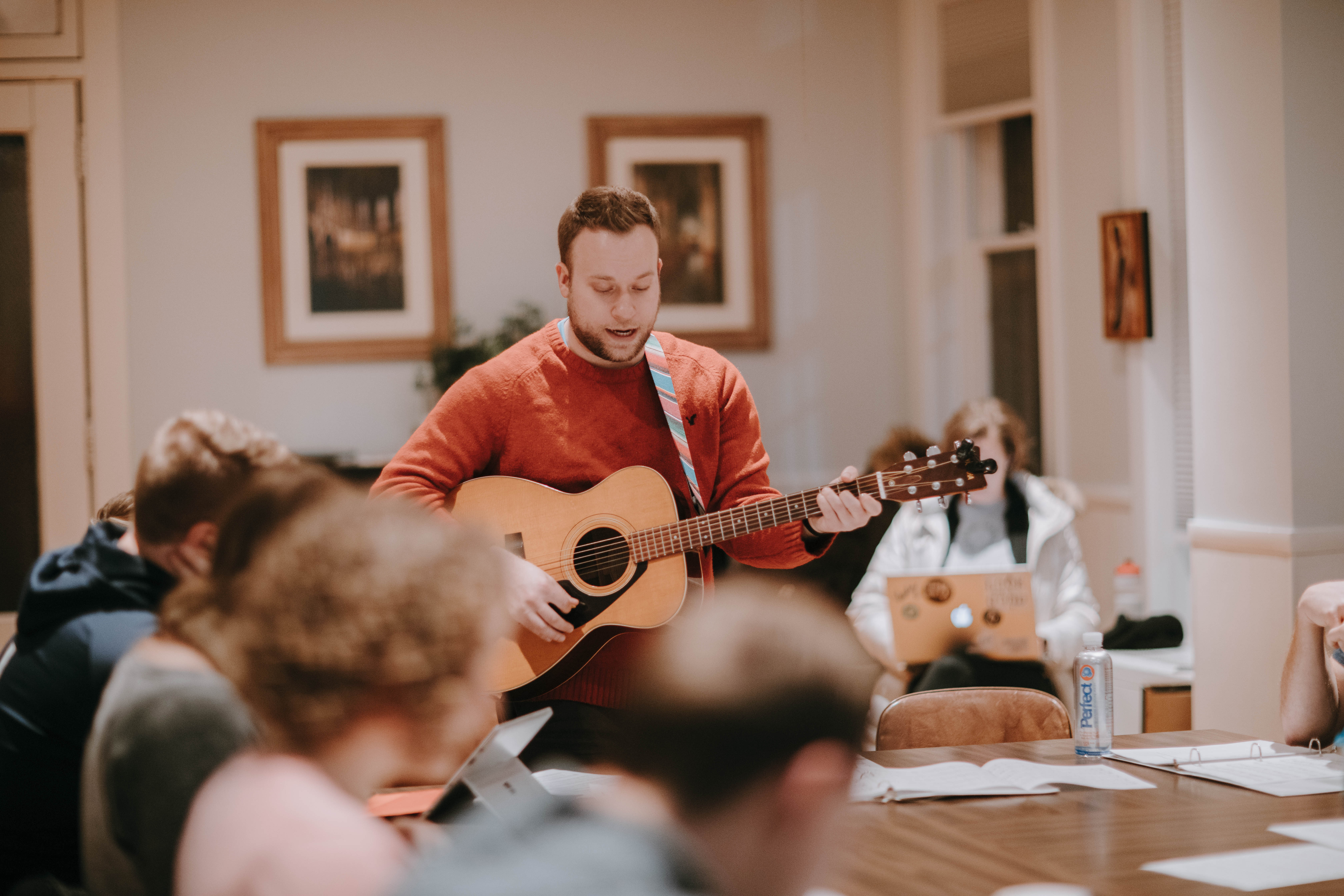“Hope and Fears: An Advent Reflection” writer and producer Paul Center plays the guitar during a rehearsal of the Advent play. “Hopes and Fears: An Advent Reflection” will play at Ste. Anne de Detroit Parish on Dec. 13-14. (Photos by Naomi Vrazo | Archdiocese of Detroit)