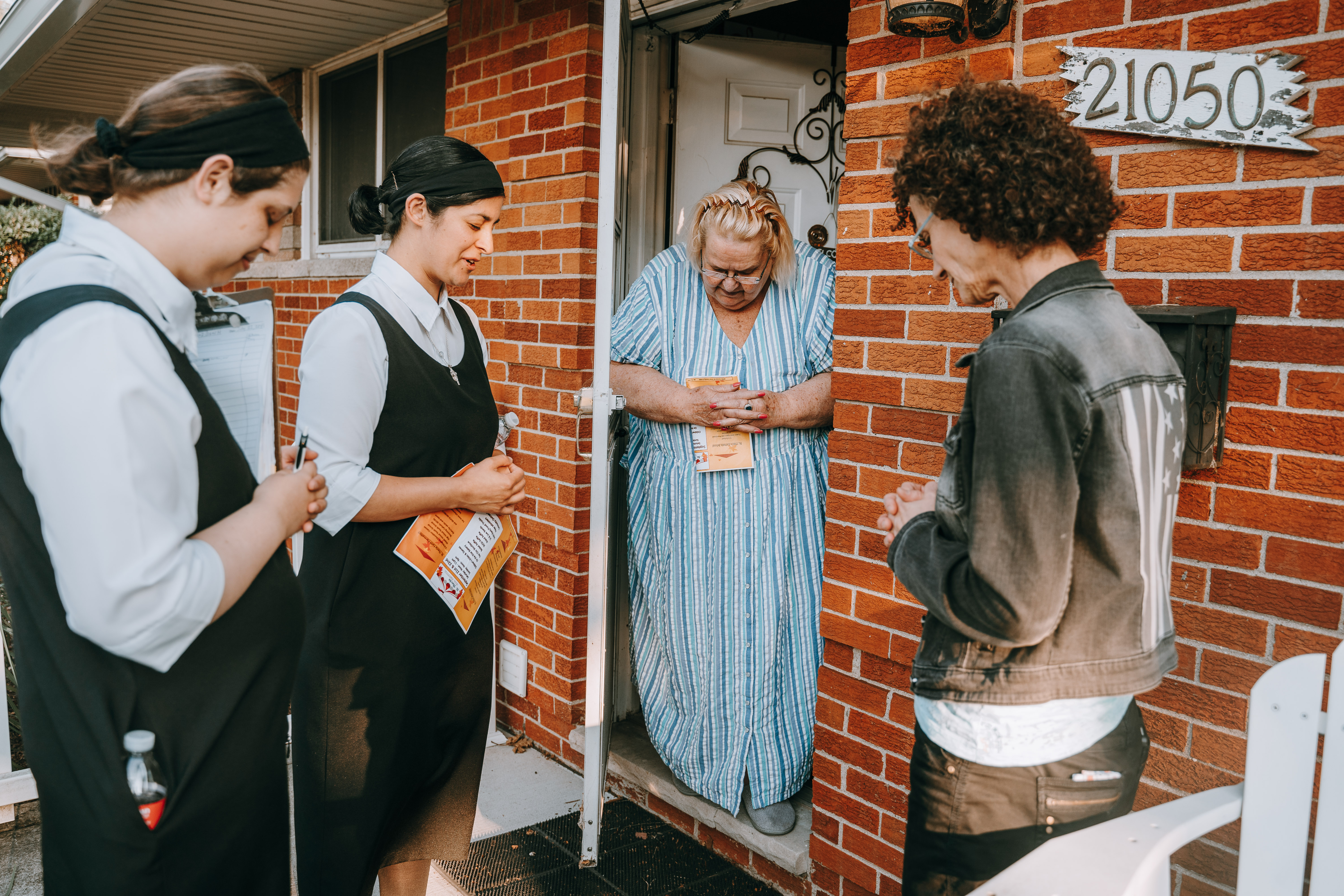 Volunteers from St. Thecla Parish and the Divine Mercy Center in Clinton Township pray with a homeowner in the neighborhood July 22. The door-to-door ministry was inspired by a similar effort in Detroit earlier this year, with volunteers seeking to foster “positive encounters” with the parish by talking, praying with and inviting people to parish events. (Photos by Valaurian Waller | Detroit Catholic)