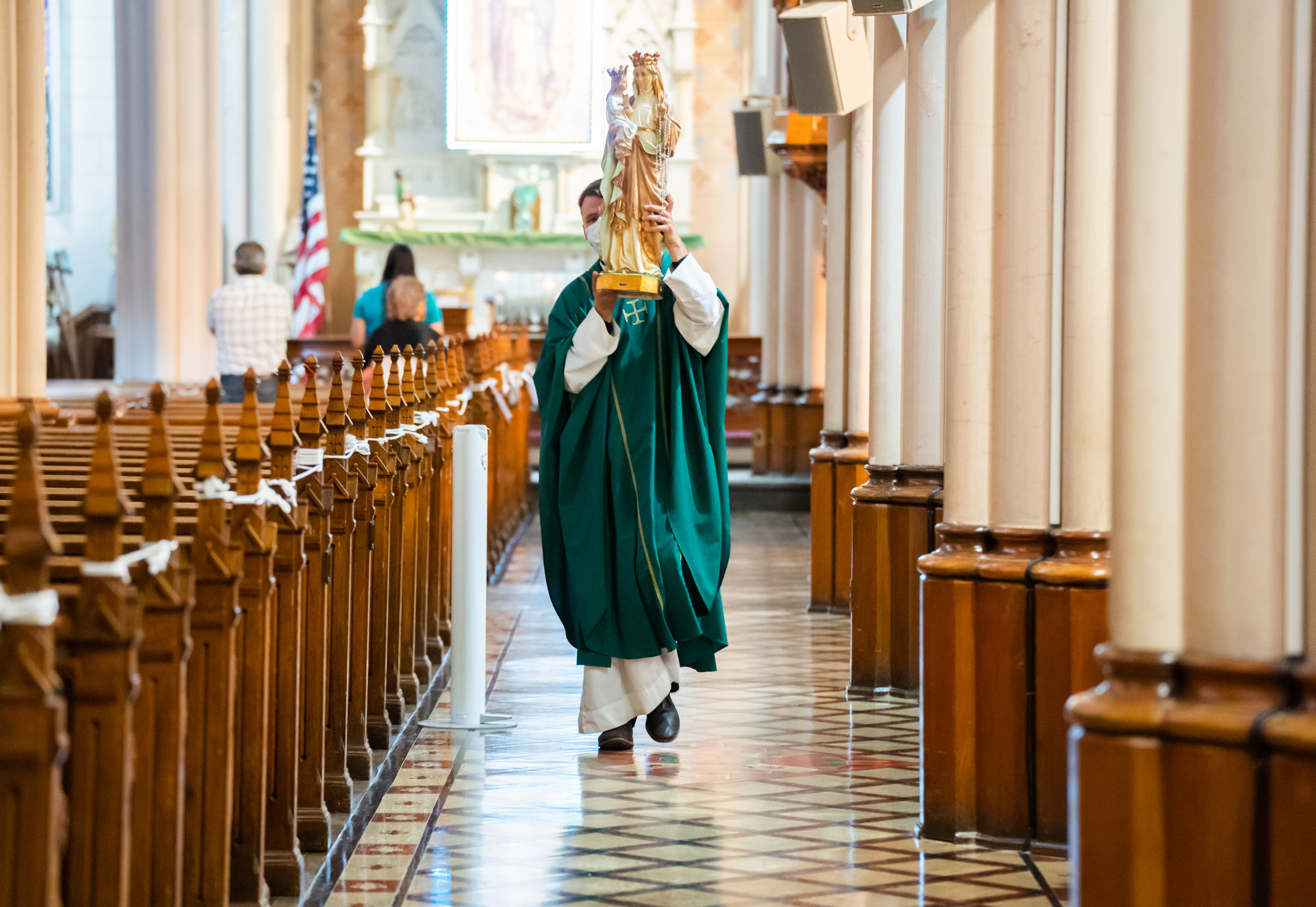 Fr. Ryan Adams, associate pastor of the Basilica of Ste. Anne in southwest Detroit, carries a statue of Ste. Anne, the grandmother of Jesus and patroness of the Archdiocese of Detroit, during a procession on the first night of the basilica’s annual novena, which began July 17 and concludes July 26, her feast day. (Photos by Valaurian Waller | Detroit Catholic)