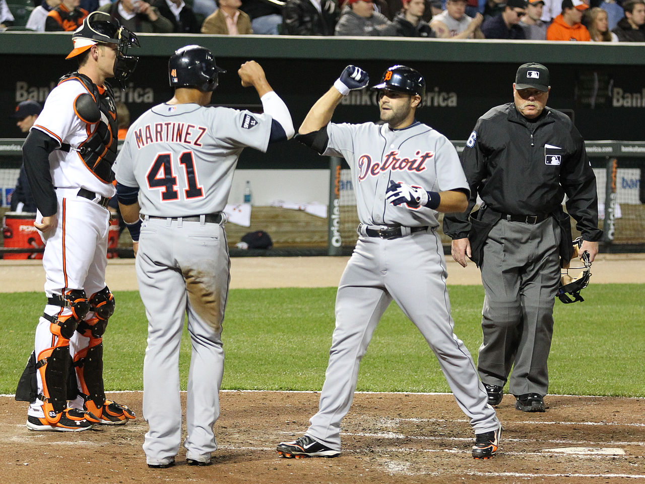 Former Detroit Tigers catcher Alex Avila, right, crosses home plate in celebration with Victor Martinez in this 2011 photo. Avila, who attended De La Salle High School in Warren for his sophomore year, caught for seven seasons with the Tigers and is one of 22 CHSL athletes who have moved on to play Major League Baseball. (Keith Allison | Wikimedia Commons, CC-BY-SA-2.0)