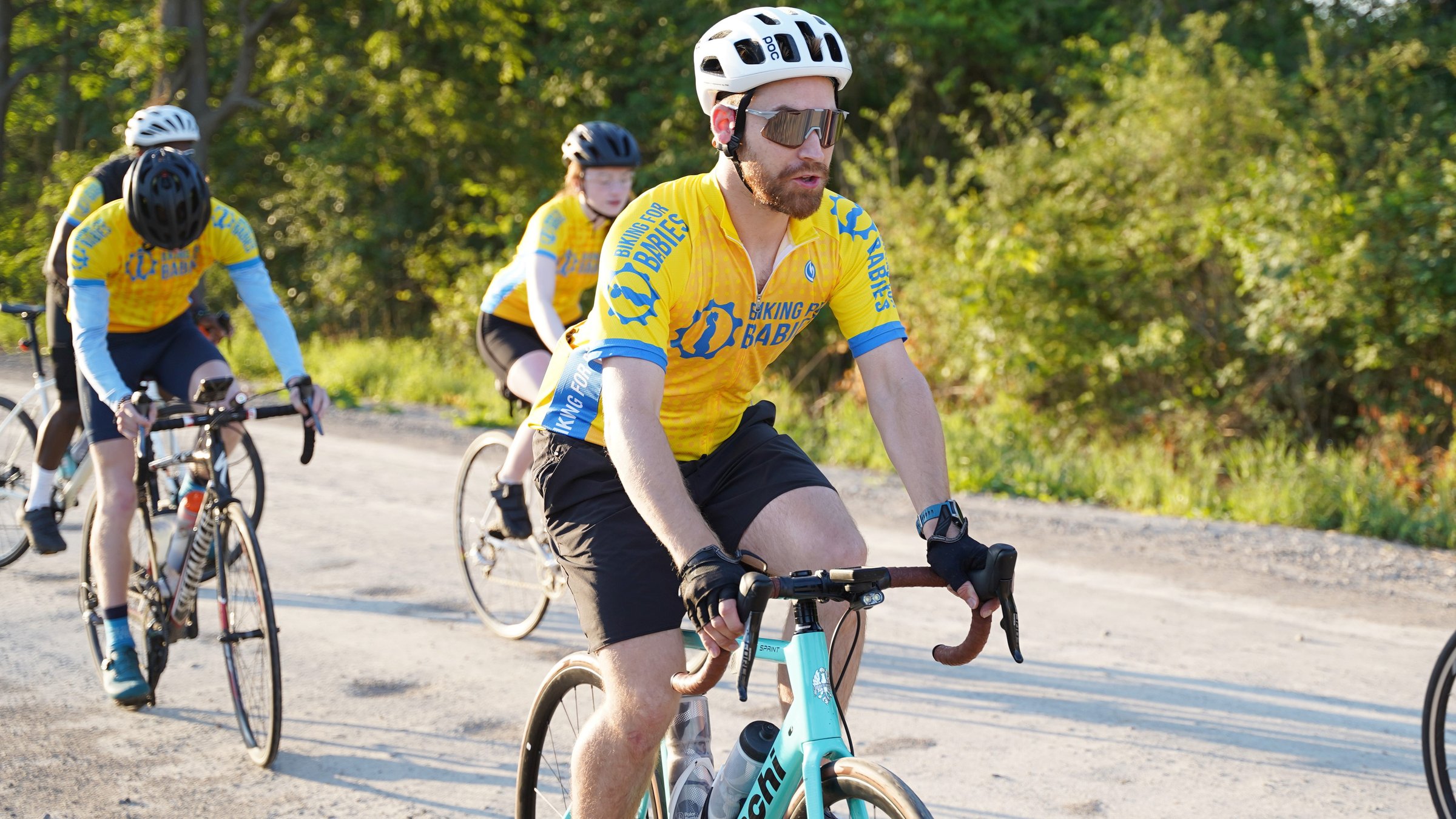 The Biking for Babies team wears uniforms to identify themselves, which invites conversations with people they encounter about what they are doing and why — and where people can donate. There is an information night and fundraiser at each of the stops along the route.