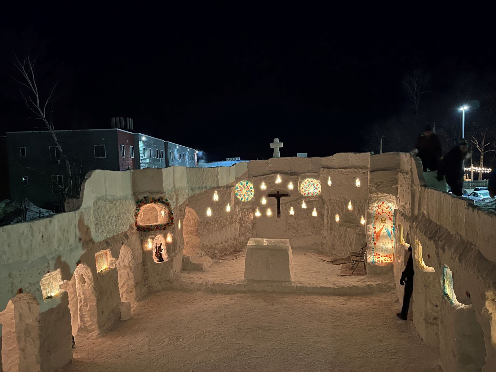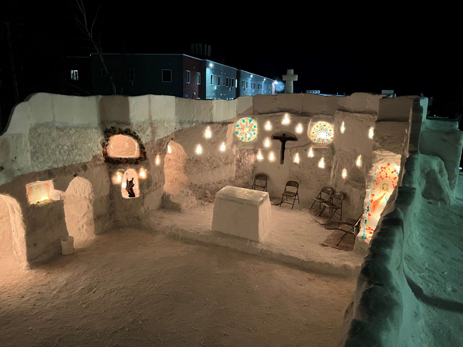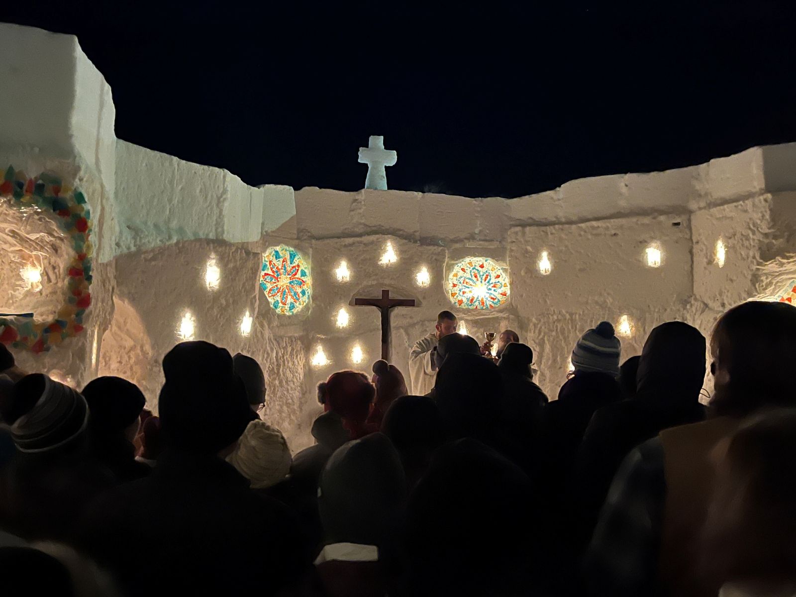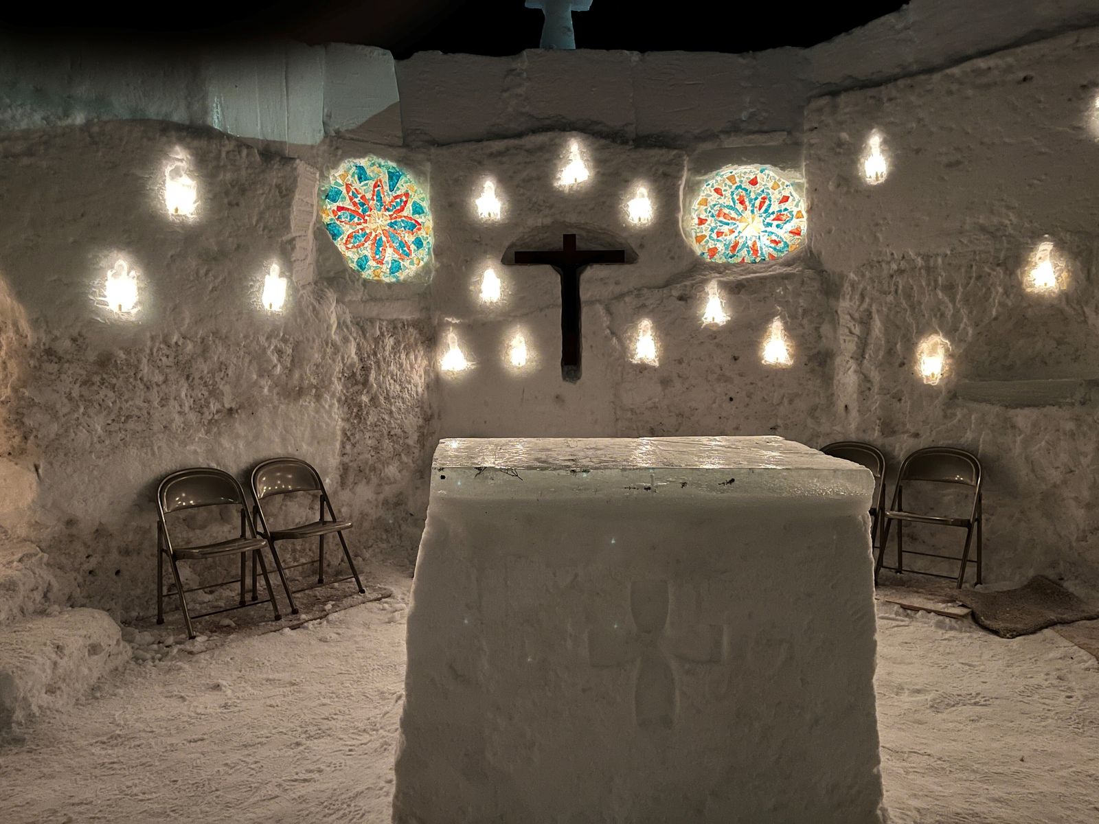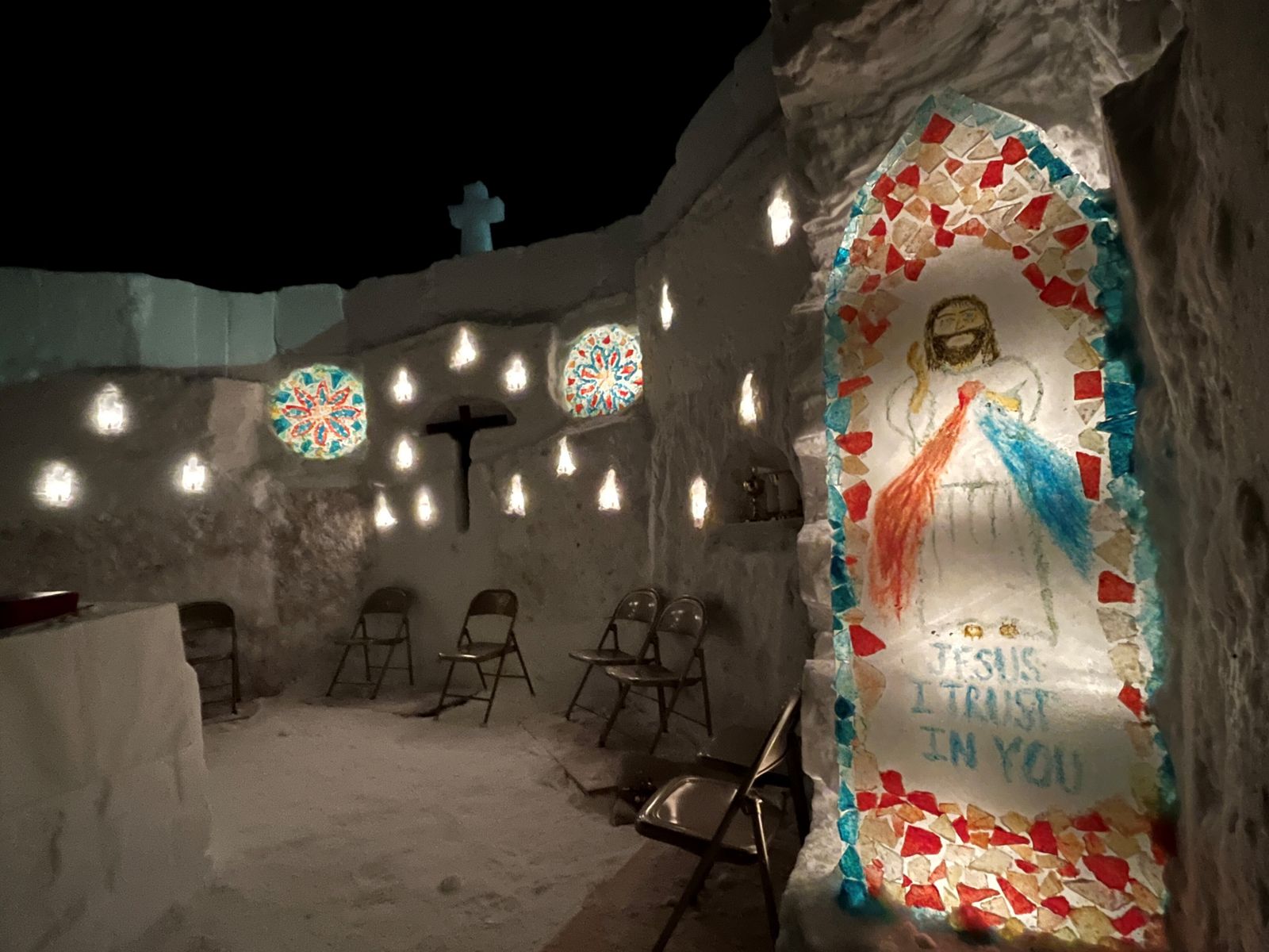 Each year, hundreds attend a handful of special Masses in the chapel, built by an army of student volunteers. This year's chapel included "stained ice windows," a side altar dedicated to the Blessed Virgin Mary, and various inlets and crosses embedded in the snow.