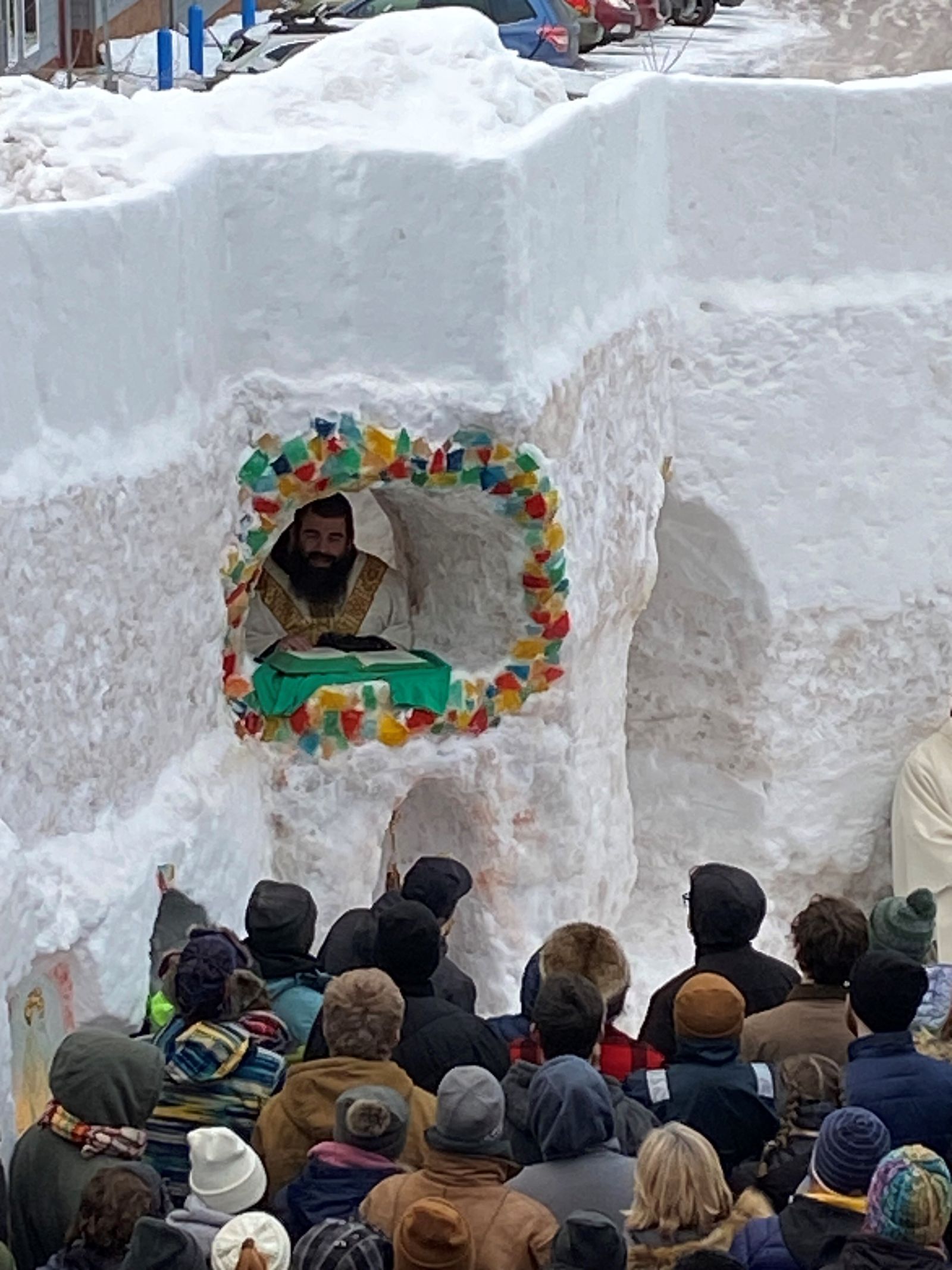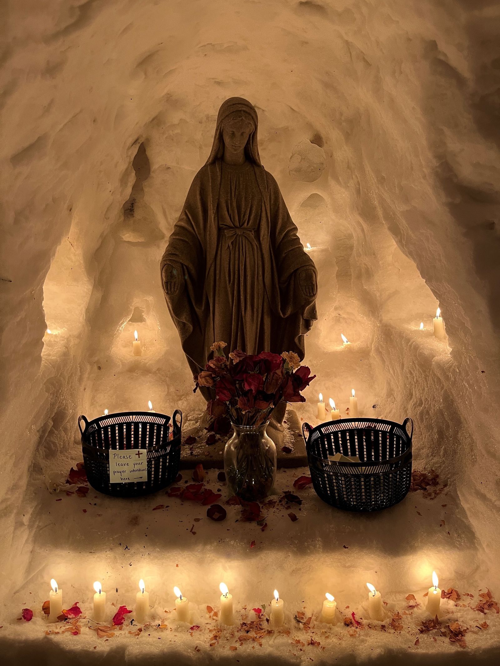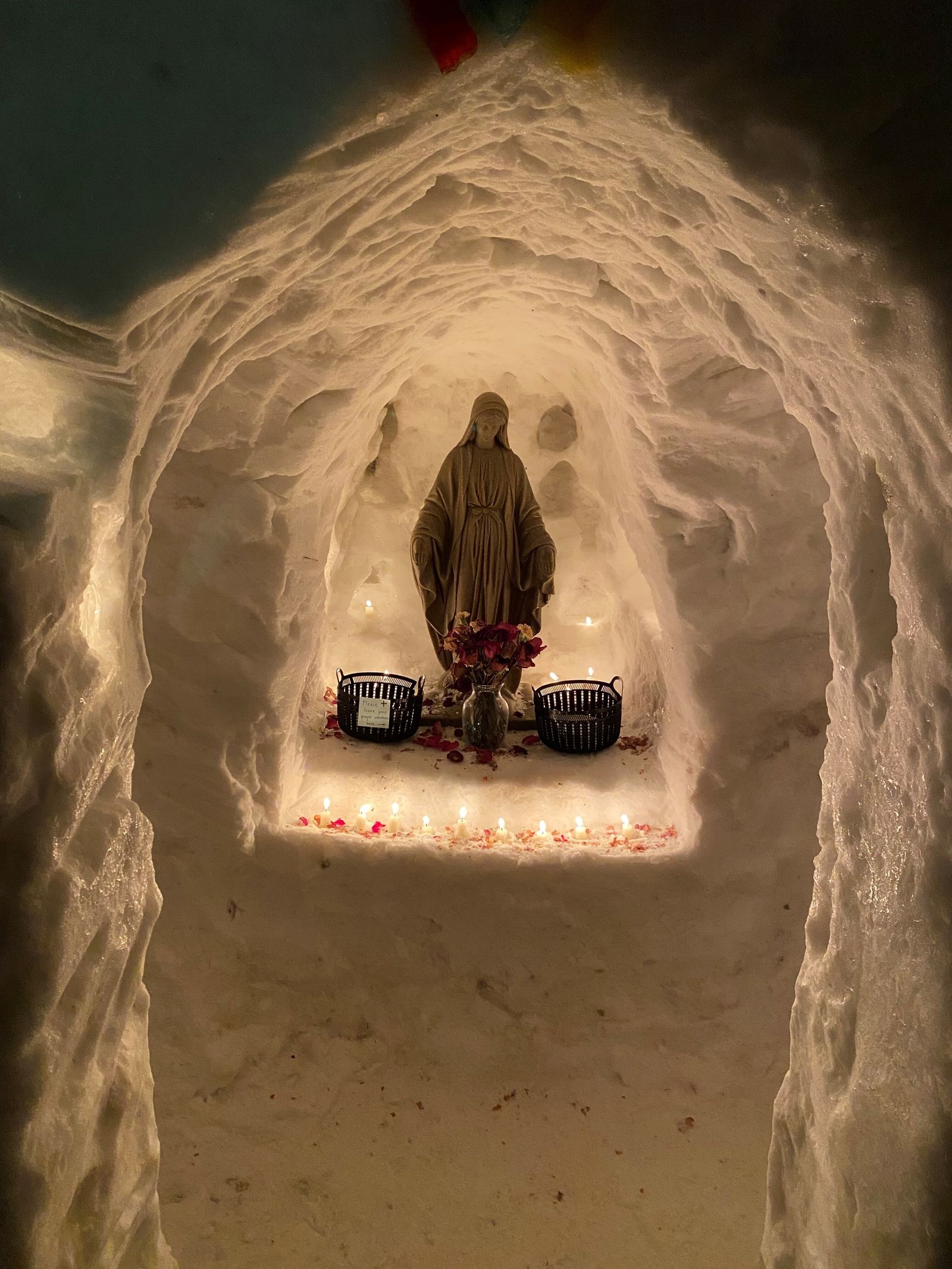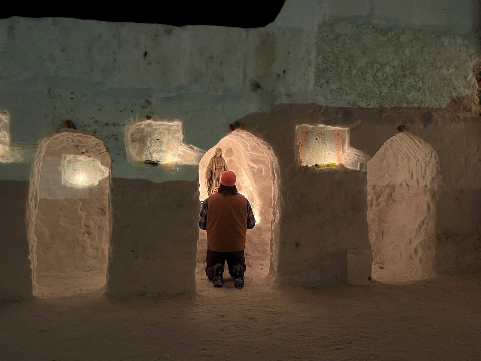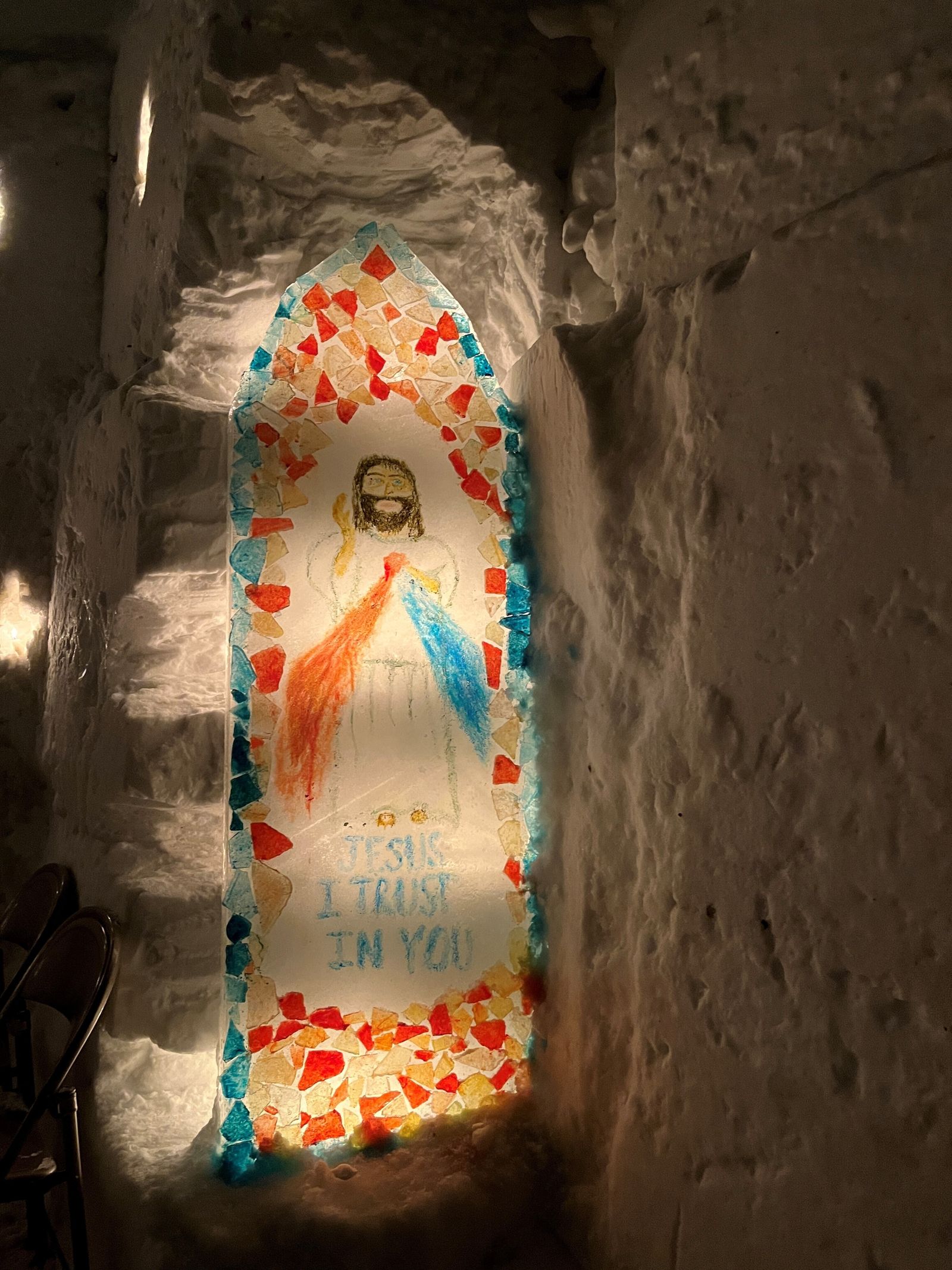 Each year, hundreds attend a handful of special Masses in the chapel, built by an army of student volunteers. This year's chapel included "stained ice windows," a side altar dedicated to the Blessed Virgin Mary, and various inlets and crosses embedded in the snow.