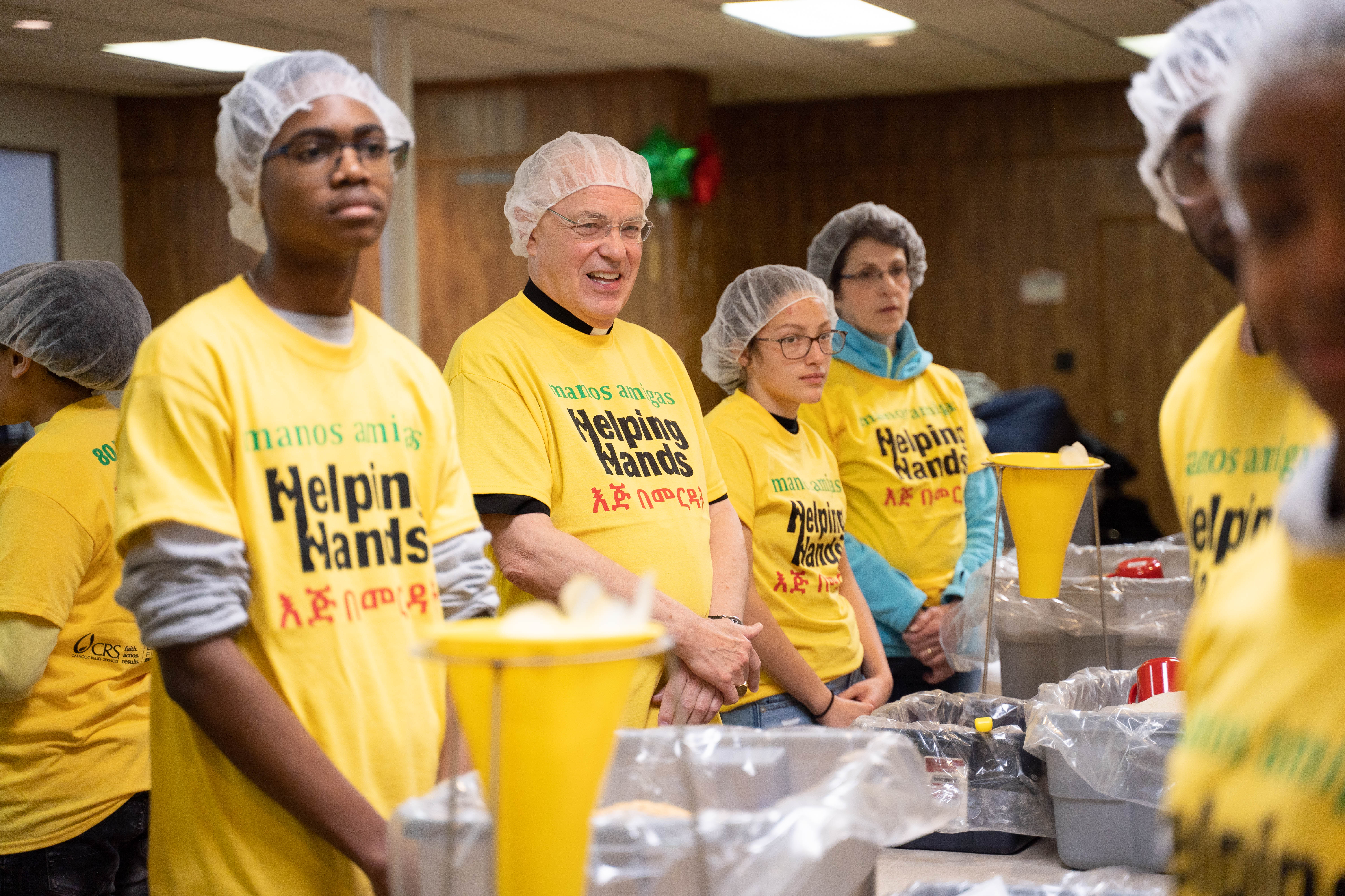 The event was part of an effort supported by Auxiliary Bishop Donald Hanchon in association with Catholic Relief Services' Helping Hands program, gathering young volunteers to help package the dry goods for distribution.