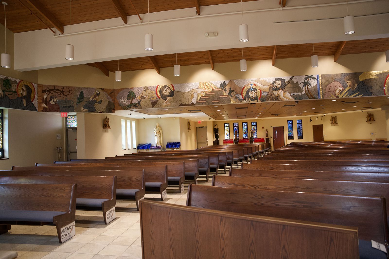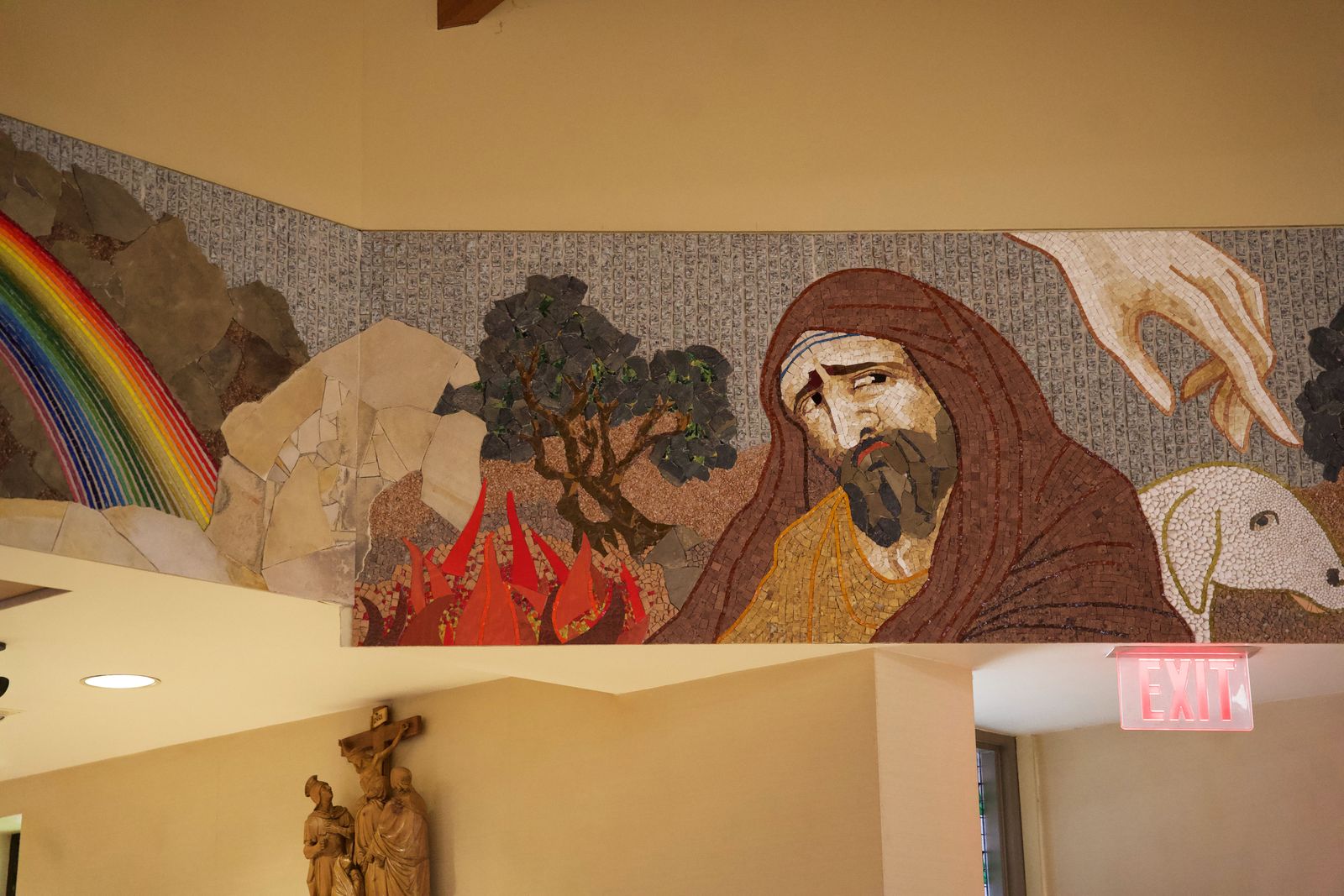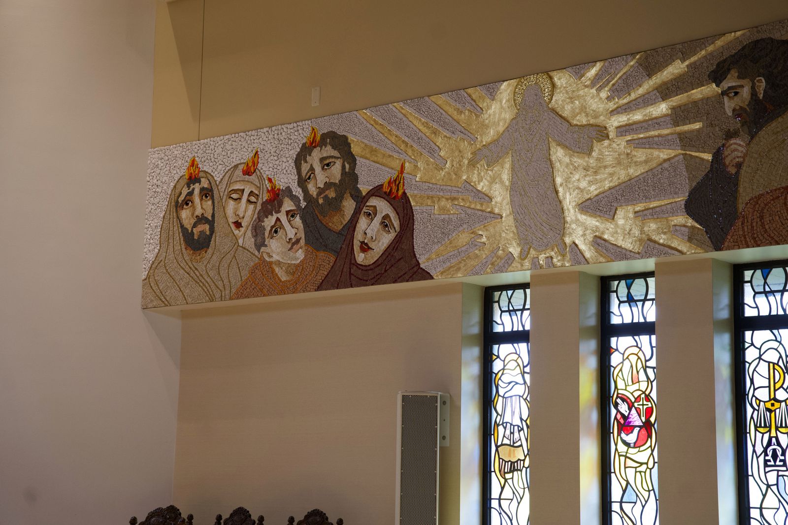 It took three years of going back and forth to complete the plan for the mosaic, which wraps around the sanctuary and walls of the church's drop-ceiling, telling the story of salvation from the creation of Adam and Eve to the coming of the Holy Spirit at Pentecost.