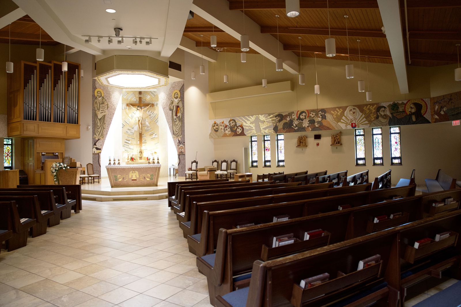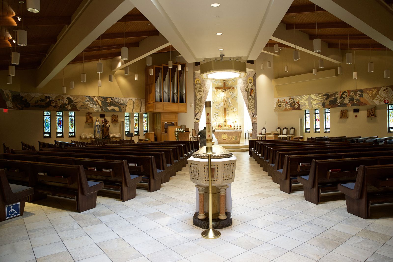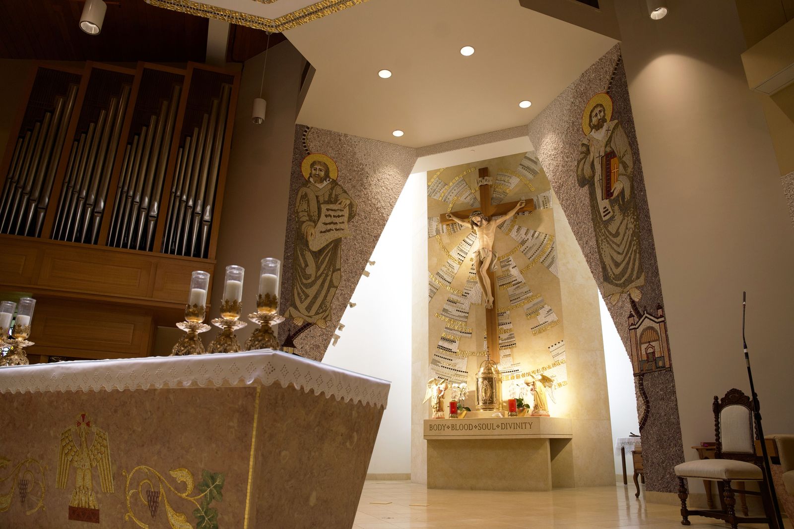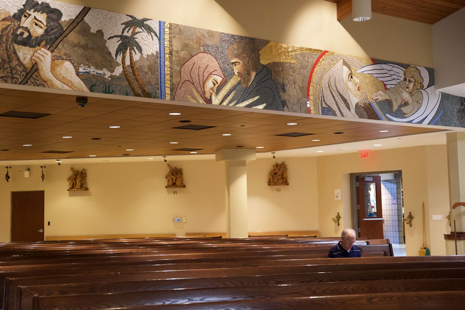 It took three years of going back and forth to complete the plan for the mosaic, which wraps around the sanctuary and walls of the church's drop-ceiling, telling the story of salvation from the creation of Adam and Eve to the coming of the Holy Spirit at Pentecost.