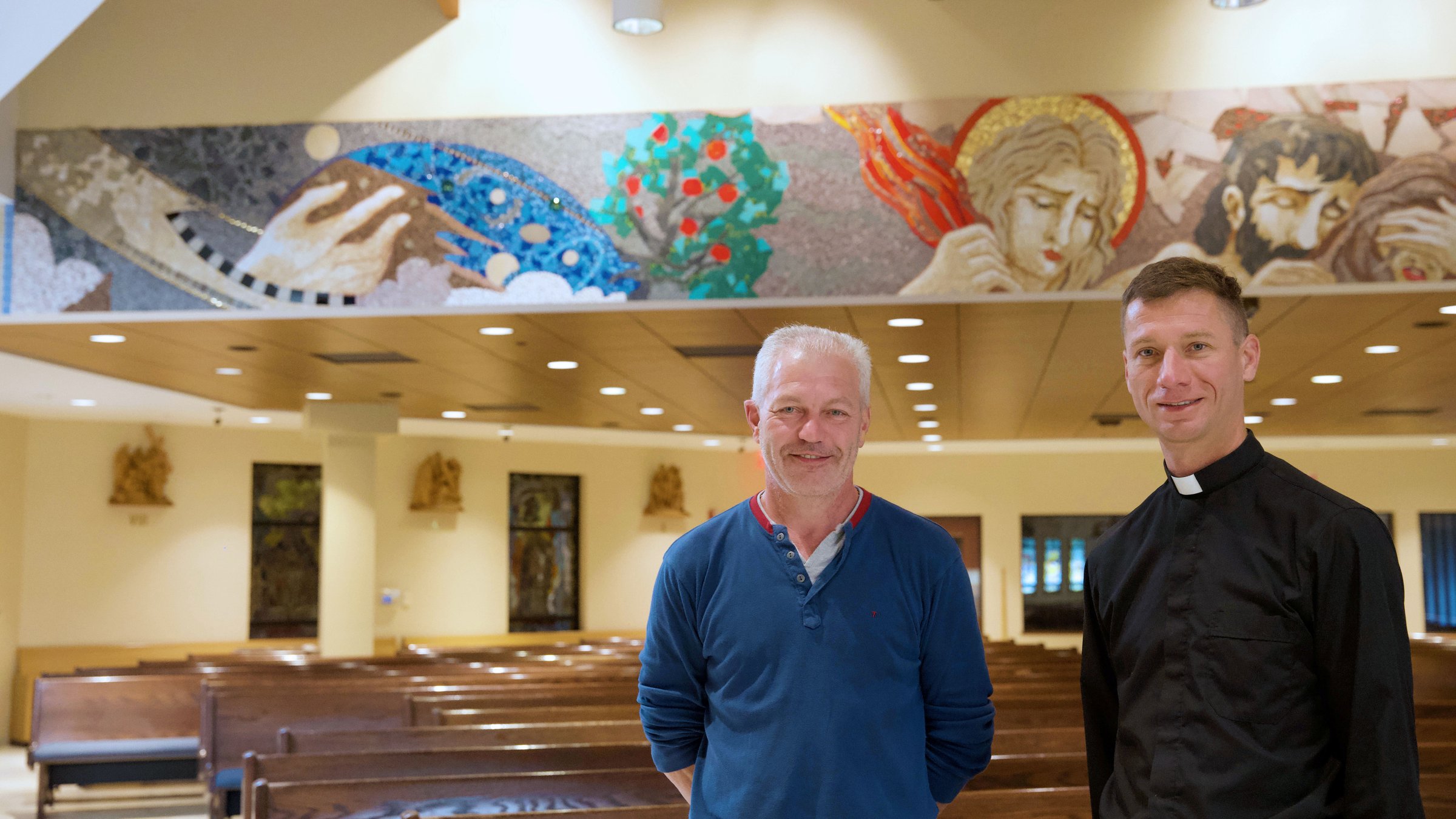Recently, the parish's current priest, Fr. Libor Marek, and his associate, Fr. Juraj Nuota, decided to revisit the vision. Through a connection back home in Slovakia, they contacted Fr. Kamil Drab, a self-described "artist priest," and commissioned a new mosaic for the church.