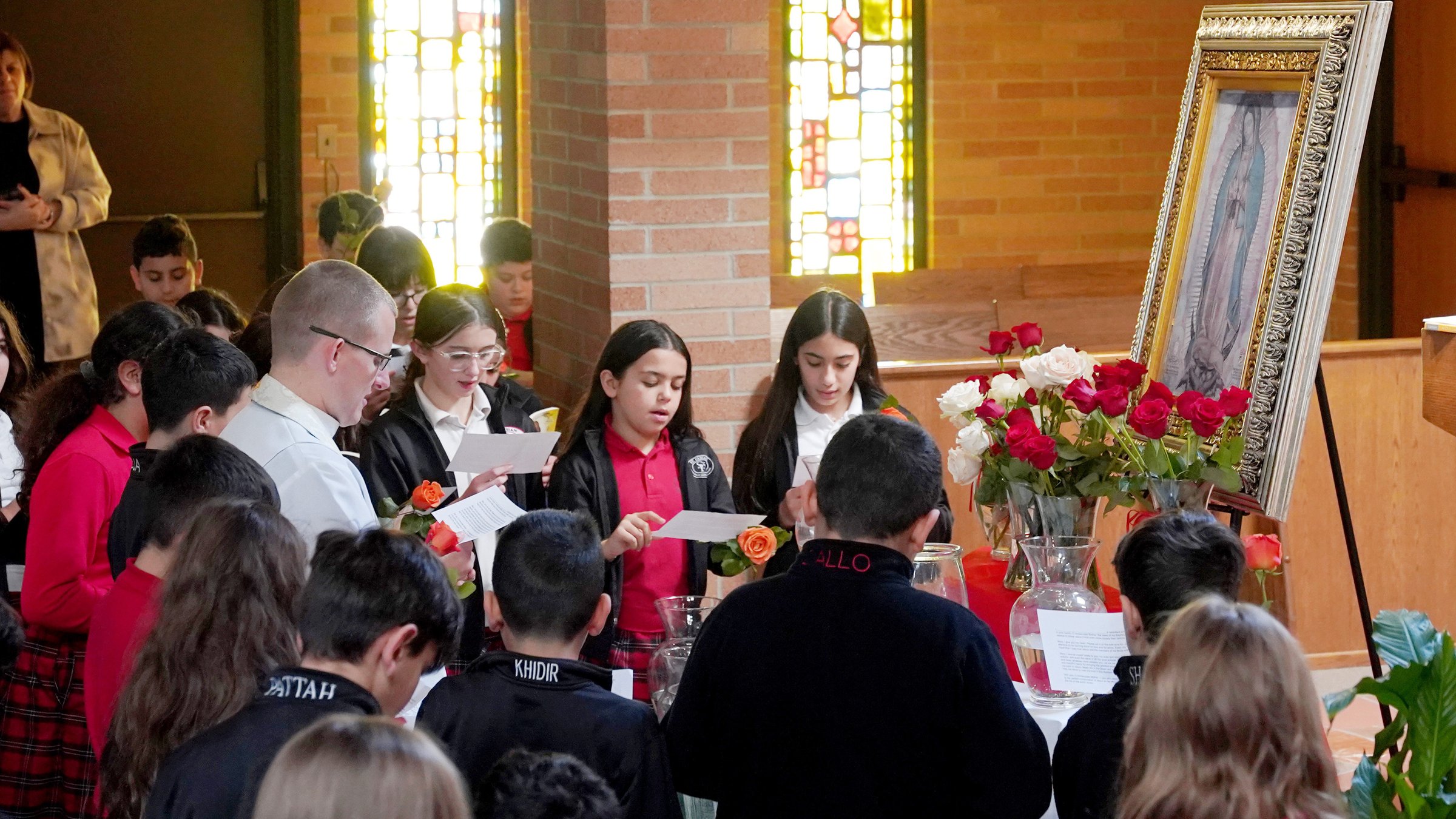 On the feast day, Fr. Kurt gathered the students in the chapel to kneel before the Blessed Sacrament and an image of Our Lady of Guadalupe. Before they read the consecration prayer and placed roses before her image, Fr. Kurt reminded students that Mary is, in fact, a mother to each of them.