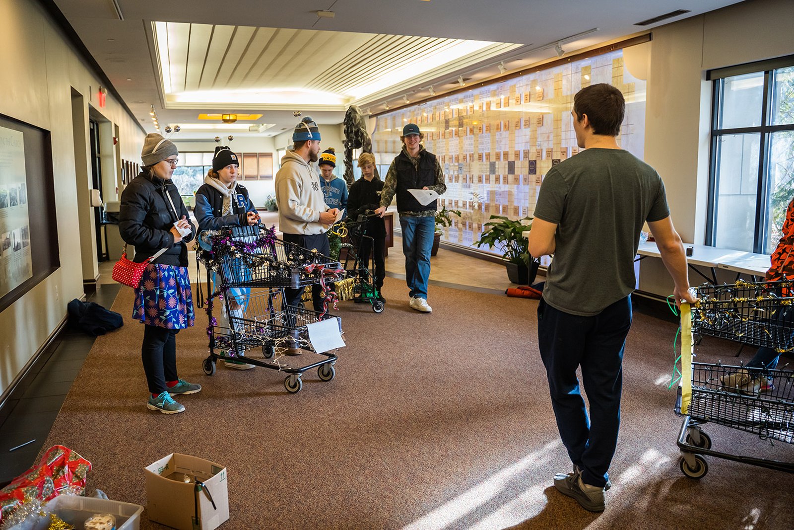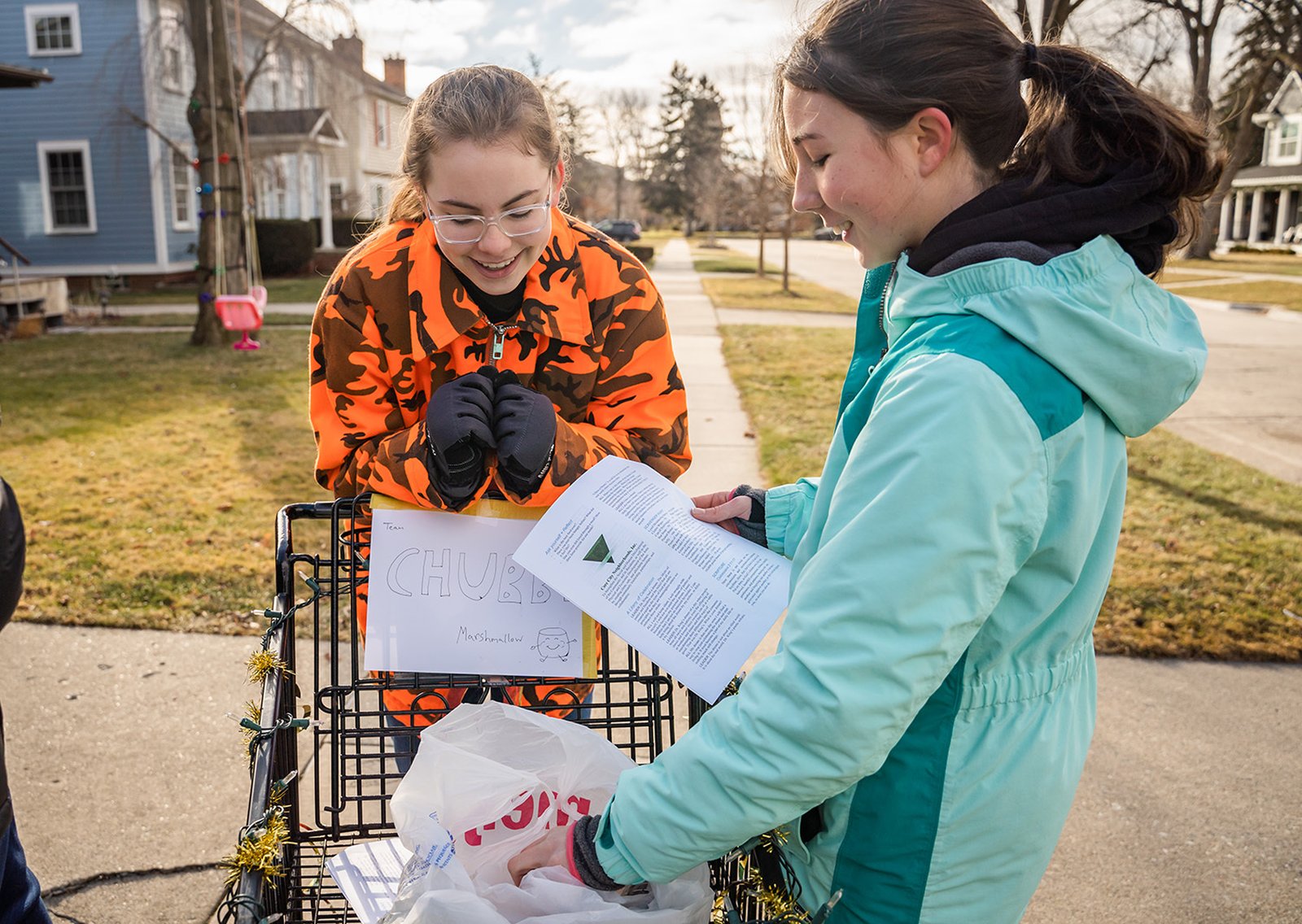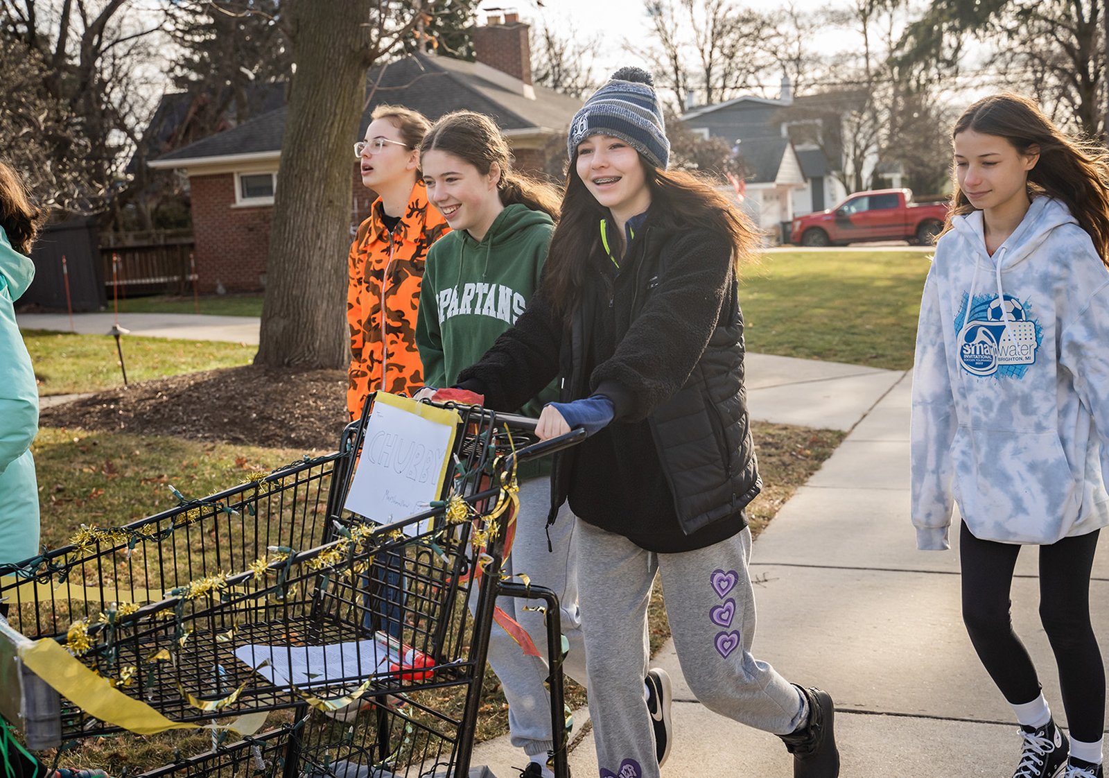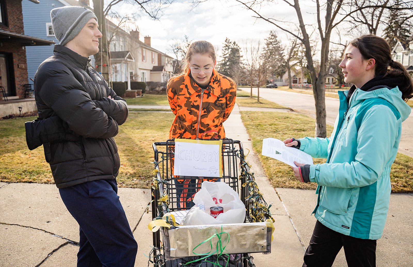 Teenagers from the National Shrine of the Little Flower Basilica in Royal Oak prepare to canvas the neighborhood with grocery carts looking for "scavenger hunt" items to benefit a shelter in Detroit as part of the Archdiocese of Detroit's annual Martin Luther King Jr. Day of Service on Jan. 14. (Valaurian Waller | Detroit Catholic)