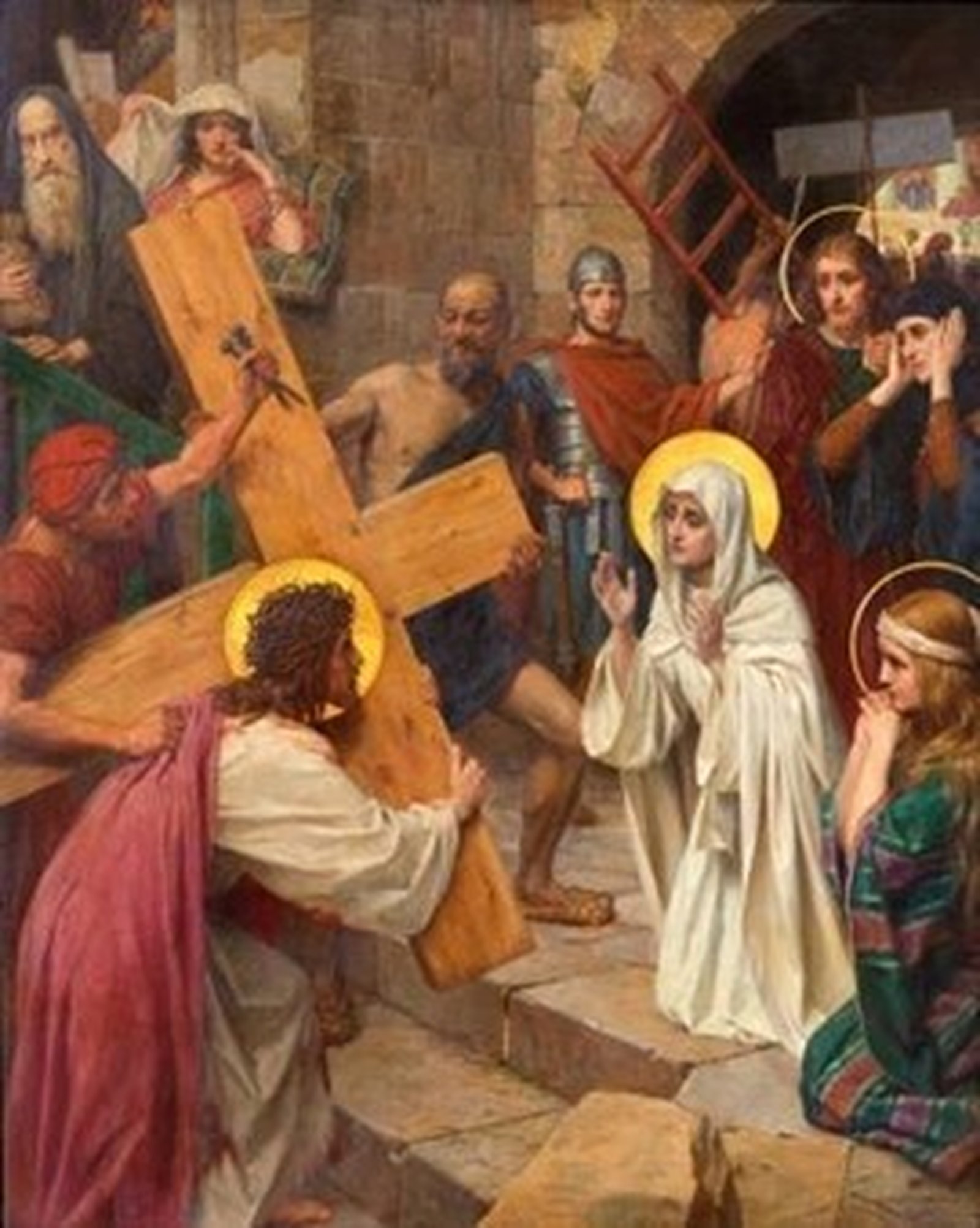 4. I grieve for you, O Mary most sorrowful, in the consternation of your heart at meeting Jesus as He carried His Cross. Dear Mother, by your heart so troubled, obtain for me the virtue of patience and the gift of fortitude. Hail Mary…