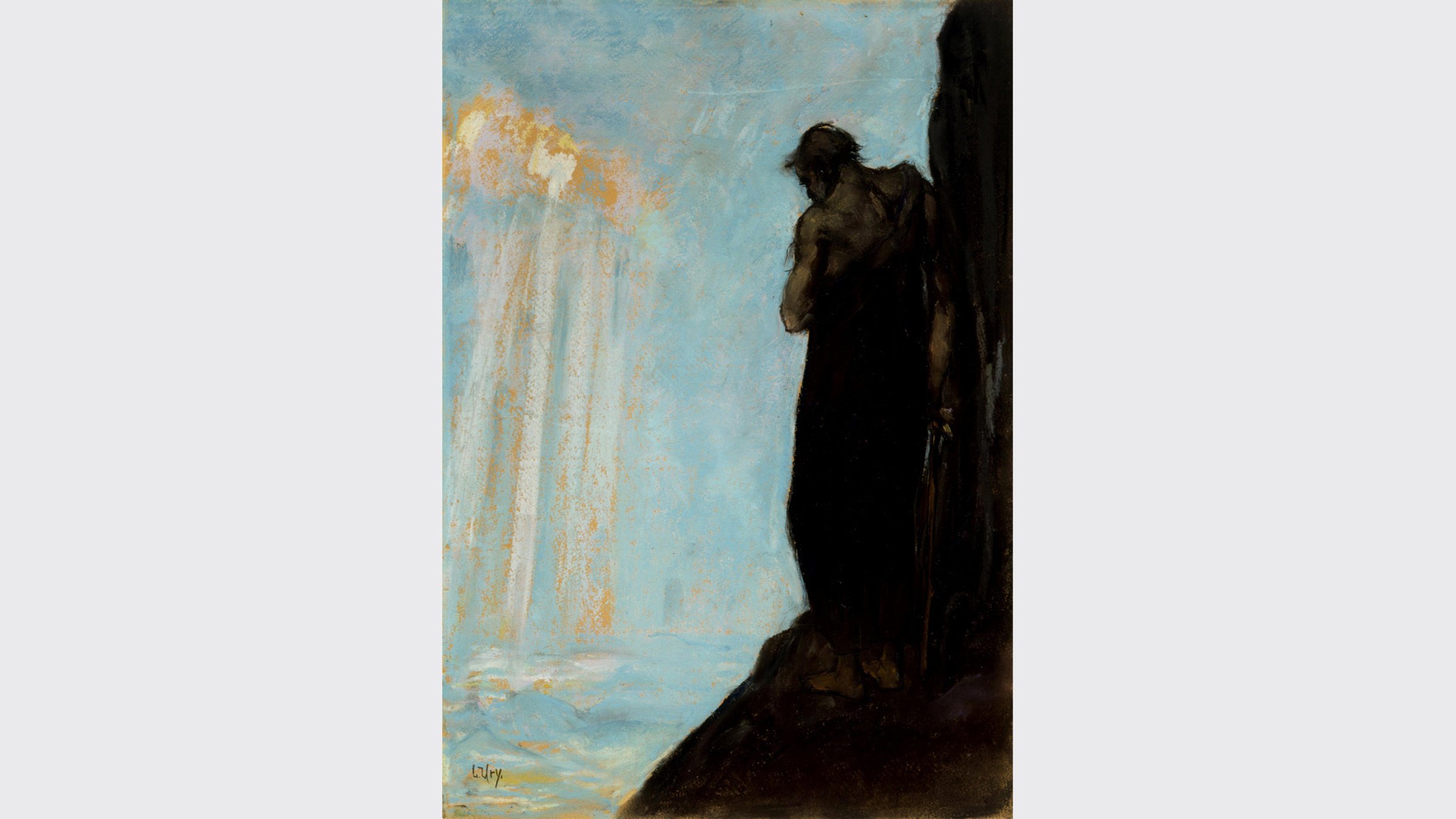 At about this time in the semester, my students study the person of Moses. I love to show them a pastel drawing by German Jewish artist Lesser Ury, Moses Looks upon the Promised Land. The canvas is split cleanly between light on the left and darkness on the right. On the right, Moses, with his back to us, stands balanced upon a narrow ledge, his right side leaning against the rockface of Mt. Nebo. His head is bent, perhaps in sadness, perhaps better to see what lies below. What lies below and beyond him is a bright skyscape, punctuated by a burst of orange and white whose rays travel downward through the azure expanse.