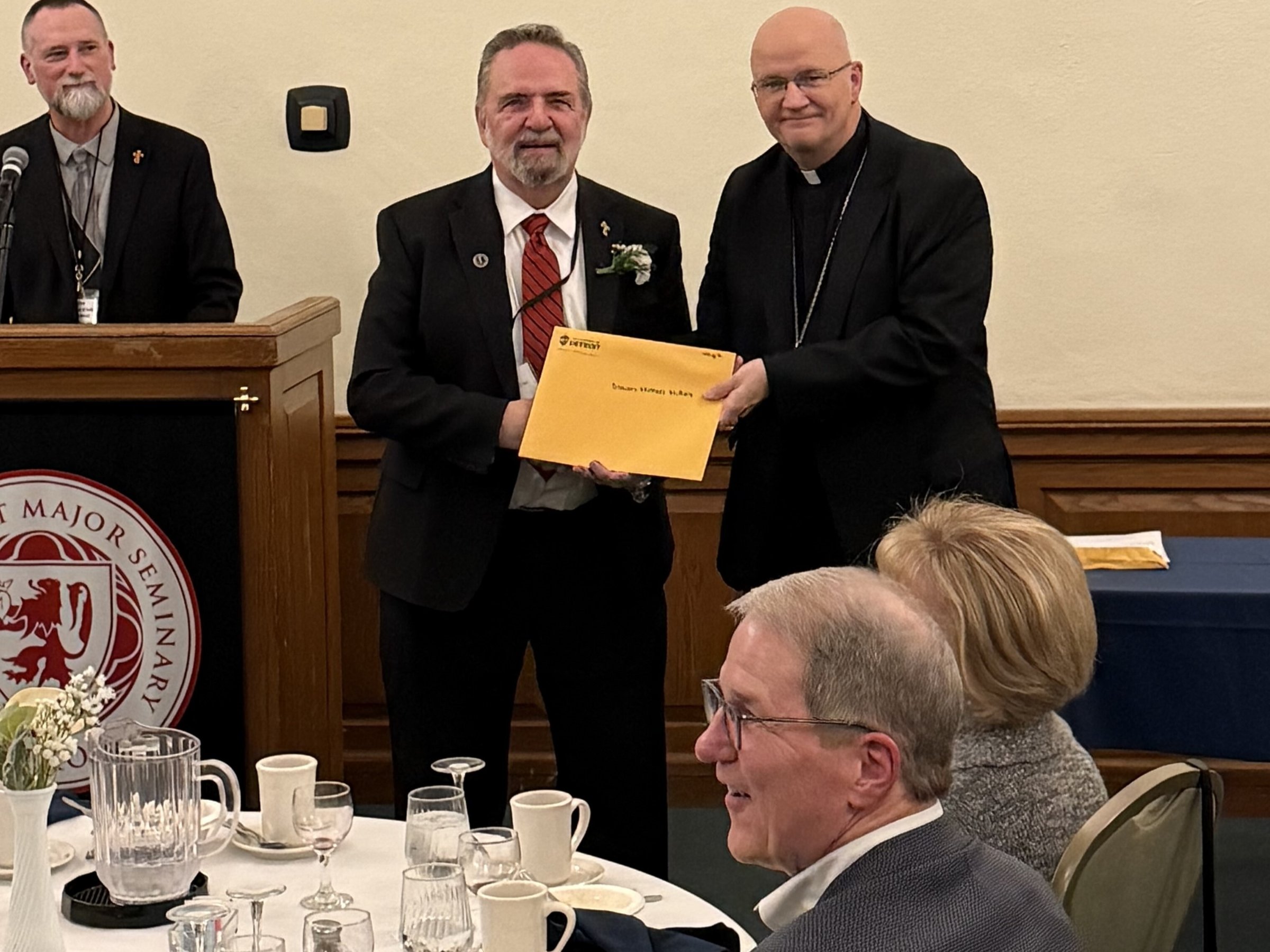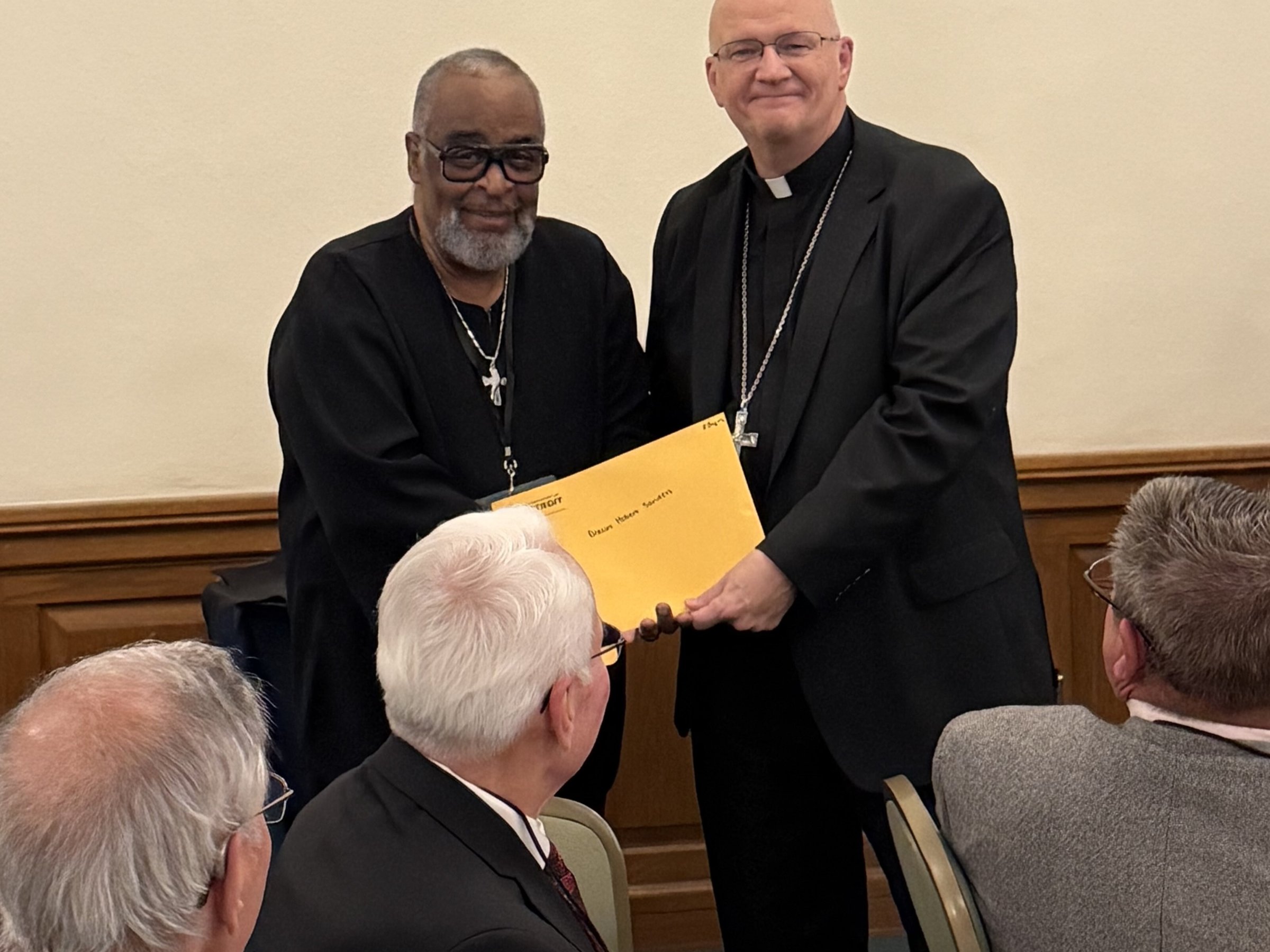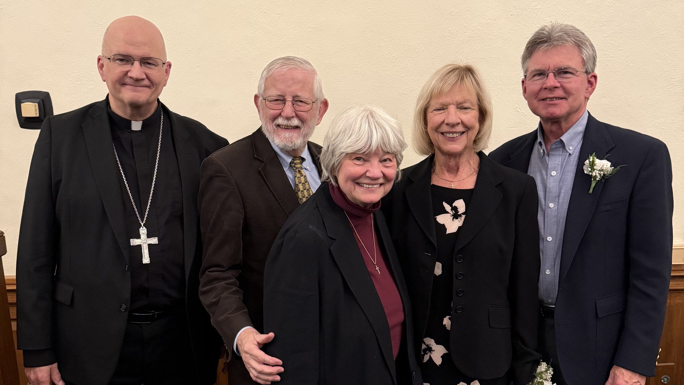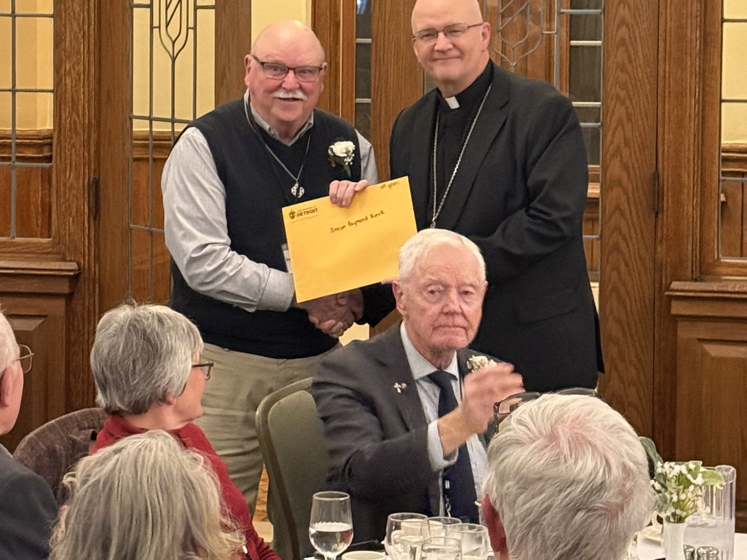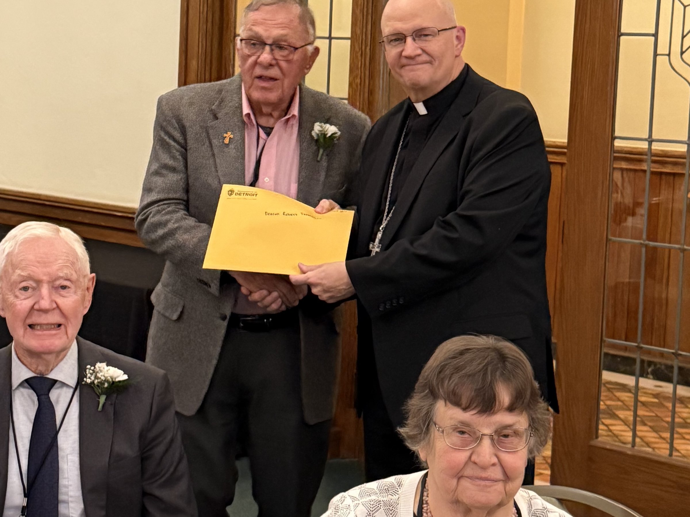 Archbishop Edward J. Weisenburger, left, is pictured with Deacon Timothy Pilon and his wife, Claudette Pilon, and Colleen Misiak and her husband, Deacon Ric Misiak, during a celebration for permanent deacon jubilarians Oct. 26 at Sacred Heart Major Seminary in Detroit. Deacon Pilon and Deacon Misiak are both celebrating 35 years as deacons as part of the 2025 class of deacon jubilarians.