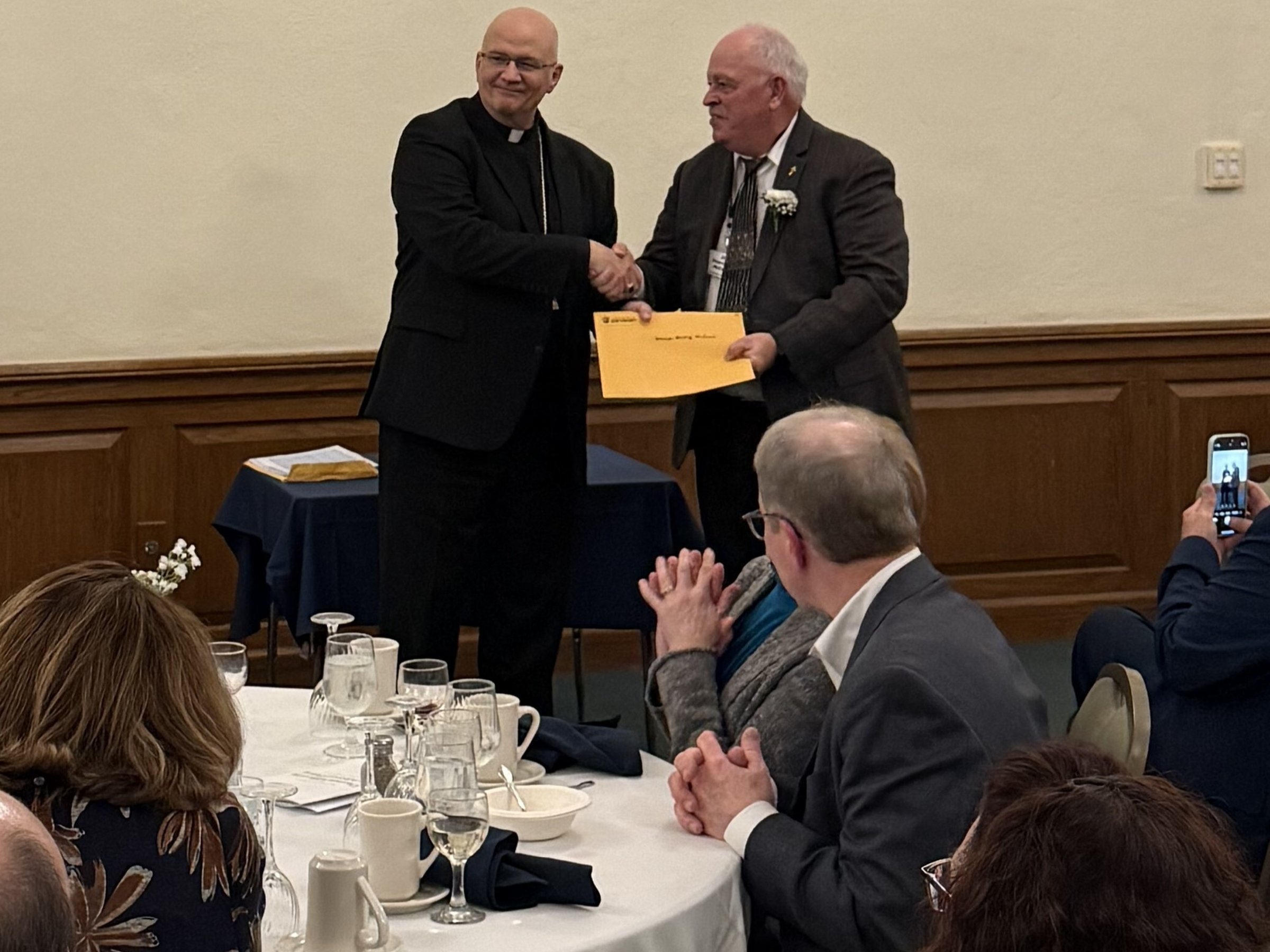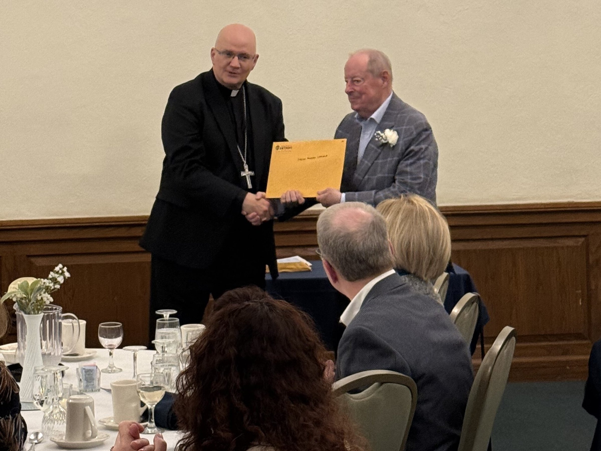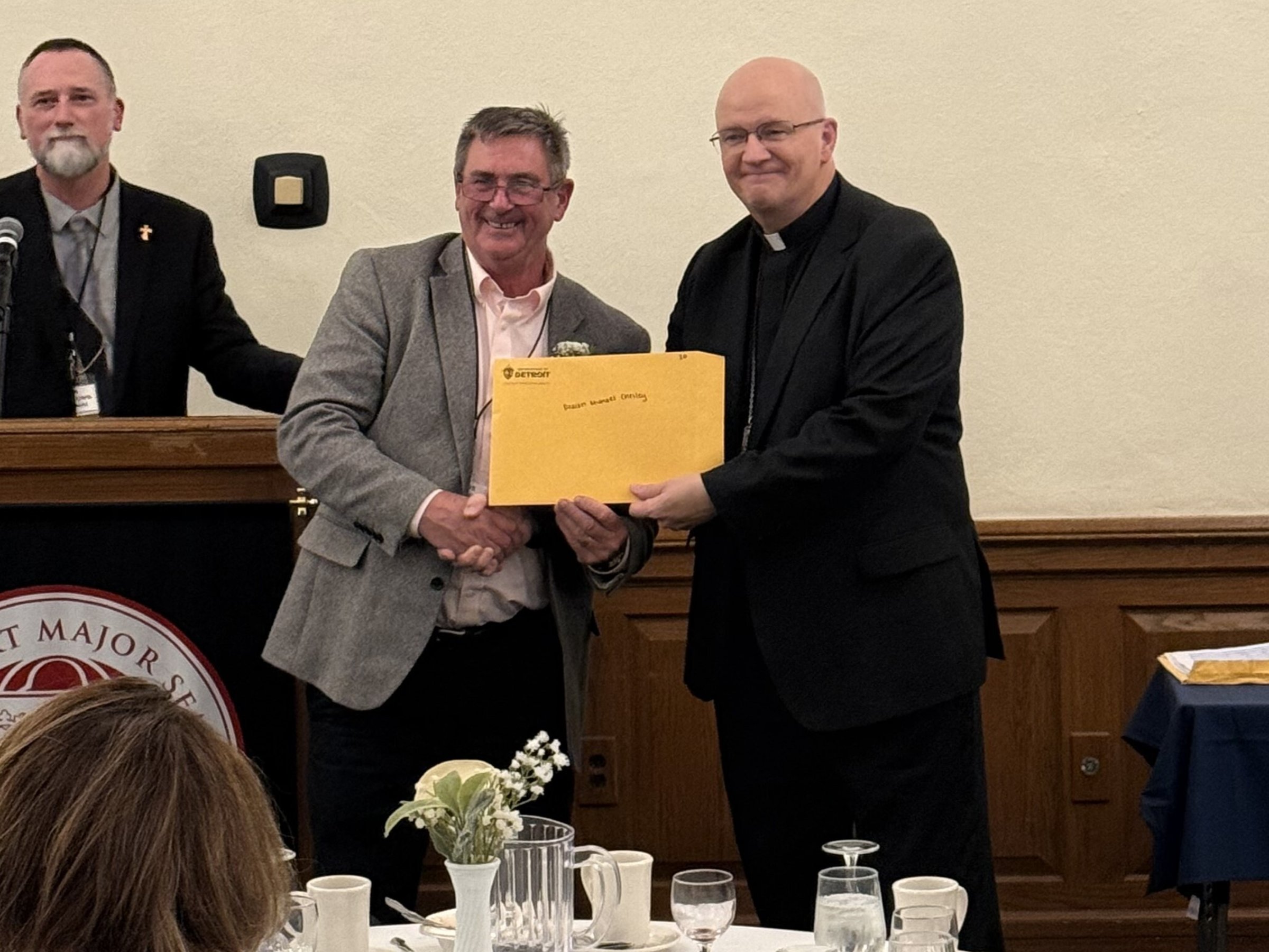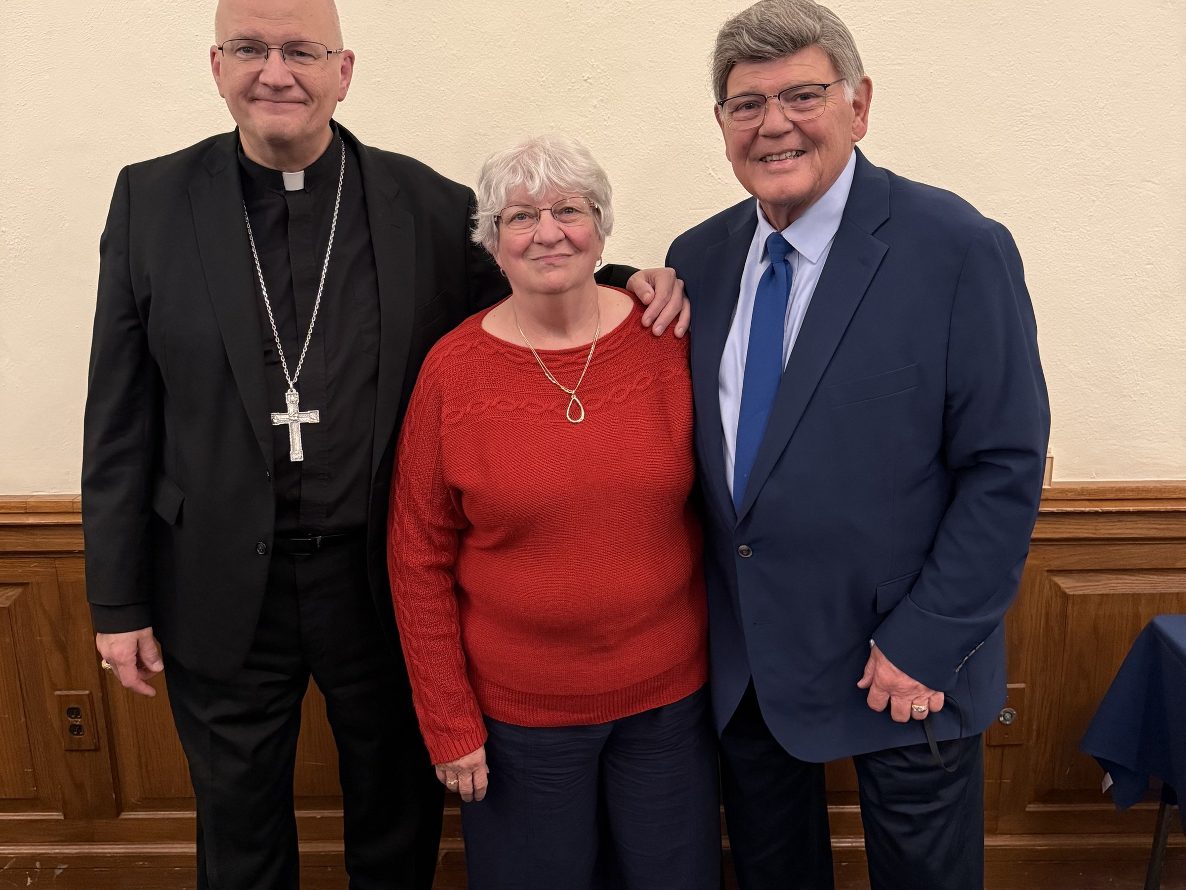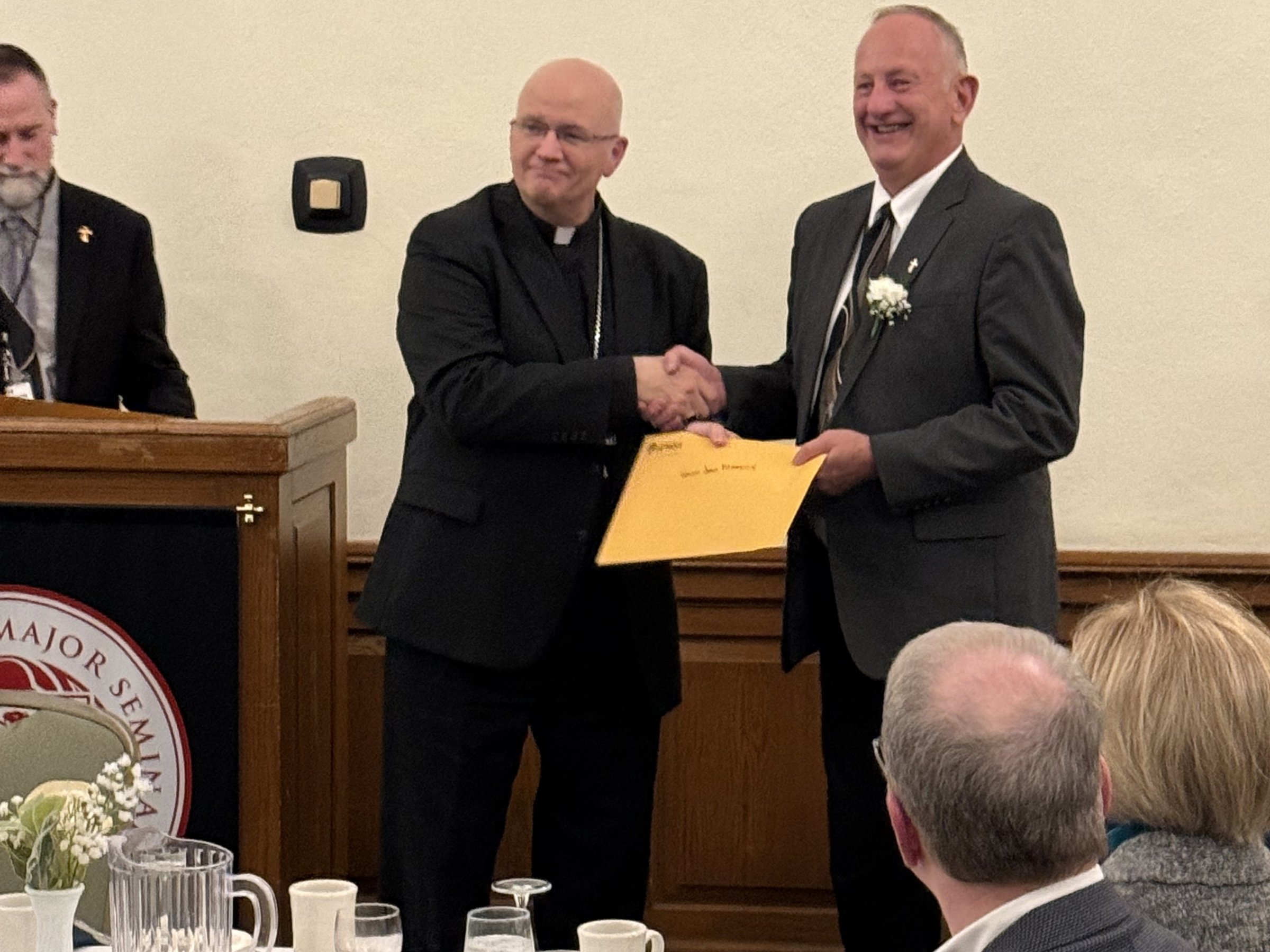 Archbishop Edward J. Weisenburger, left, is pictured with Deacon Timothy Pilon and his wife, Claudette Pilon, and Colleen Misiak and her husband, Deacon Ric Misiak, during a celebration for permanent deacon jubilarians Oct. 26 at Sacred Heart Major Seminary in Detroit. Deacon Pilon and Deacon Misiak are both celebrating 35 years as deacons as part of the 2025 class of deacon jubilarians.