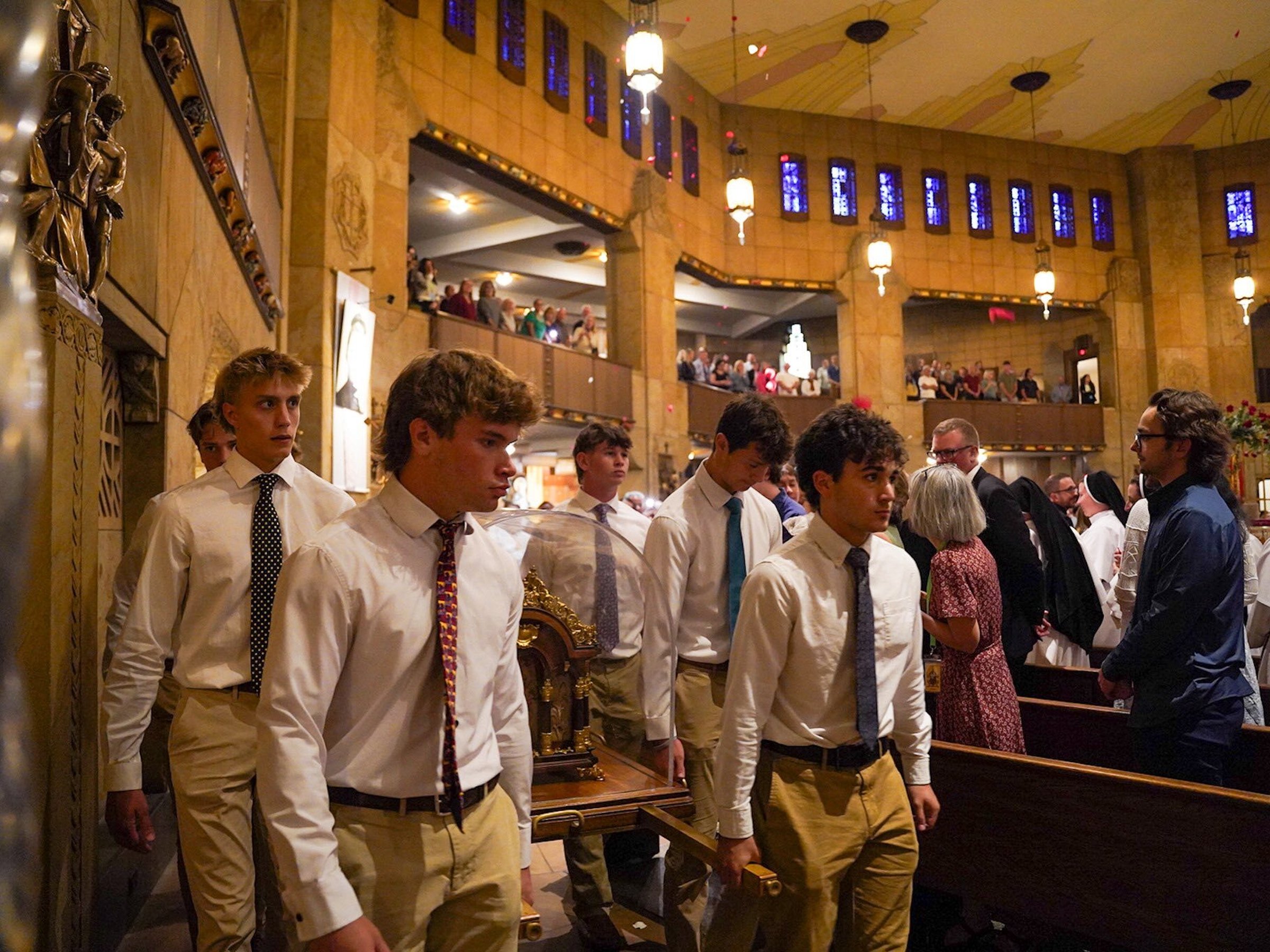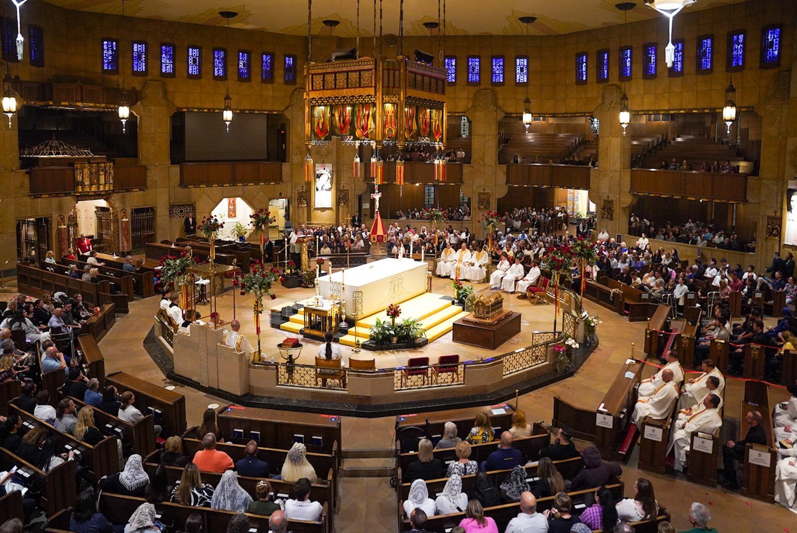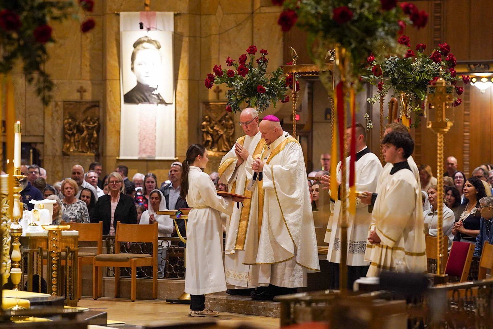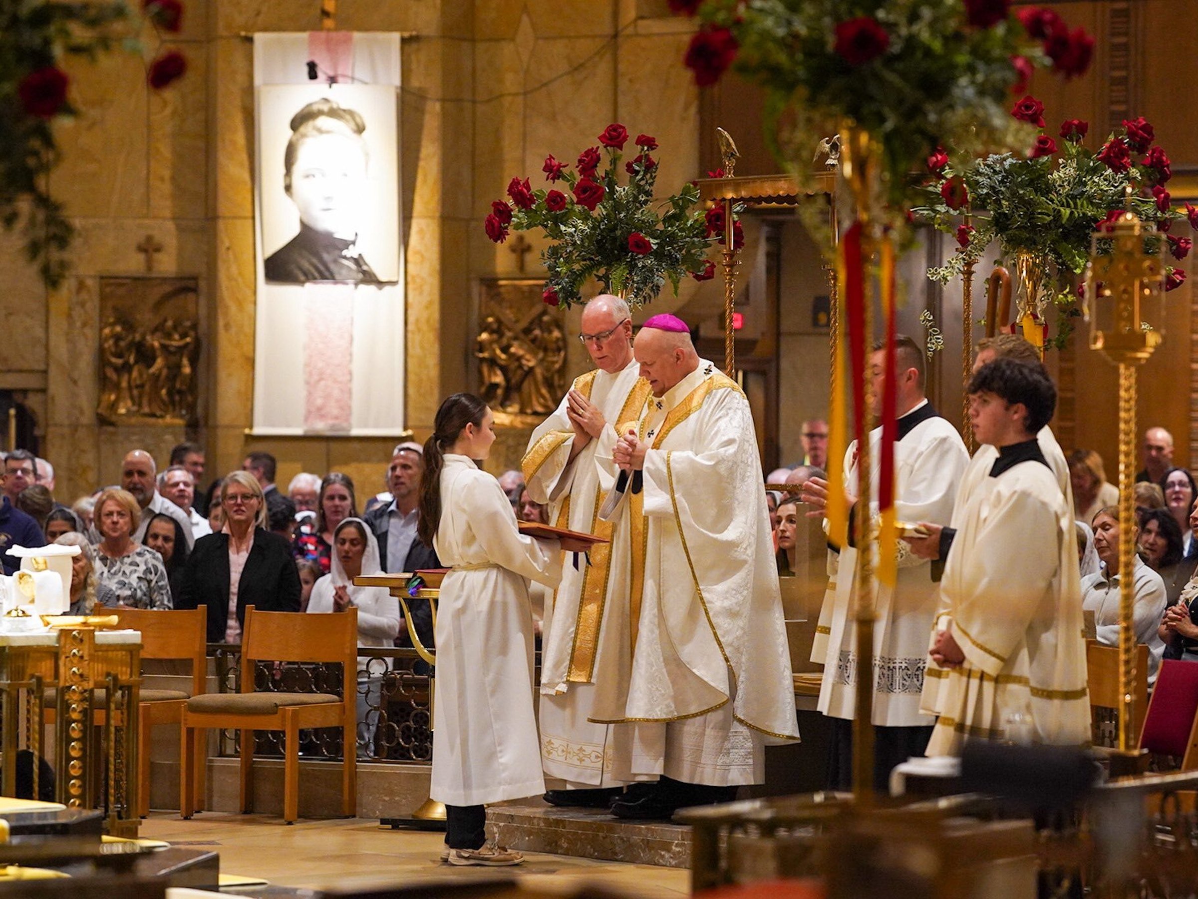 On Wednesday, Oct. 1, Archbishop Weisenburger celebrated a special feast day Mass in honor of St. Therese of Lisieux at her namesake parish, the National Shrine of the Little Flower Basilica in Royal Oak. The basilica is hosting the first stop of a nationwide tour of St. Therese of Lisieux's relics, which are available for veneration by the faithful until Oct. 8. Before Mass, Archbishop Weisenburger visited with clergy, sacristans and servers at the parish, who each worked to make the feast day Mass special and inviting.