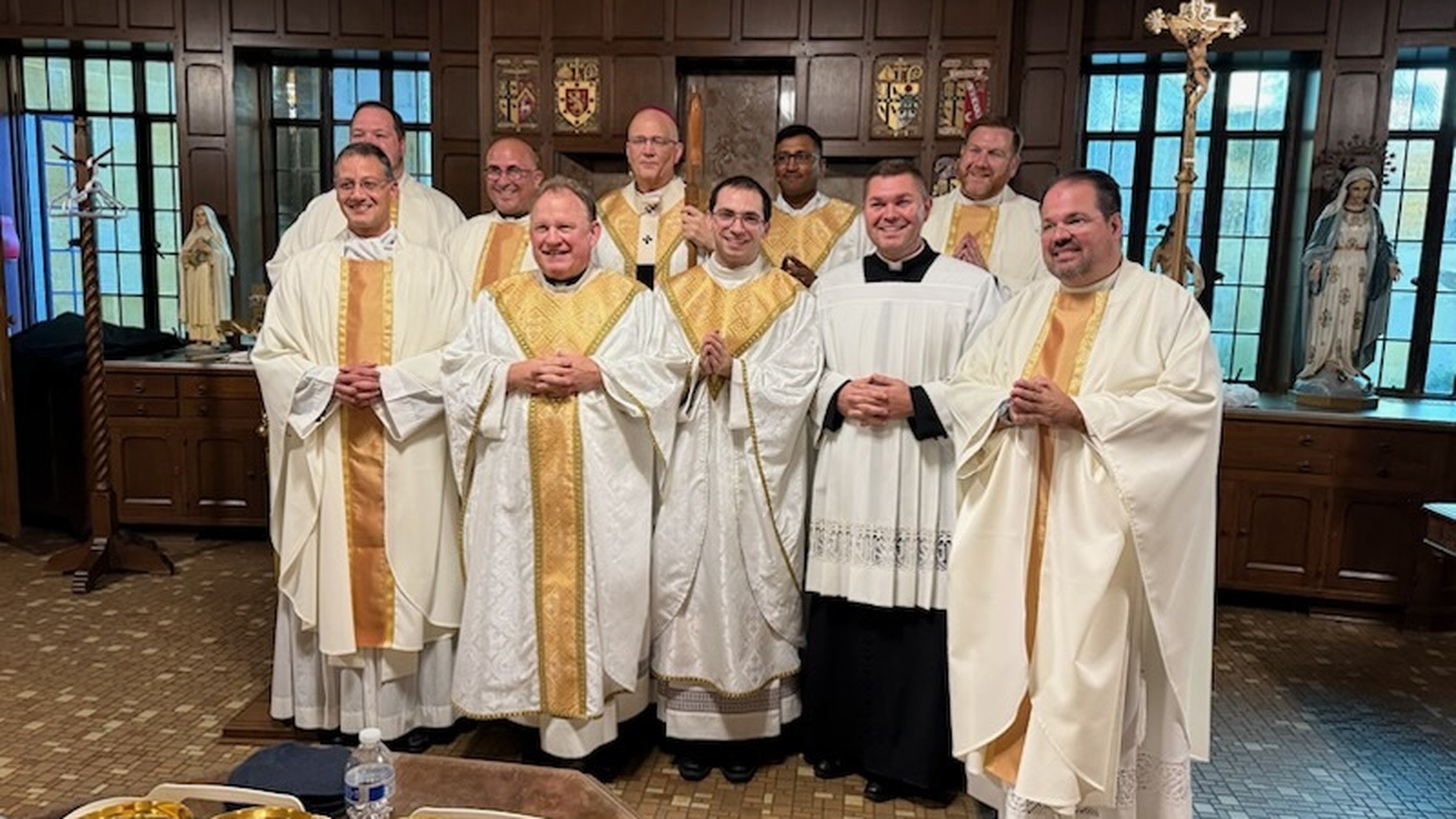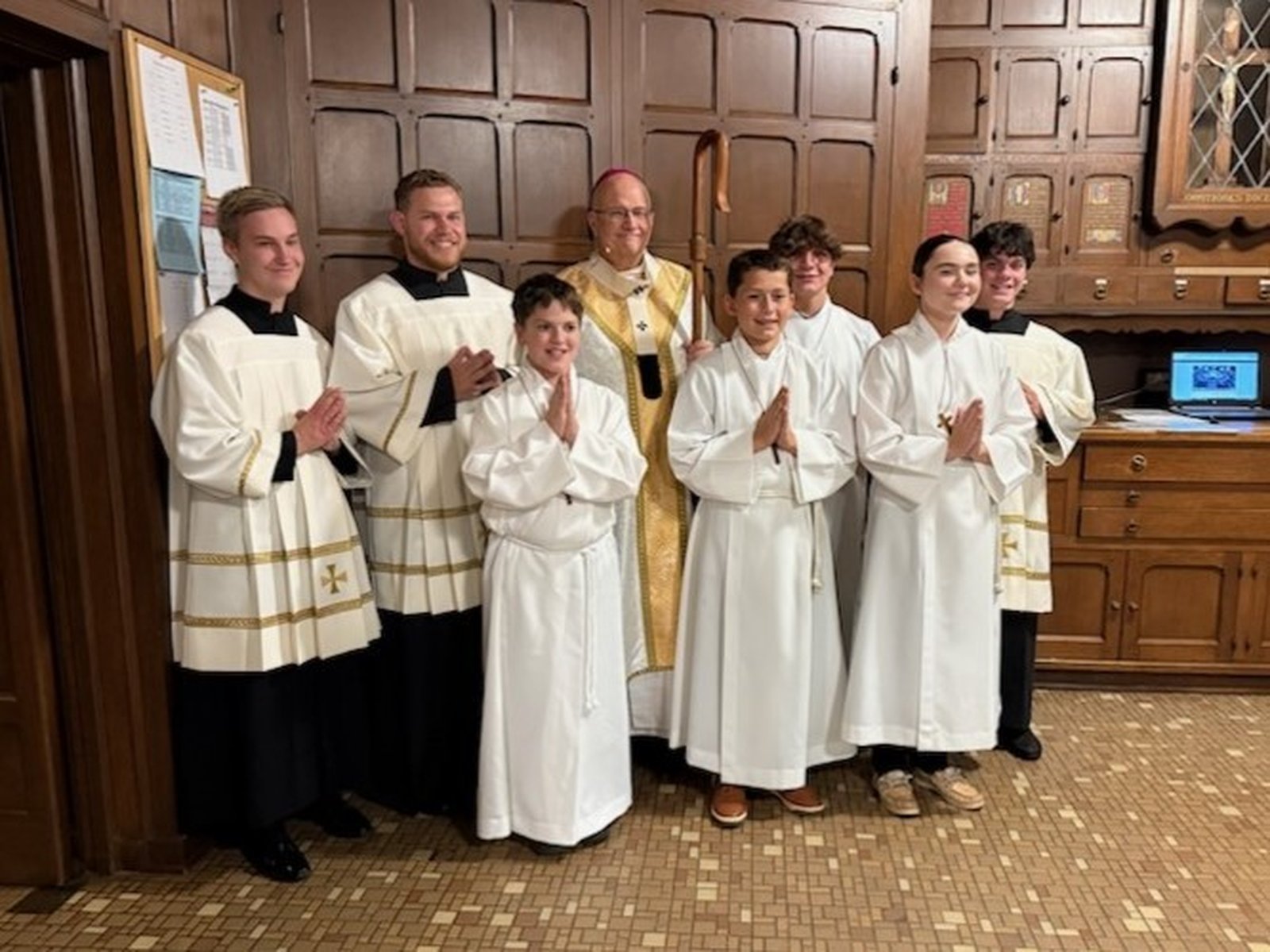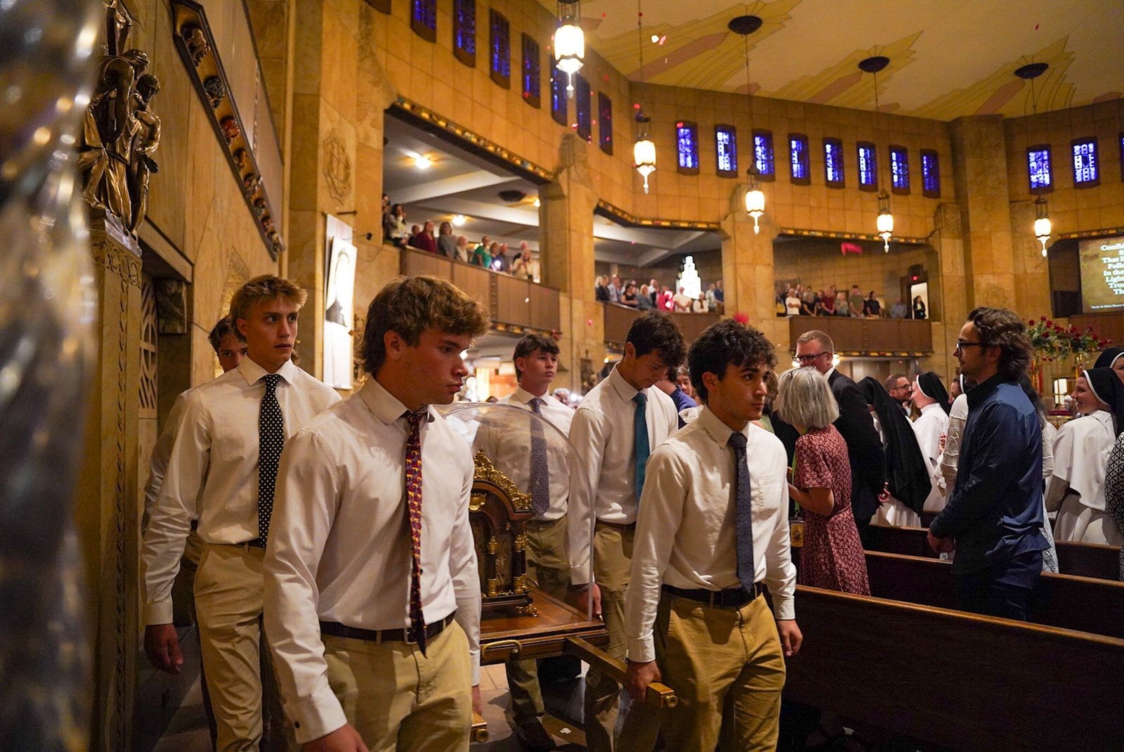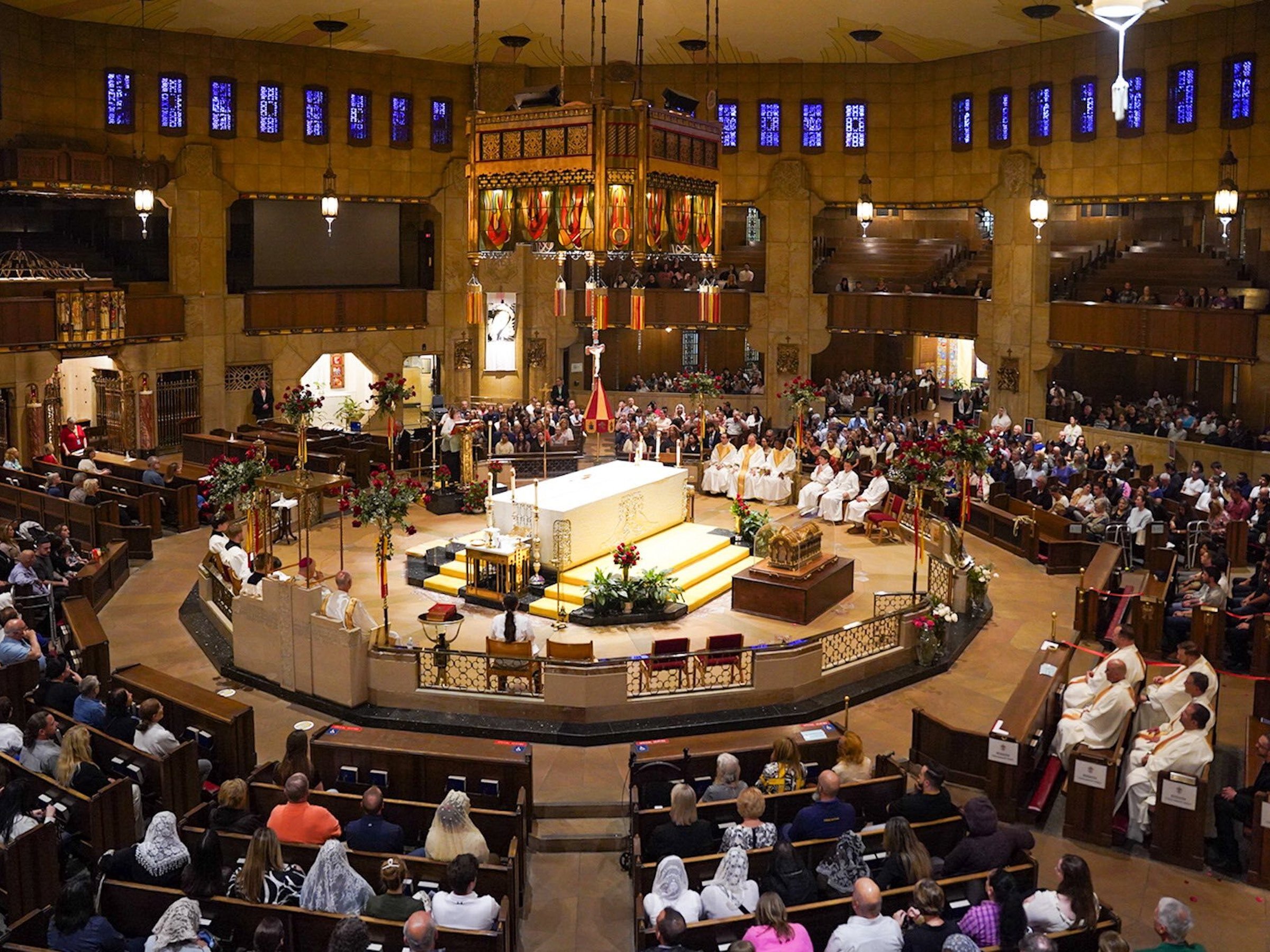 On Wednesday, Oct. 1, Archbishop Weisenburger celebrated a special feast day Mass in honor of St. Therese of Lisieux at her namesake parish, the National Shrine of the Little Flower Basilica in Royal Oak. The basilica is hosting the first stop of a nationwide tour of St. Therese of Lisieux's relics, which are available for veneration by the faithful until Oct. 8. Before Mass, Archbishop Weisenburger visited with clergy, sacristans and servers at the parish, who each worked to make the feast day Mass special and inviting.