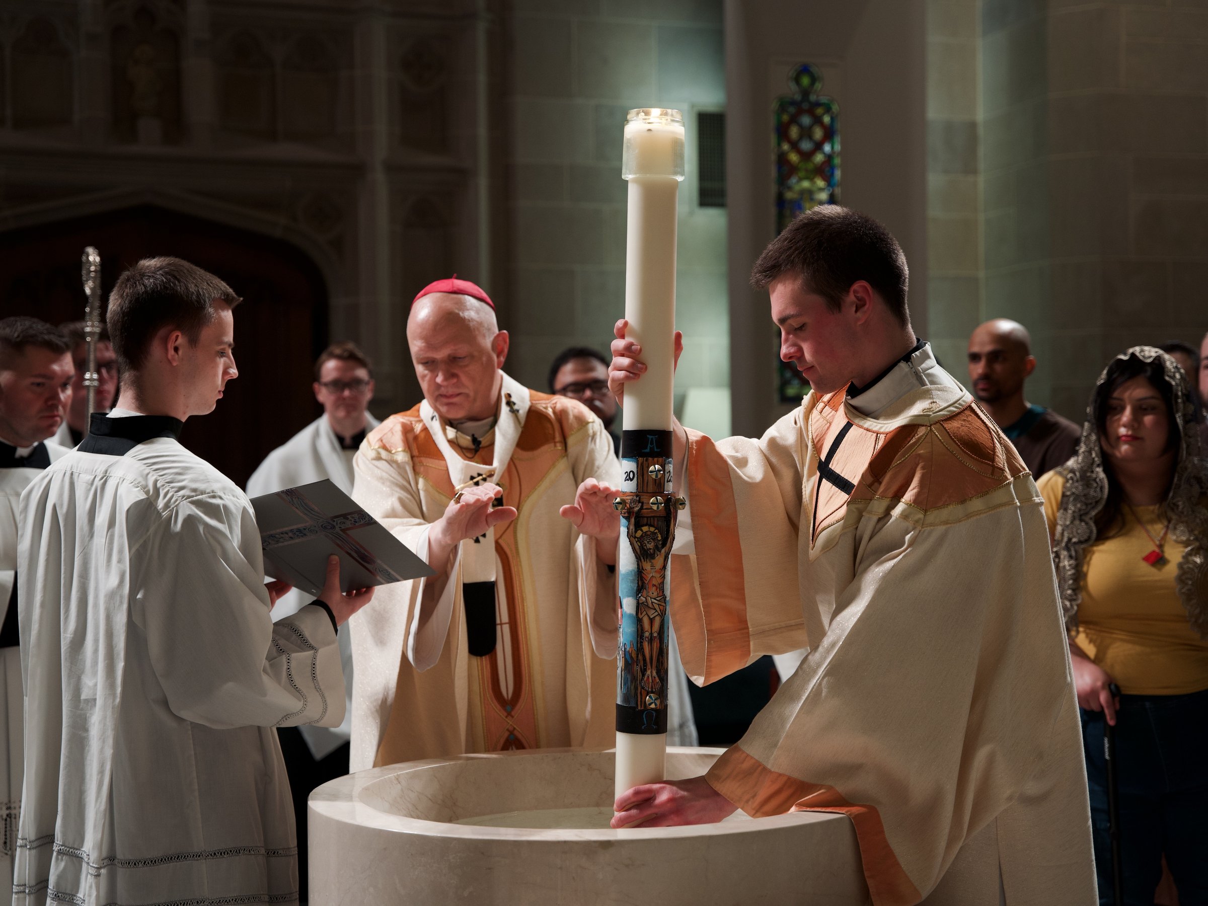 On Saturday, April 4, Archbishop Weisenburger led the Archdiocese of Detroit in the solemn celebration of Christ's victory of sin and death during the Easter Vigil in the holy night at the Cathedral of the Most Blessed Sacrament in Detroit. The most solemn liturgy of the Church's year, the Mass began in darkness, illuminated only by the Easter fire, and ended with the joyous celebration of the Eucharist, complete with new Catholics welcomed into the Church via baptism and confirmation.