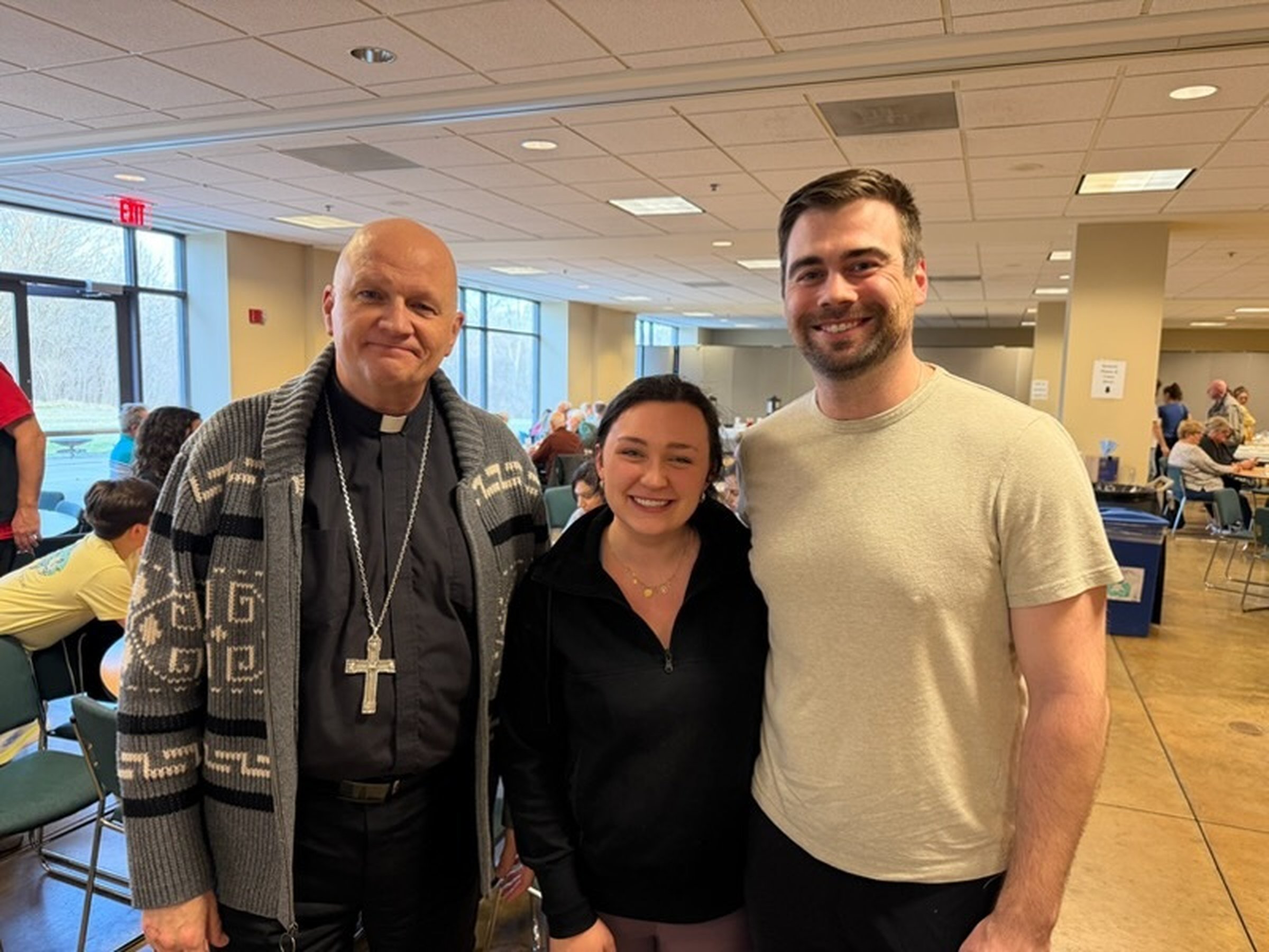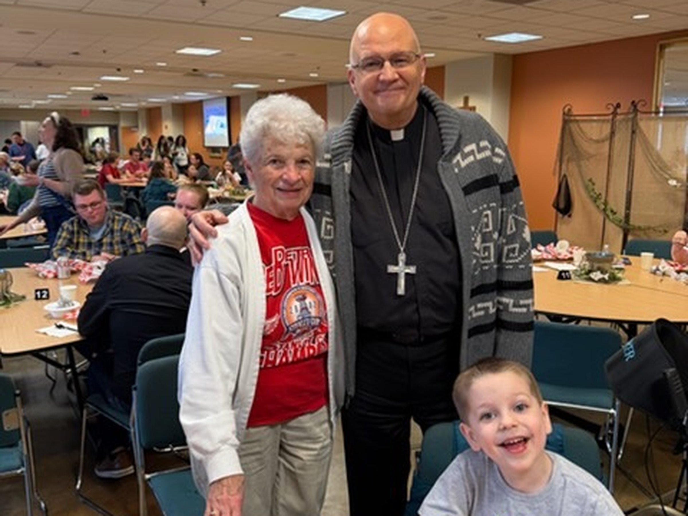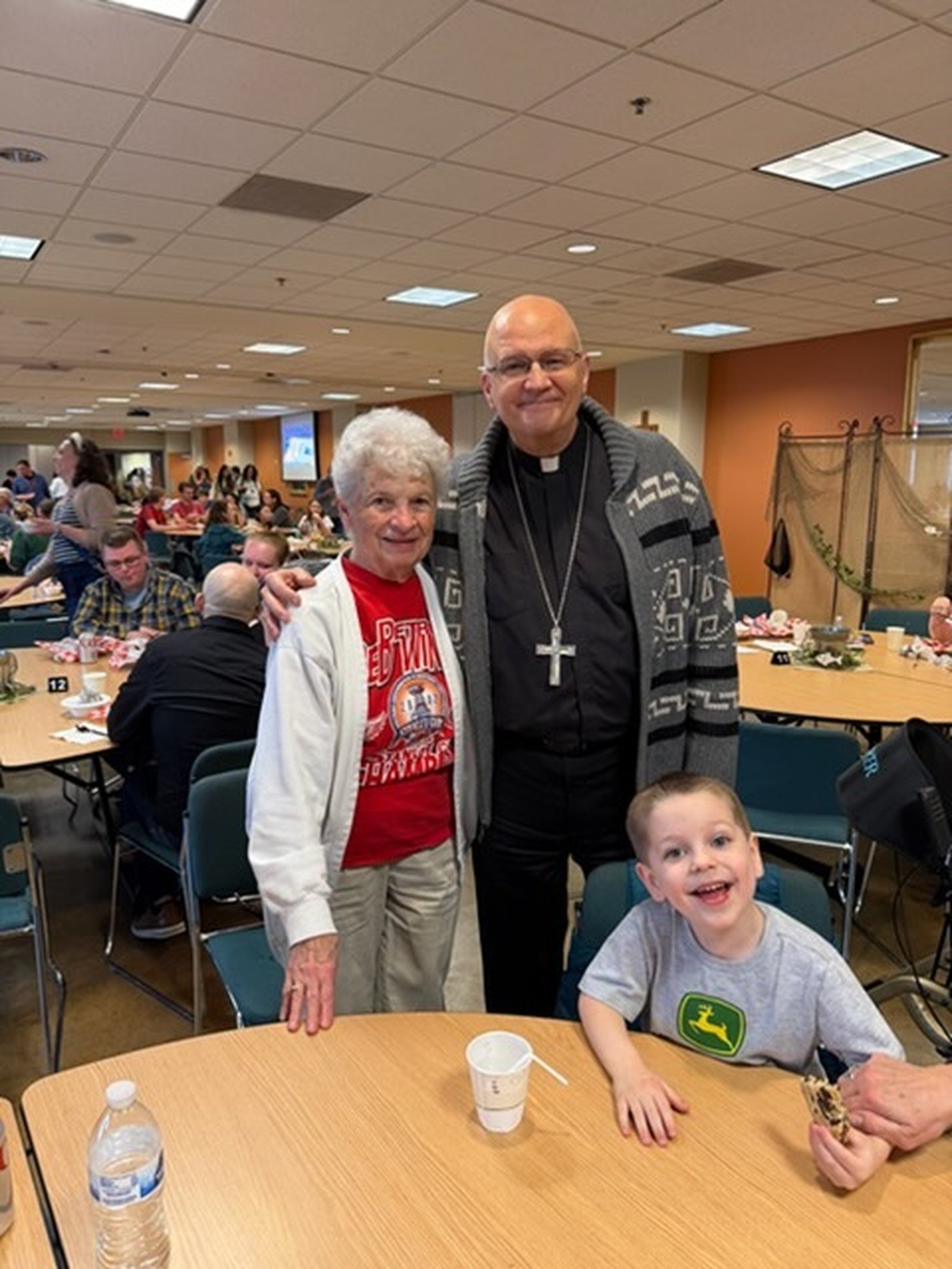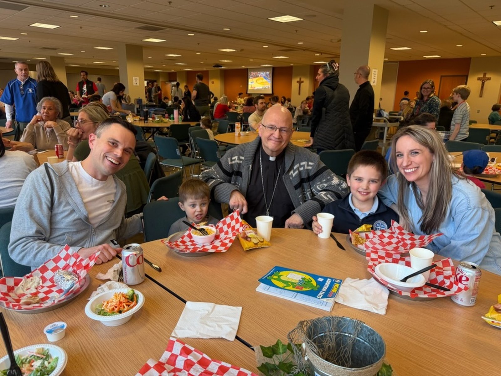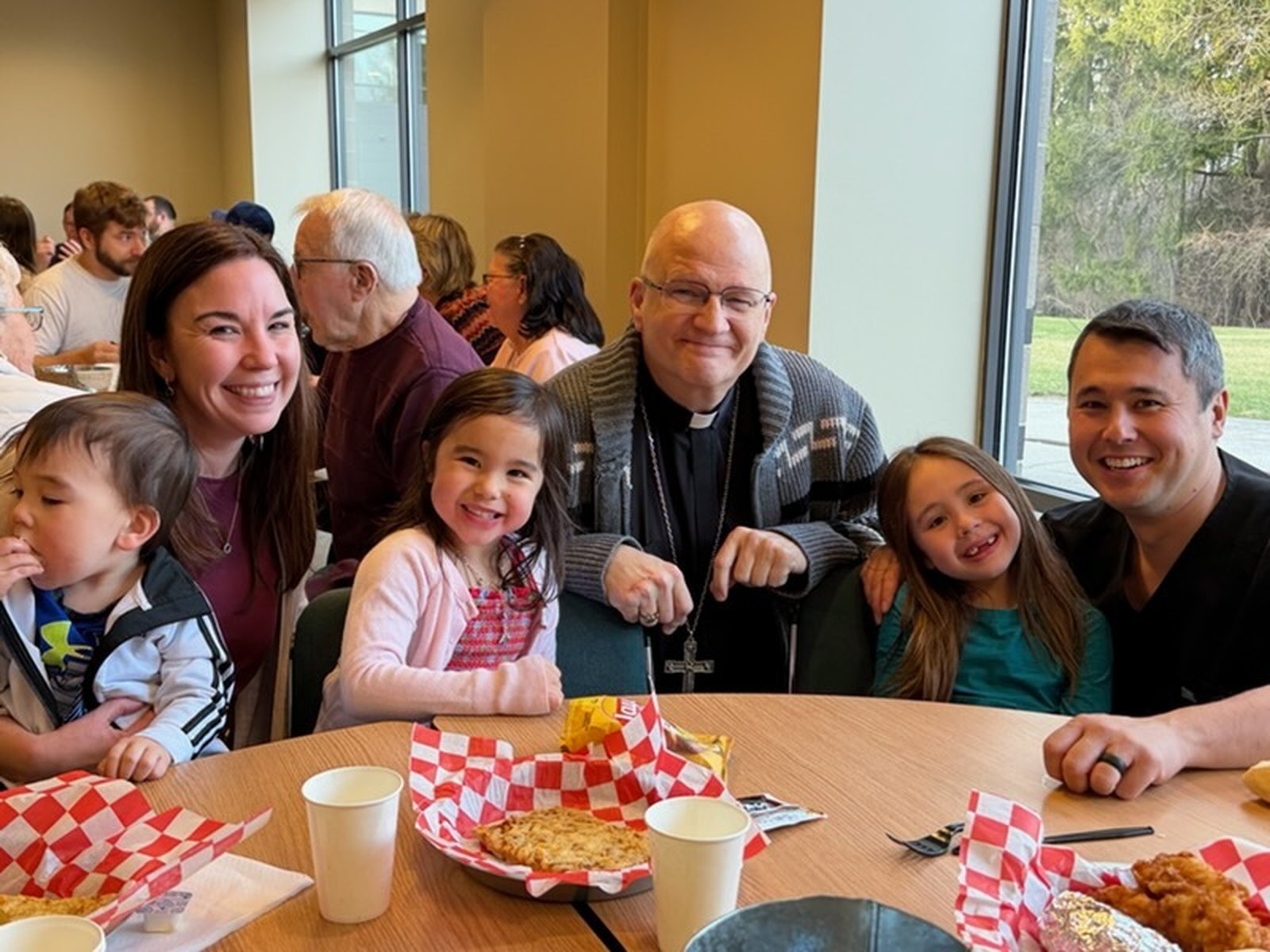 On Friday, March 20, Archbishop Weisenburger continued his parish fish fry tour with a Lenten Friday visit to Our Lady of Good Counsel Parish in Plymouth. The archbishop greatly enjoyed meeting and chatting with parishioners and patrons, especially Mary and her father (pictured above), and the many families who attended. The archbishop attended the fish fry with Fr. Timothy Birney, vicar general and moderator of the curia for the Archdiocese of Detroit, whose brother, Mike Birney, organized the fish fry.