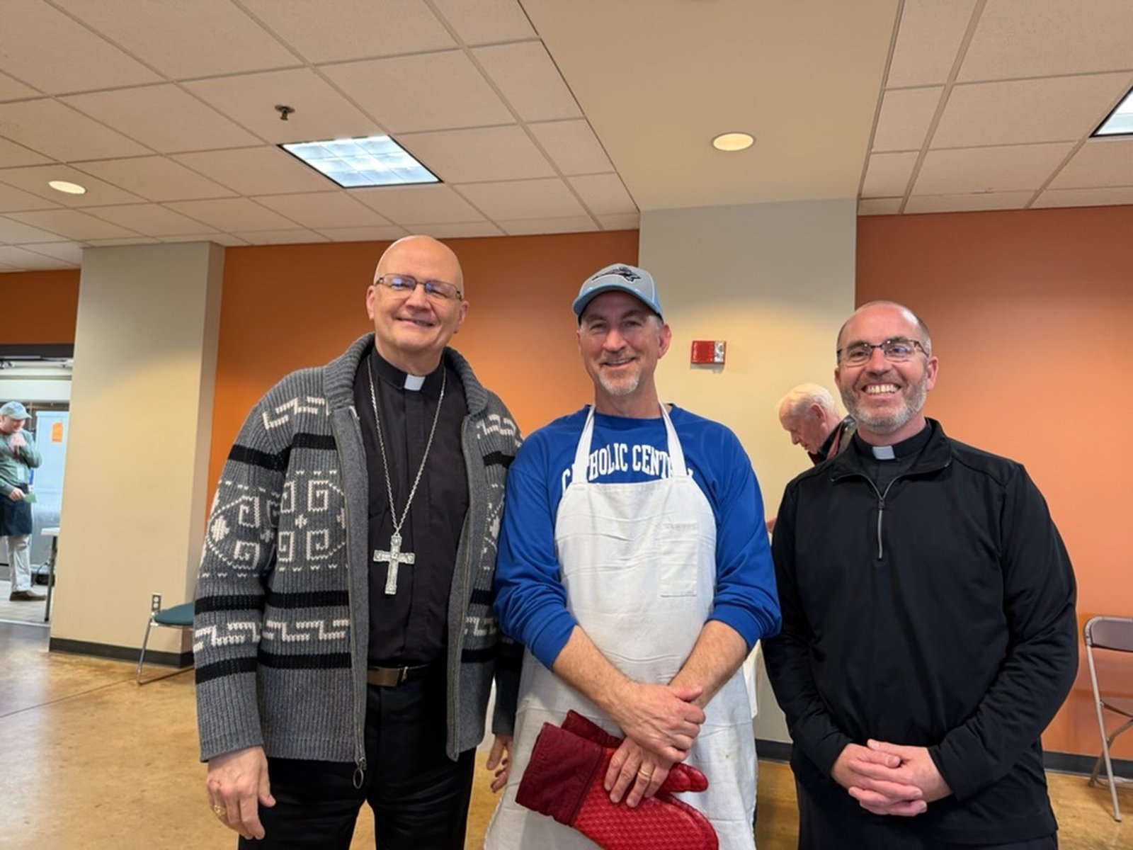 Archbishop Edward J. Weisenburger, left, is pictured with Fr. Timothy Birney, right, vicar general and moderator of the curia for the Archdiocese of Detroit, along with Fr. Birney's brother, Mike Birney, who led Our Lady of Good Counsel's fish fry.