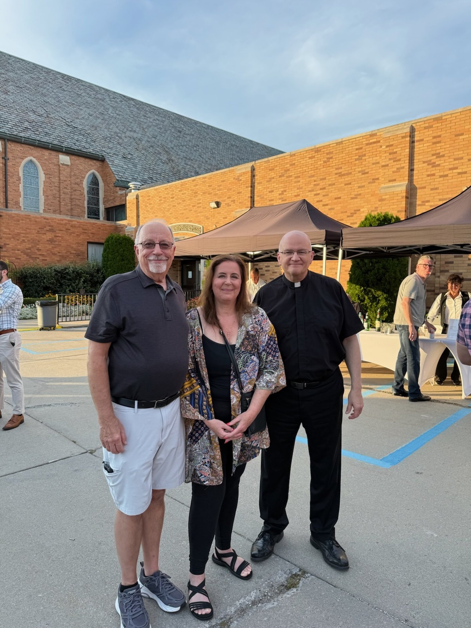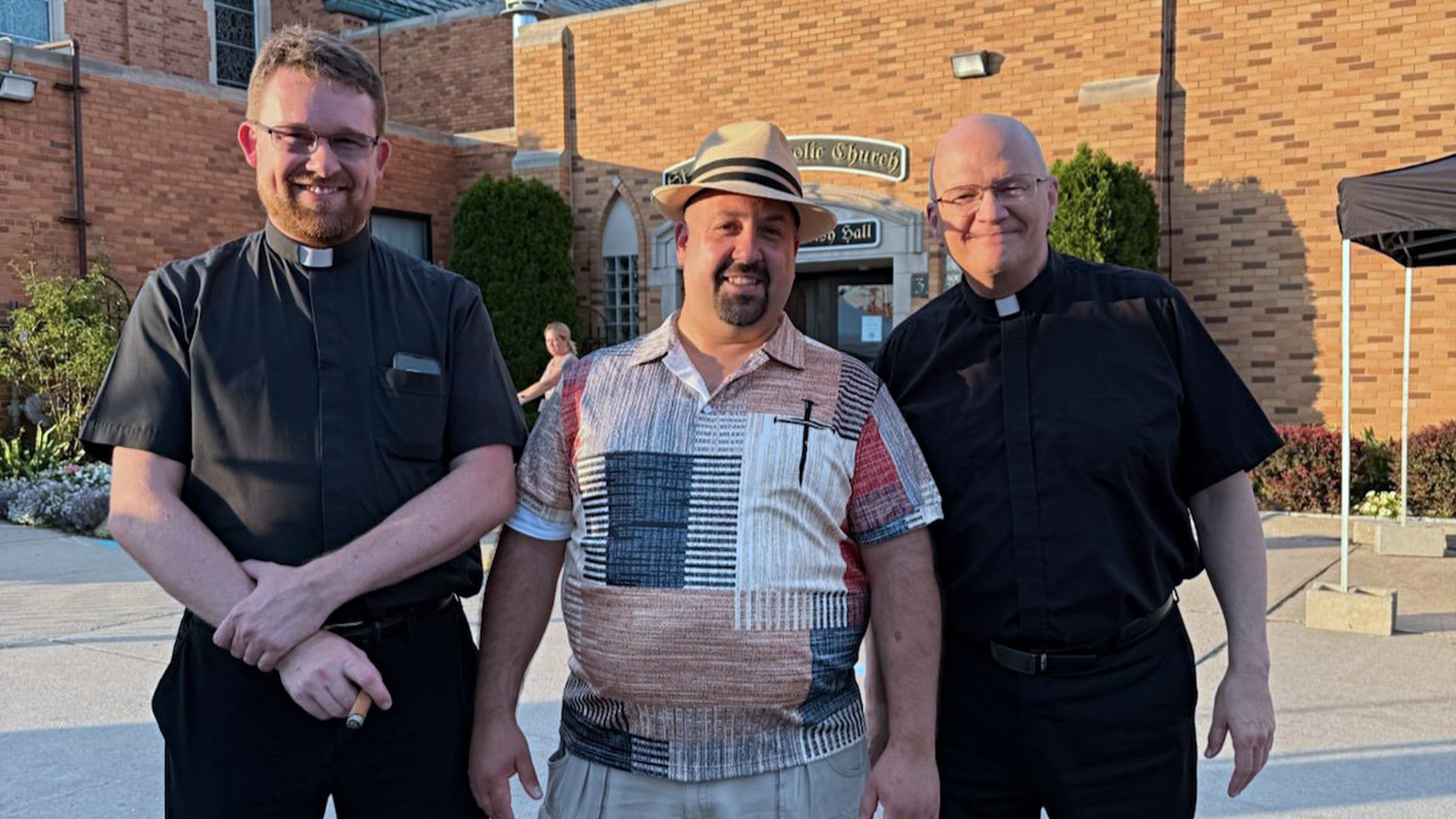 On Friday, Aug. 22, Archbishop Weisenburger enjoyed good company and recreation at the third annual "Holy Smokes" event at St. Peter Parish in Mount Clemens, featuring barbecue, jazz music, drinks and socializing. The archbishop is pictured with St. Peter Parish priests Fr. Salvatore Palazzolo, the event's host, center, and Fr. David Tomaszycki.