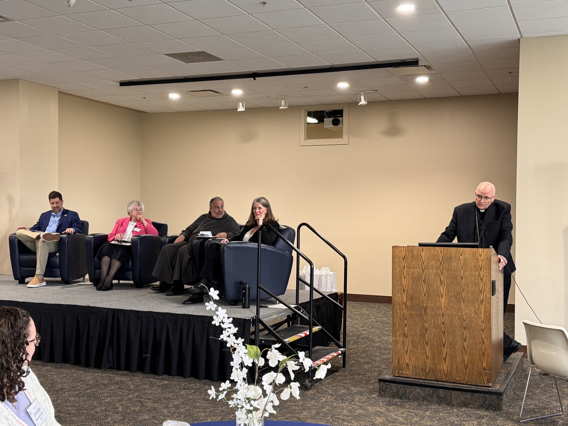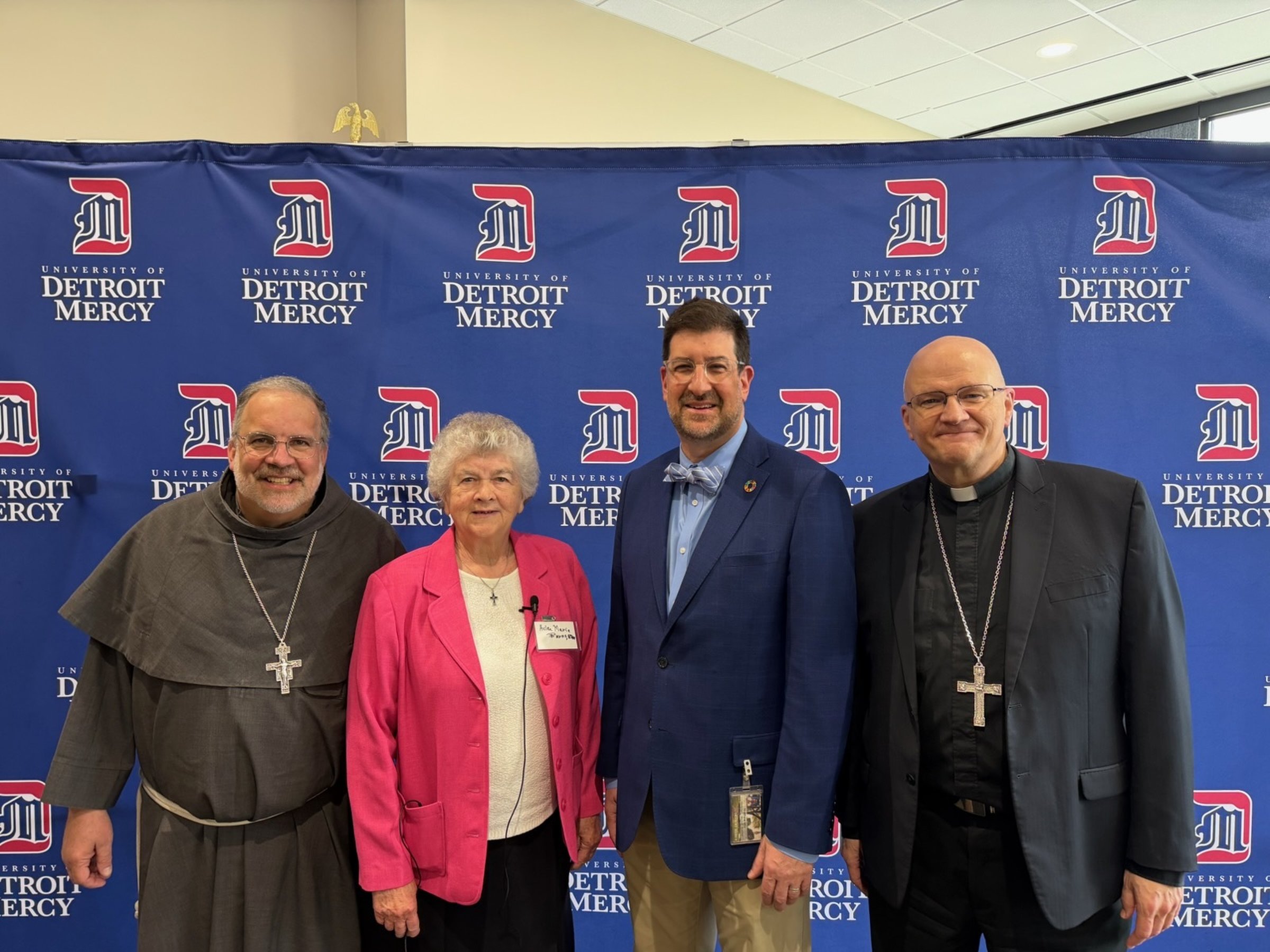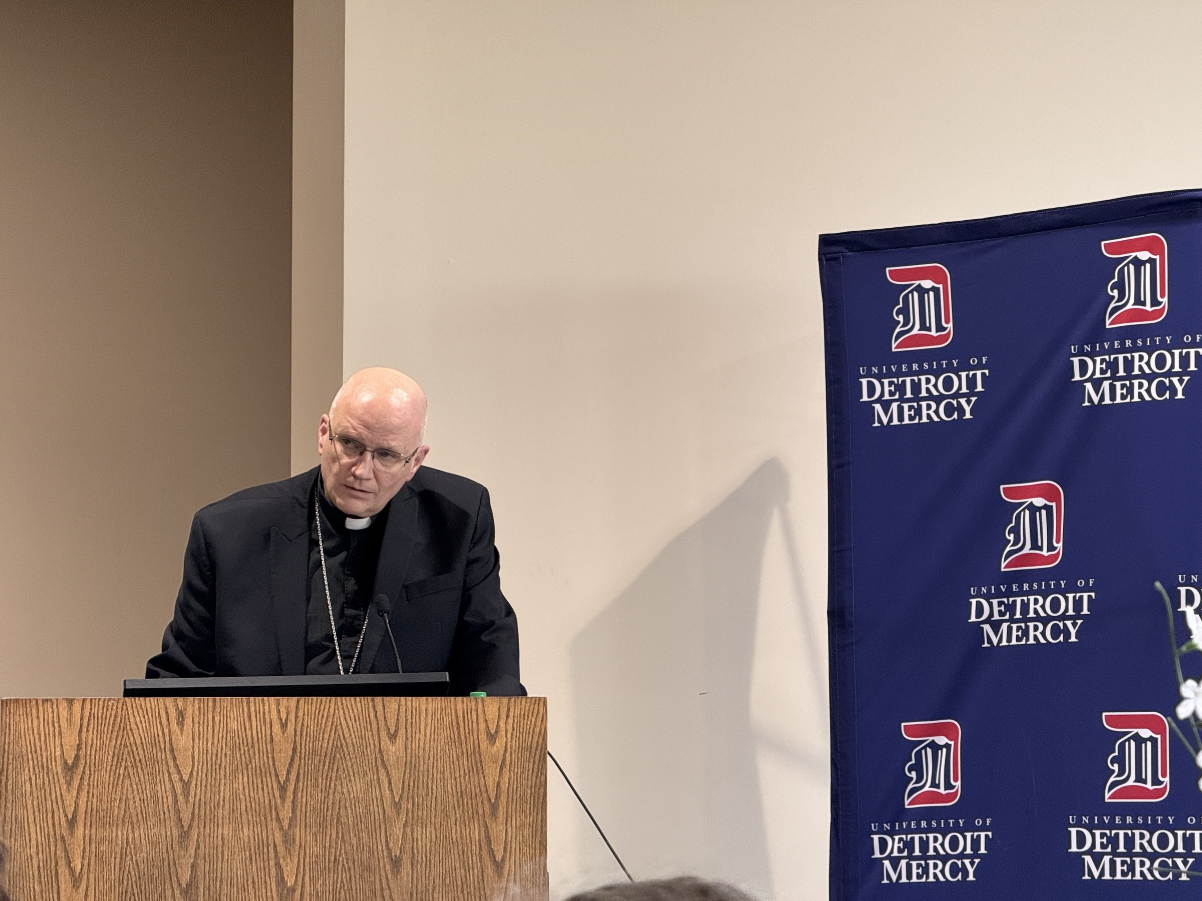 On Saturday, April 25, Archbishop Weisenburger took part in a panel discussion at the University of Detroit Mercy about the Church's prophetic role in some of the most important conversations of the day. The event, "Synodality Encounters: A Conversation on the Church's Prophetic Role of the Church in This Time and Place," featured Archbishop Weisenburger along with other panelists including Bishop John E. Stowe, OFM Conv., of Lexington, Kentucky; Sr. Helen Marie Burns, RSM, current university board member and former president of the Leadership Conference of Women Religious; and Matt Mio, Ph.D., chairman and longtime professor of chemistry and biochemistry, as well as a devoted local Catholic. The panel was moderated by Bridget Deegan-Krause, M.Div., BCC, who has 30 years of ministry in Catholic health care and higher education, and hosted by Fr. Charles Oduke, SJ, the university's vice president for mission integration.
