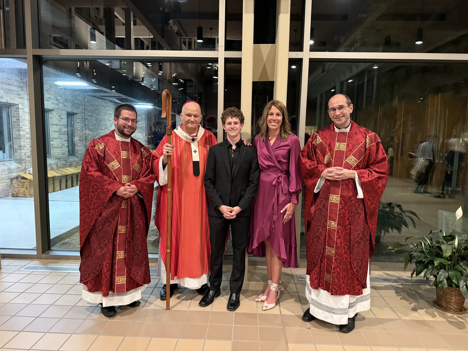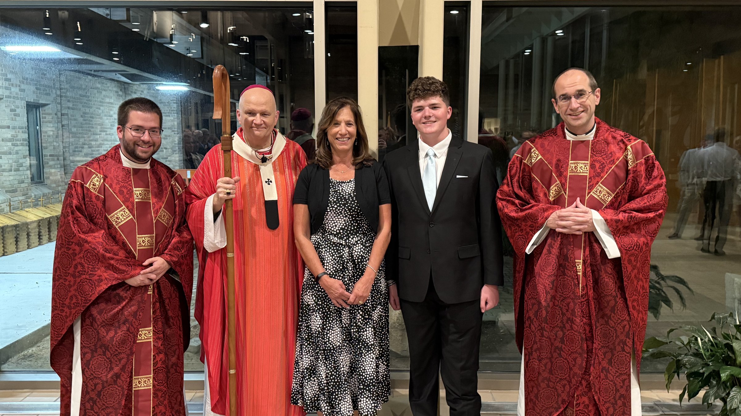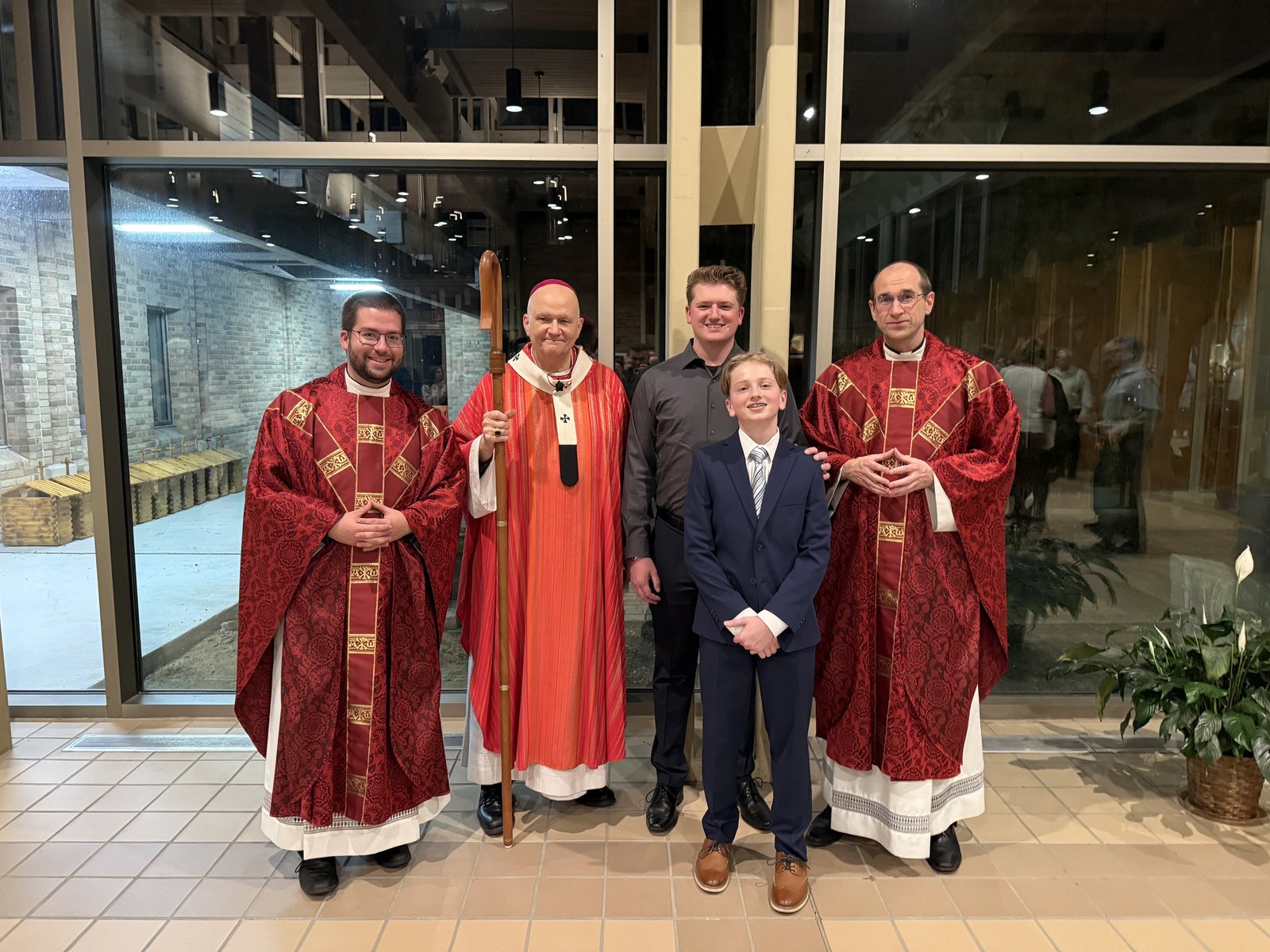 On Oct. 7, Archbishop Weisenburger celebrated the sacrament of confirmation of 71 young people at St. John Vianney Parish in Shelby Township. One of the sacraments of initiation, confirmation invites the Holy Spirit to dwell with those being confirmed in a powerful way as they go forward to live their lives as Christians commissioned by the Lord to go into the world and spread the Gospel. Also pictured are Fr. James Grau and Fr. Stephen Moening, who serve at St. John Vianney.