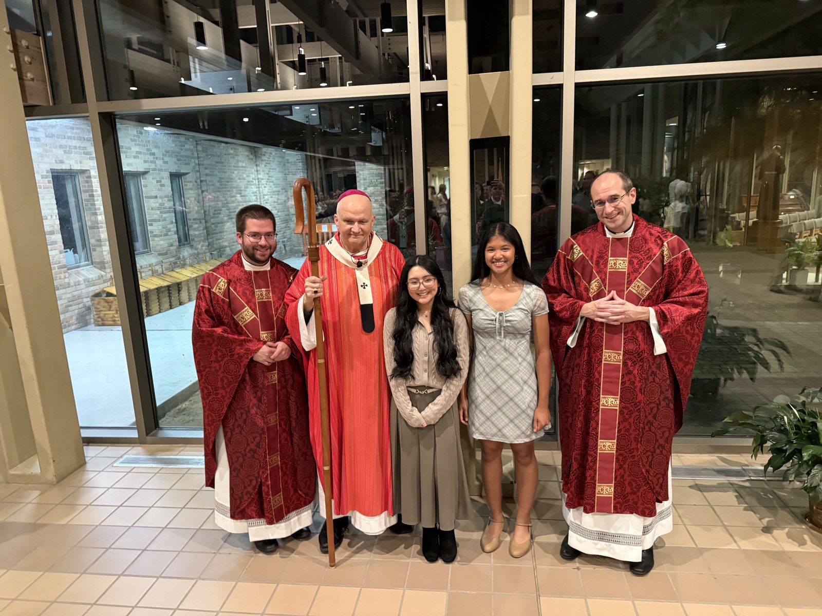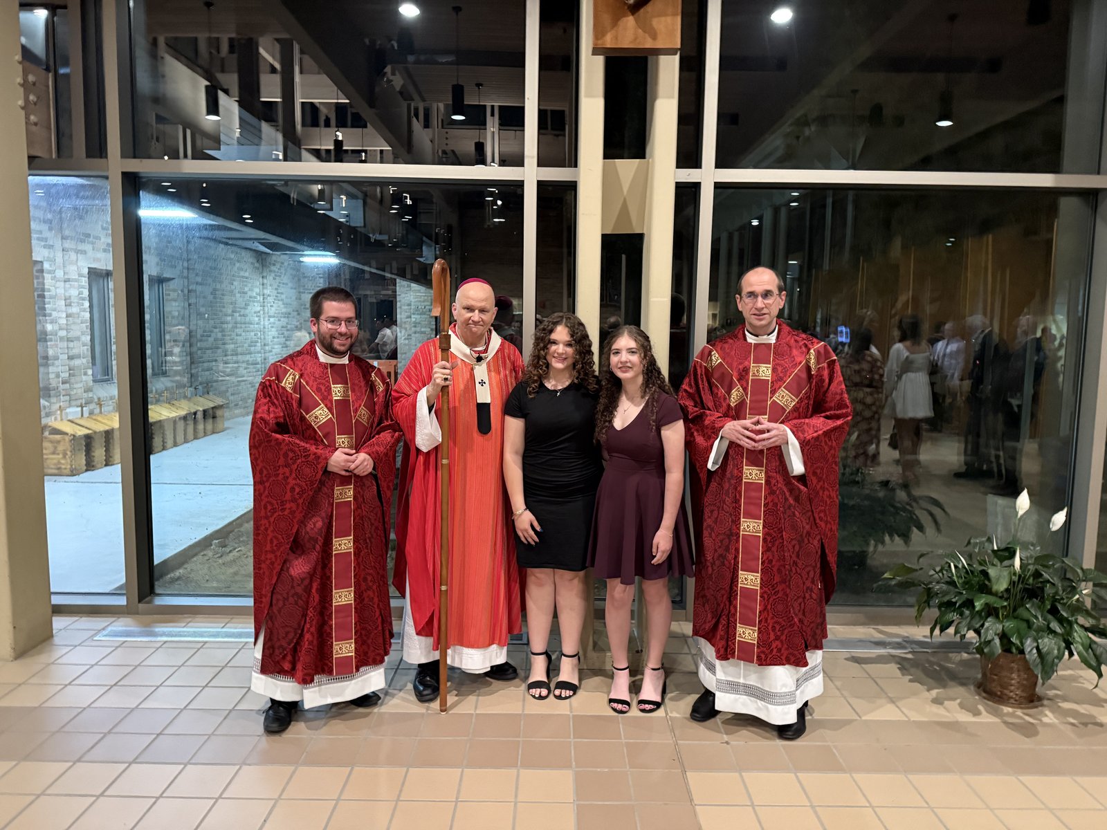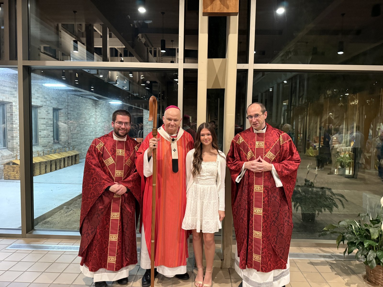 On Oct. 7, Archbishop Weisenburger celebrated the sacrament of confirmation of 71 young people at St. John Vianney Parish in Shelby Township. One of the sacraments of initiation, confirmation invites the Holy Spirit to dwell with those being confirmed in a powerful way as they go forward to live their lives as Christians commissioned by the Lord to go into the world and spread the Gospel. Also pictured are Fr. James Grau and Fr. Stephen Moening, who serve at St. John Vianney.