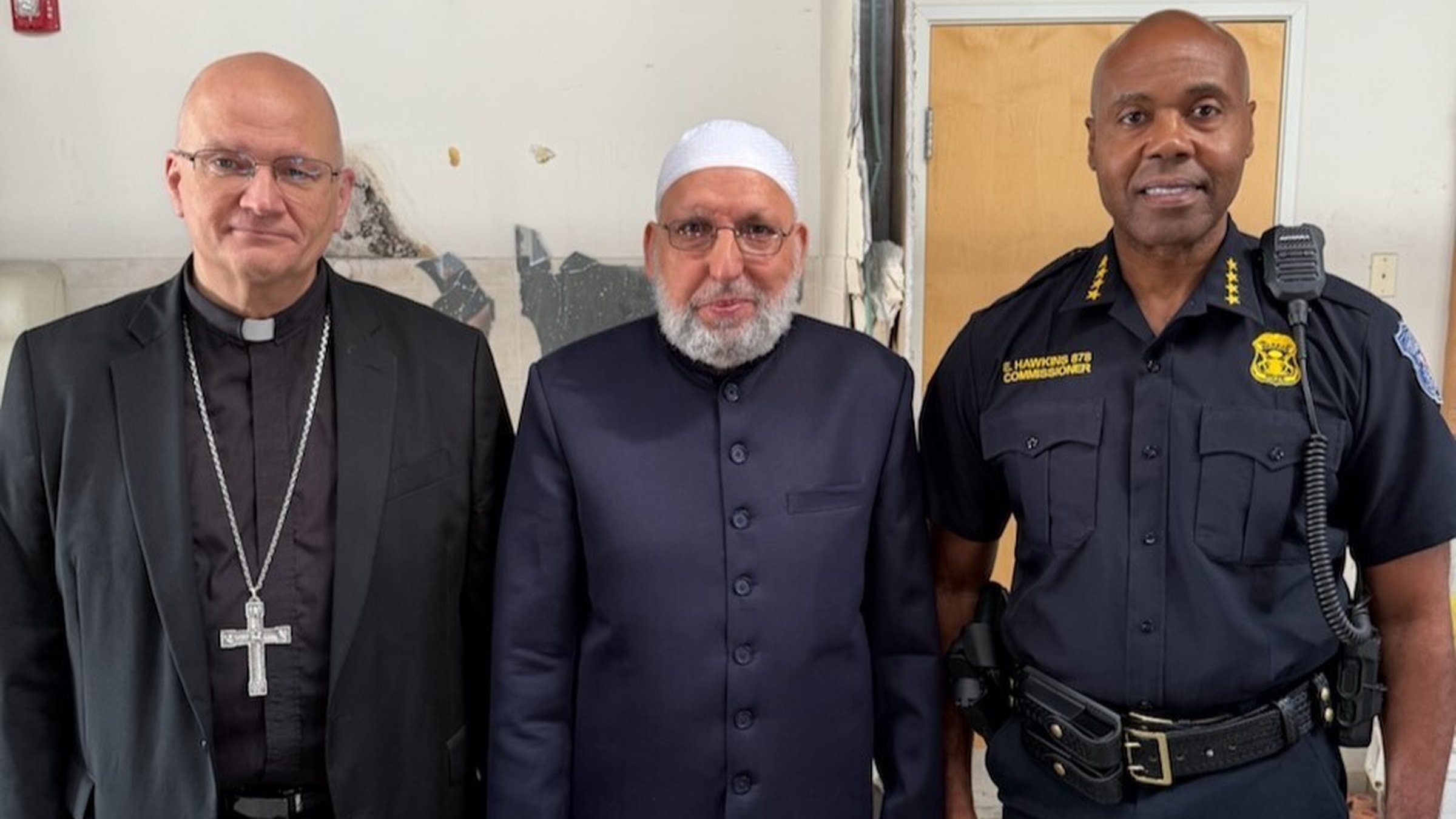 Archbishop Weisenburger, along with interfaith and civic leaders across Metro Detroit, expressed their support, encouragement and solidarity with the local Muslim community Sept. 12 after a construction site at the Islamic Organization of North America's mosque in Warren was vandalized. Archbishop Weisenburger is pictured with Imam Steve Mustafa Elturk, president of the Islamic Organization of North America, and Warren police commissioner Eric Hawkins.