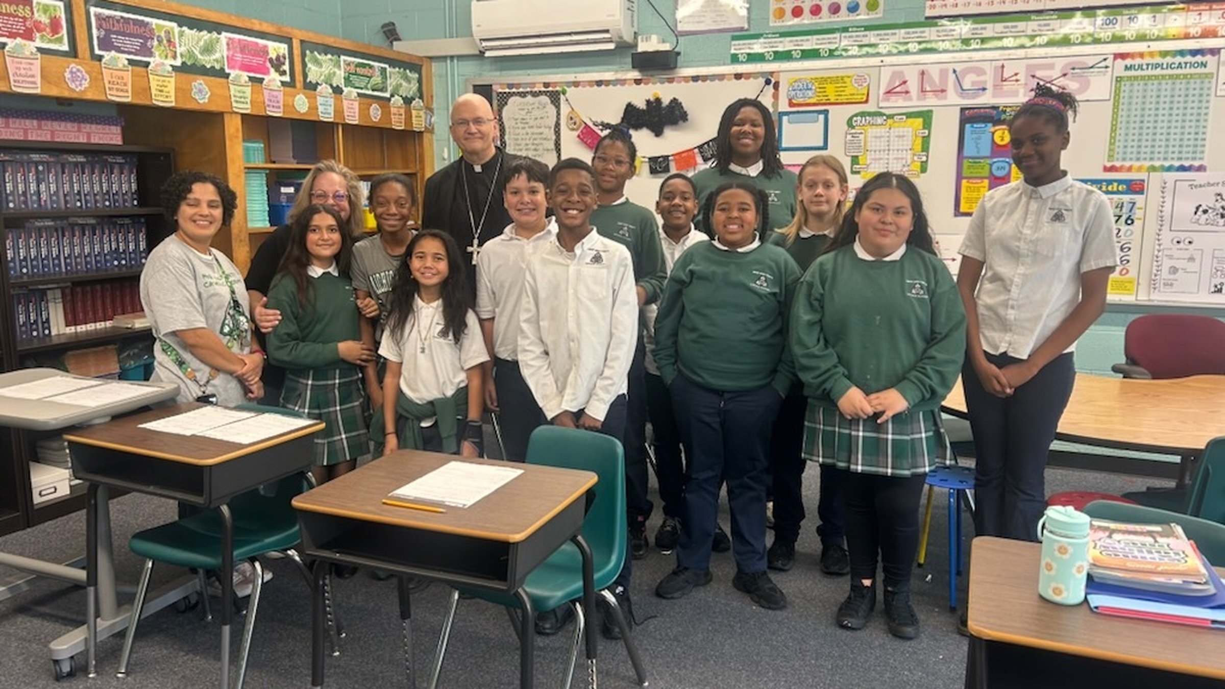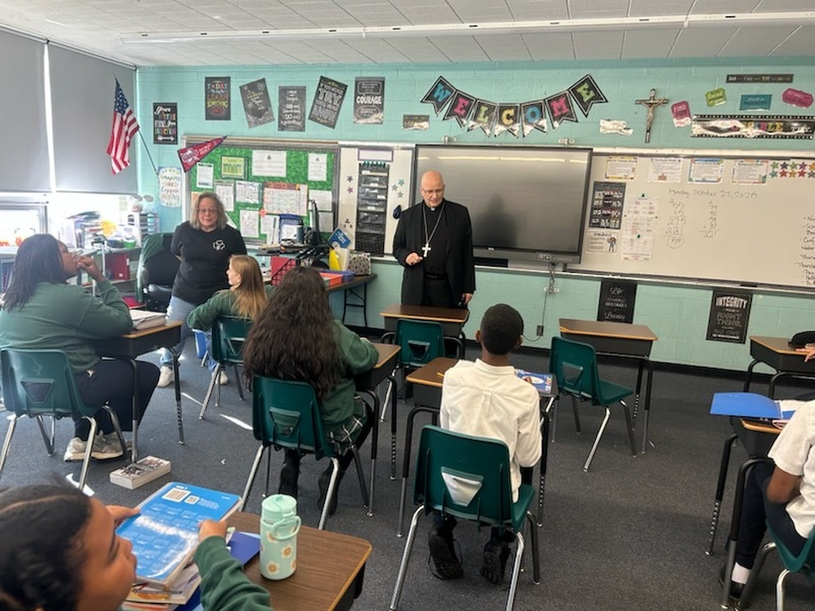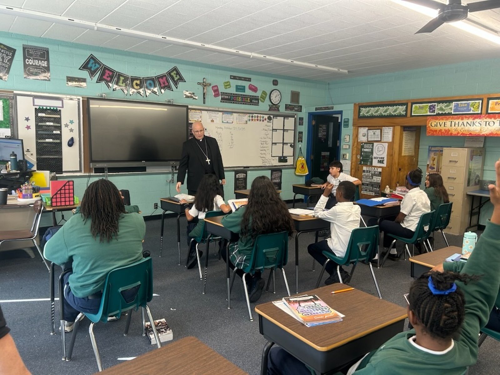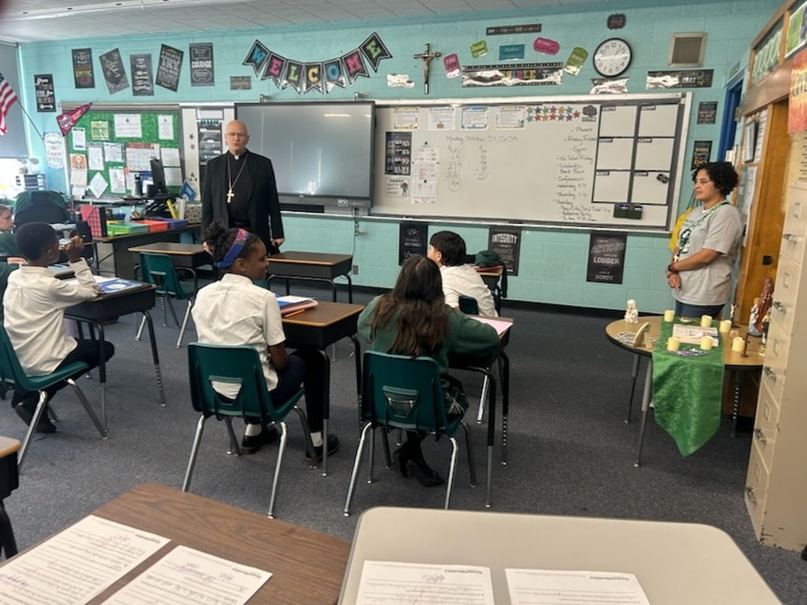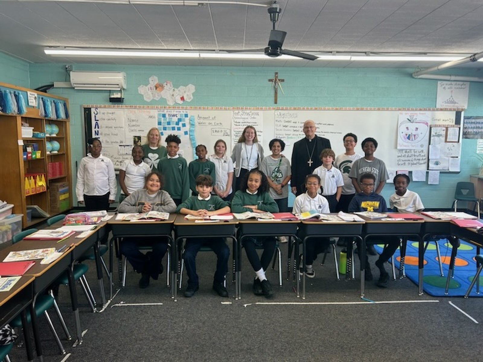 On Monday, Oct. 27, Archbishop Weisenburger visited with teachers and students at Most Holy Trinity School in Detroit's Corktown neighborhood, dropping by to offer words of encouragement after blessing the nearby Cabrini Clinic earlier in the afternoon. In each of the classrooms he visited, Archbishop Weisenburger took a few moments to chat with students, answer questions and take pictures with students and teachers.