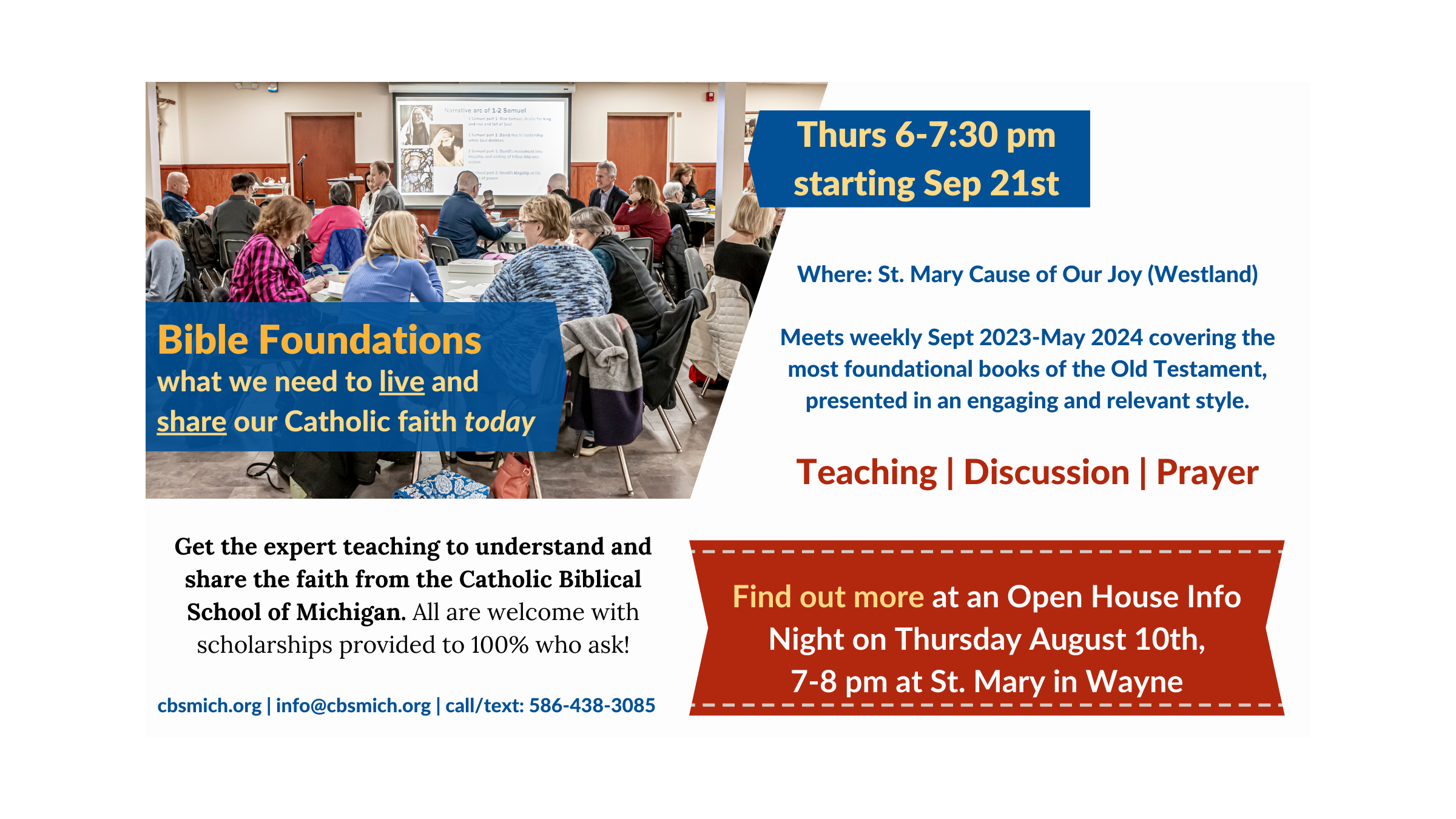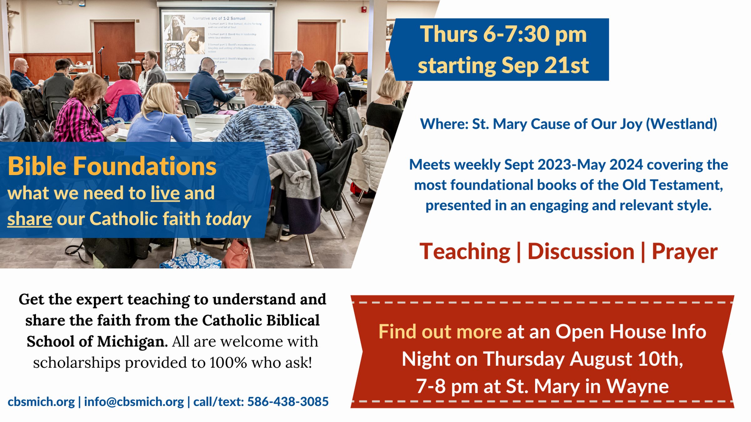 Join the two-year course that provides the foundations for understanding the most foundational books of the Old and New Testaments. Starting in the Nankin Family of Parishes at St. Mary Cause of Our Joy (Westland) on Thursdays 6-7:30 pm, meeting weekly from Sept 2023-May 2024 and Sept 2024-May 2025. Learn more at an Open House Info Night, Thu Aug 10th 7-8 pm at St. Mary (Wayne) or Wed Aug 23rd 7-8 pm at St. Mary Cause of Our Joy (Westland). Find out more at cbsmich.org or call/text 586-438-3085.