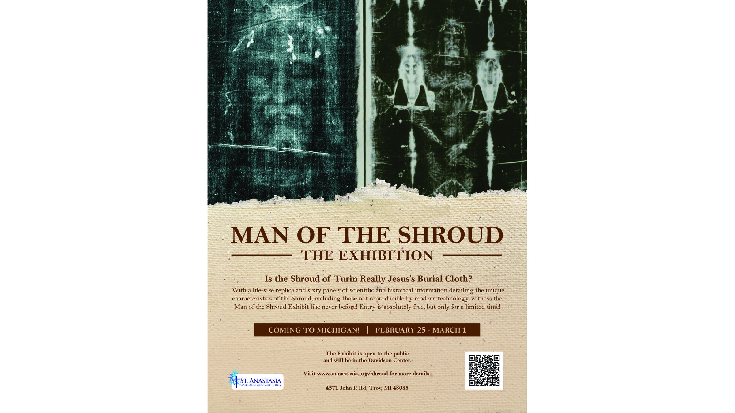 With a life-size replica and sixty panels of scientific and historical information detailing the unique characteristics of the Shroud, including those not reproducible by modern technology, witness the Man of the Shroud Exhibit like never before! Entry is absolutely free, but only for a limited time!