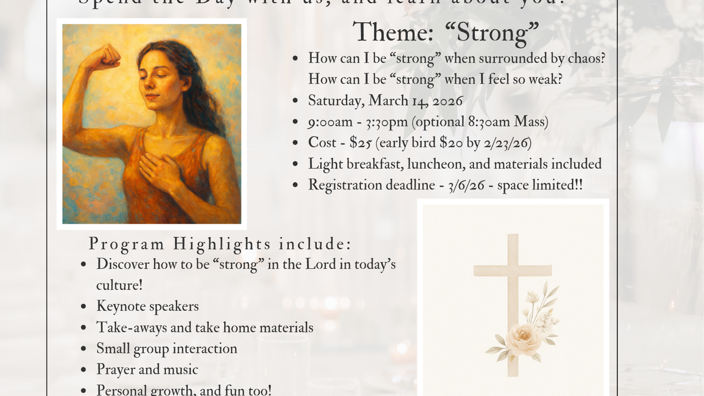 Grab a girl friend or two, or some family members, and join us for our One-day Women's Lenten retreat! Many of us don't have time for a weekend retreat - so we're fitting one into 7 hours instead. Learn how our theme "Strong" applies to your life and faith. Can you be strong in chaos? In change? In vulnerability? Come find out! Early bird registration ends Monday 2/23 ($20), regular registration ends March 6 ($25) - includes light breakfast, lunch, keynote speaker, and all materials. Do something different this Lent -- find out how to be strong in the Lord!