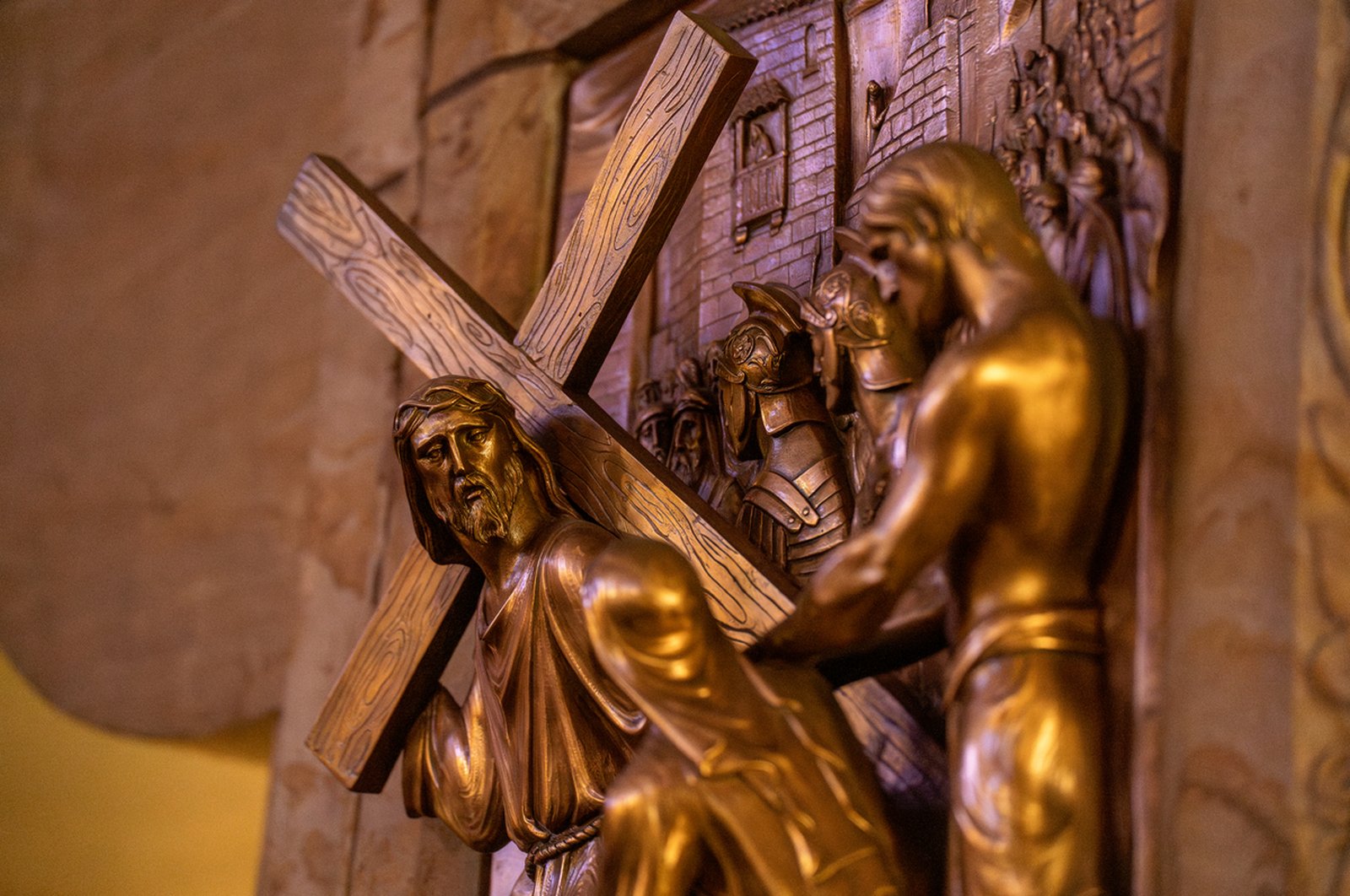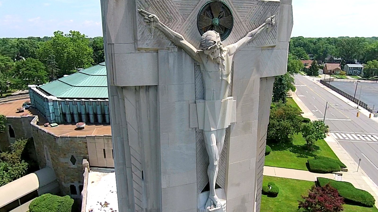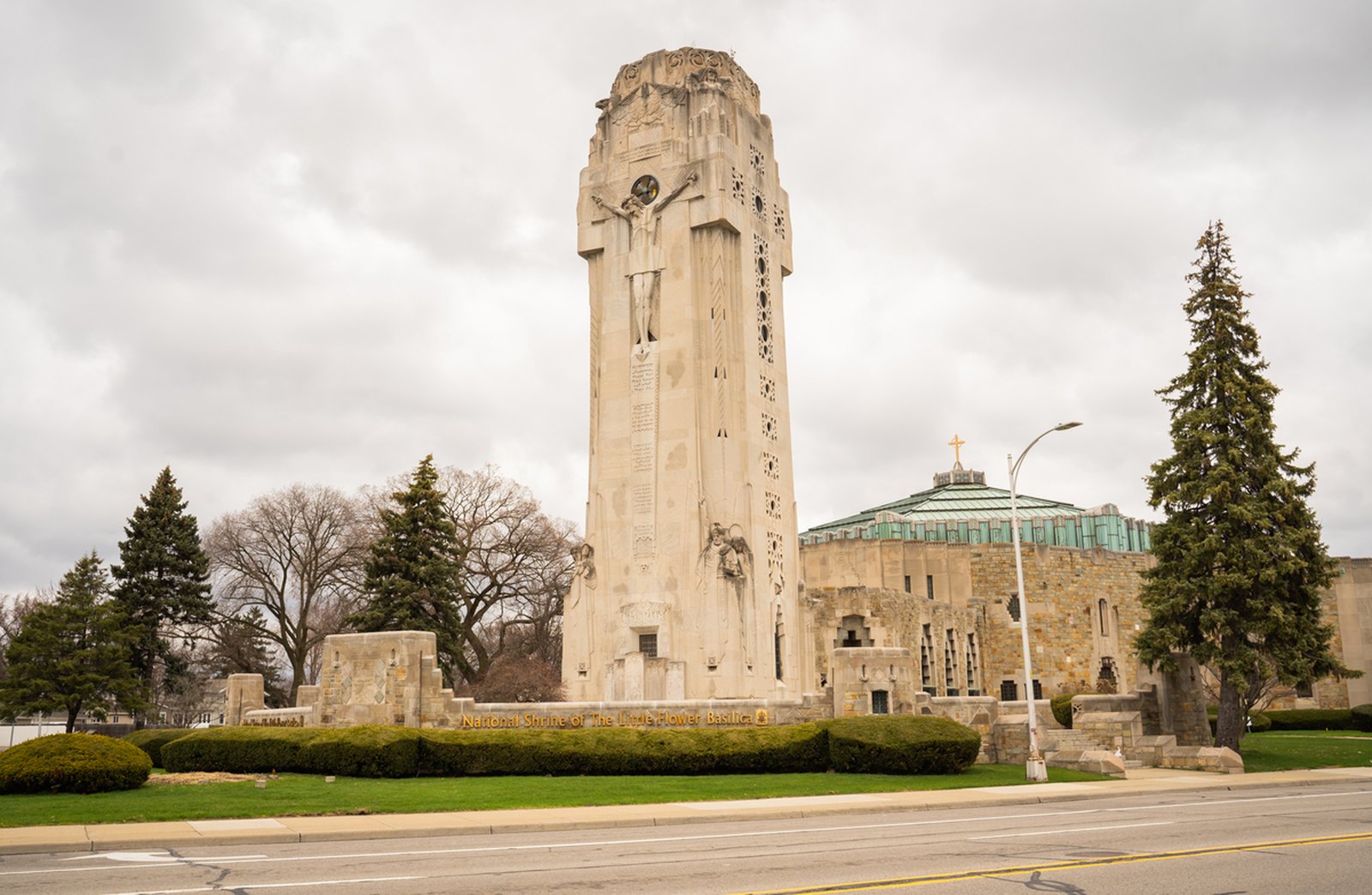 Signs of the basilica's devotion to St. Therese of Lisieux are also evident everywhere, including an exterior garden and a special room dedicated to St. Therese's family near the baptistry. A depiction of the "Little Flower" is carved into the wall opposite the basilica's iconic Crucifixion Tower, which overlooks Woodward Avenue and serves as a visually stunning reminder of Jesus' passion, with Christ's Seven Last Words carved beneath the crucifix.