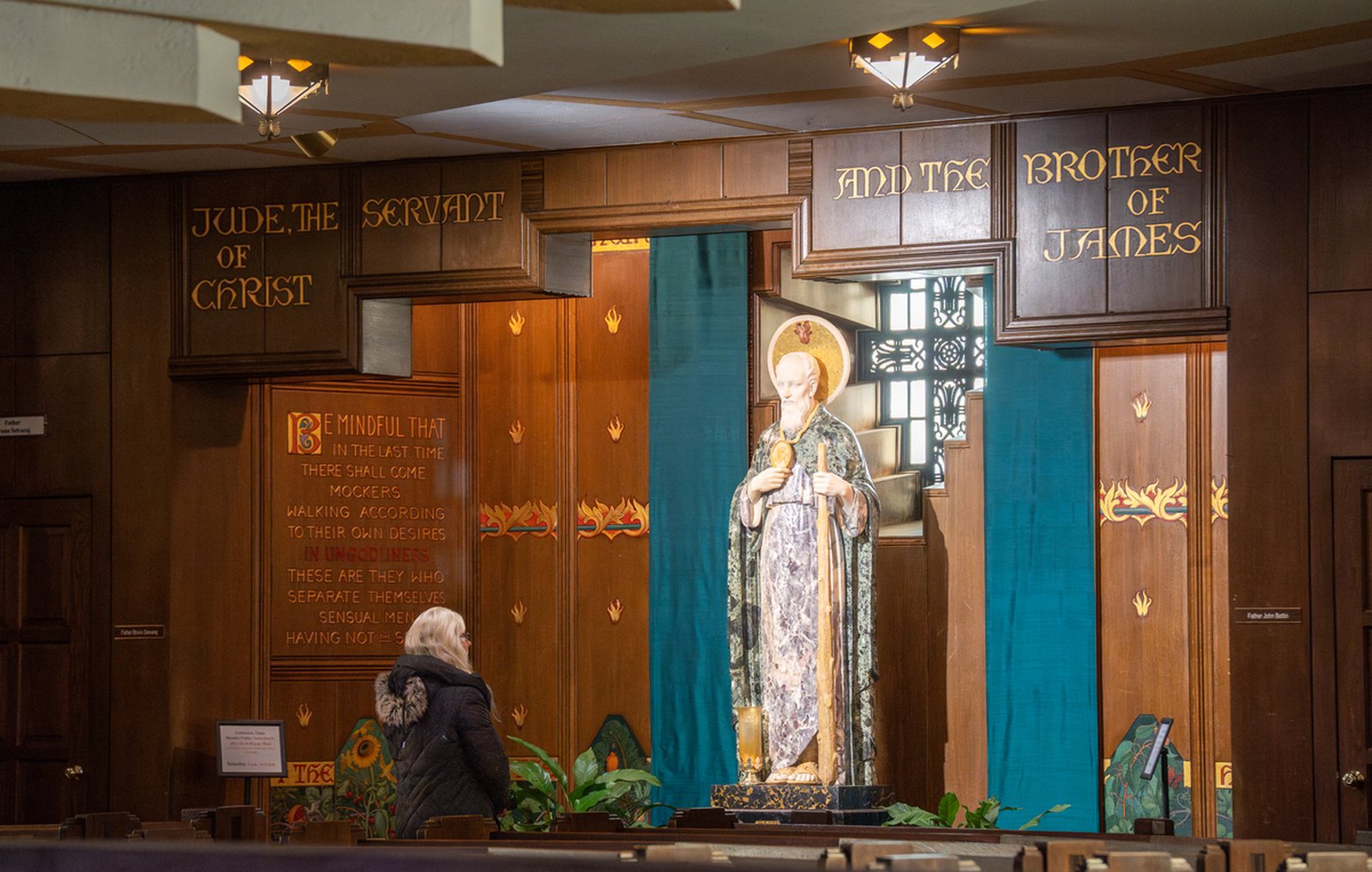 The parish is decorated with countless examples of original early 20th-century and Art Deco paintings, woodwork, stonework and metalwork. Everywhere you look, you can see the paintings done by artist Beatrice Wilczynski. Wilczynski used parishioners and her own family and friends as models for the saints and angels painted around the church; the four angels in the four corners of the St. Therese Chapel were modeled after the four secretaries of Fr. Coughlin; behind the statue of St. Jude off to the side of the tabernacle, Wilczynski painted the Fruits of the Holy Spirit, surrounded by images that represent the state of Michigan, such as cherries, maple leaves, apples and robins. Pray with the bronze Stations of the Cross that encircle the church, made by famed Italian-American sculptor Corrado Parducci.