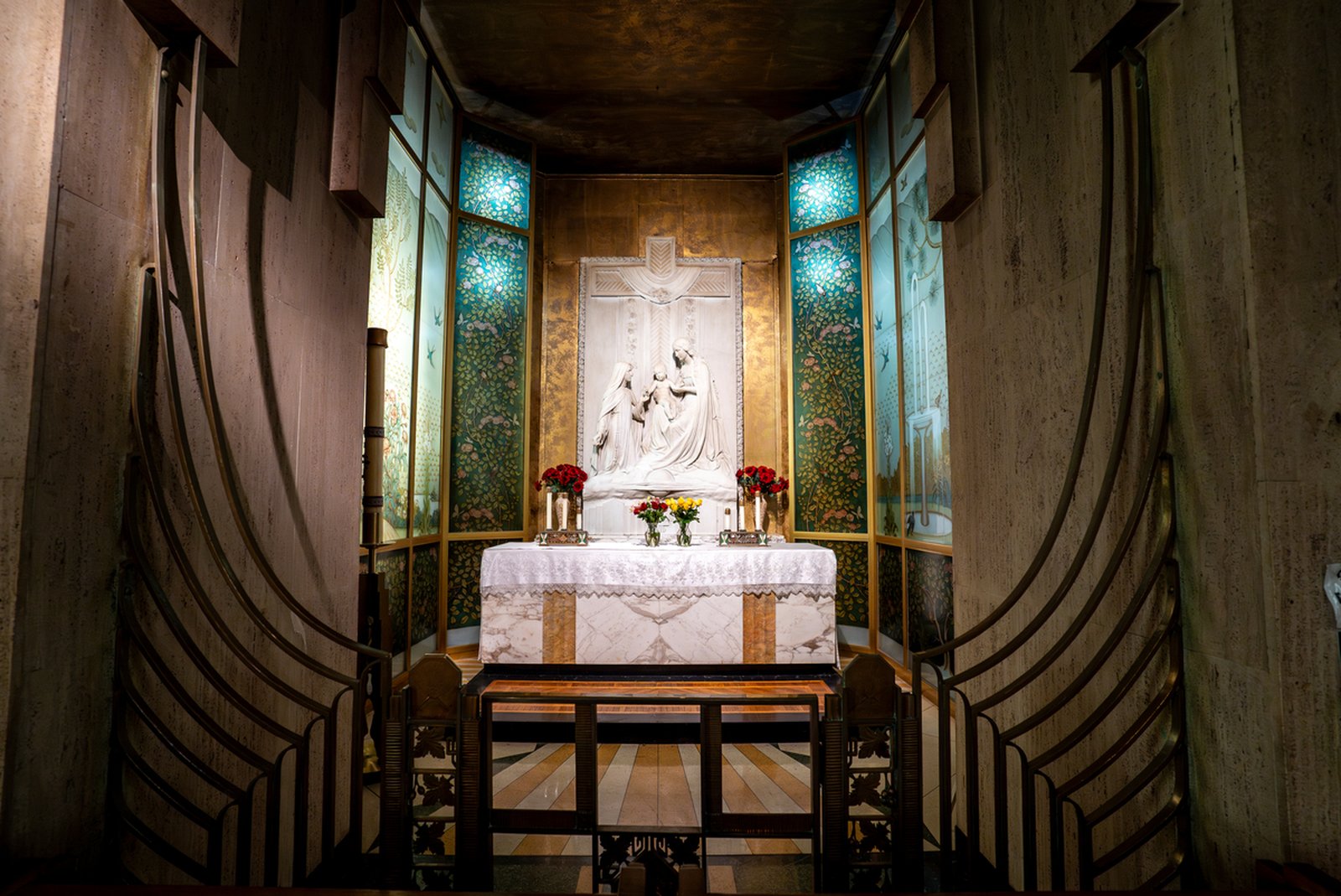 Four porticos surround the altar, each with shrines to individual saints. Directly across from the cove containing the tabernacle is an entrance to the St. Therese Chapel, dedicated to St. Therese of Lisieux, the basilica's patron saint.
