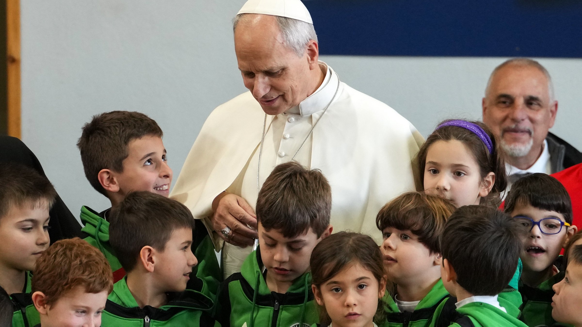 Pope Leo began the visit by greeting young people and families gathered behind the church. A clutch of gold mylar balloons -- depicting a smiling lion and the numbers "one" and "four" -- bopped and twisted in the strong breeze coming in off the Mediterranean Sea.