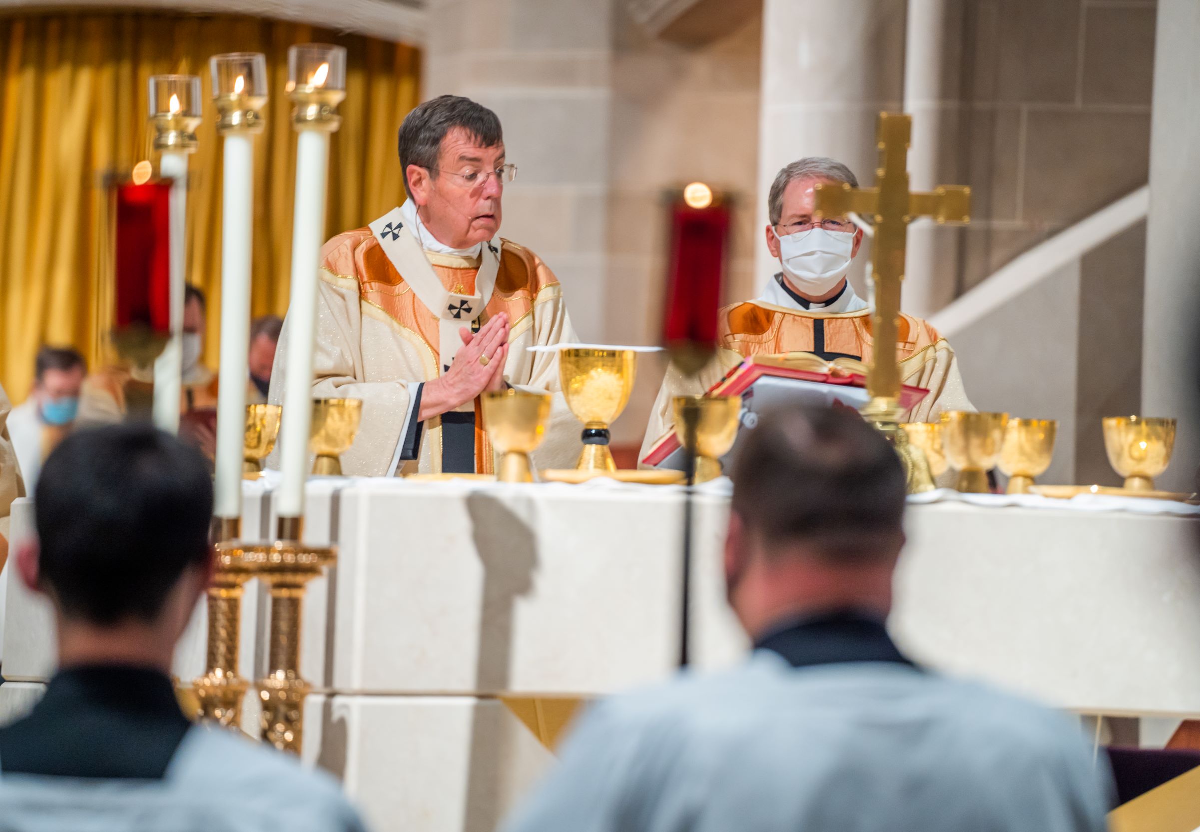 Even inside the spacious cathedral — which seats nearly 1,000 — priests were spaced six feet apart and wearing masks.