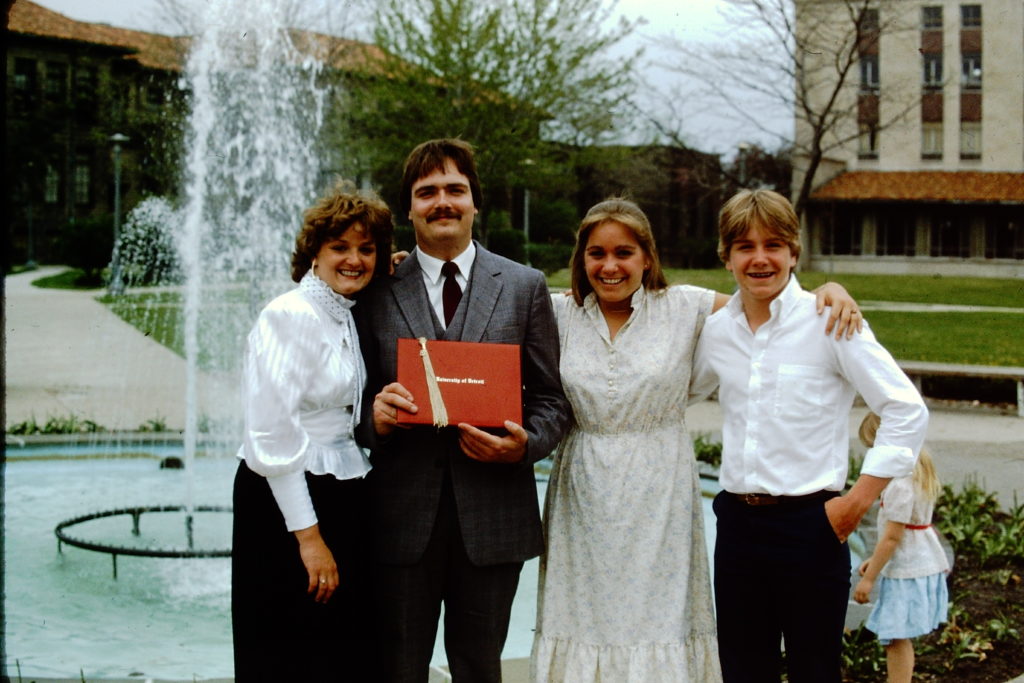 The future Bishop Robert J. Fisher is pictured with his younger siblings, Michele, Barb and Jeff, at his graduation from the University of Detroit in 1983. Bishop Fisher’s siblings say their older brother always showed a willingness to put others first, even with them. (Family photos)Younger sisters, brother recall new bishop as a doting big brother, great role model
