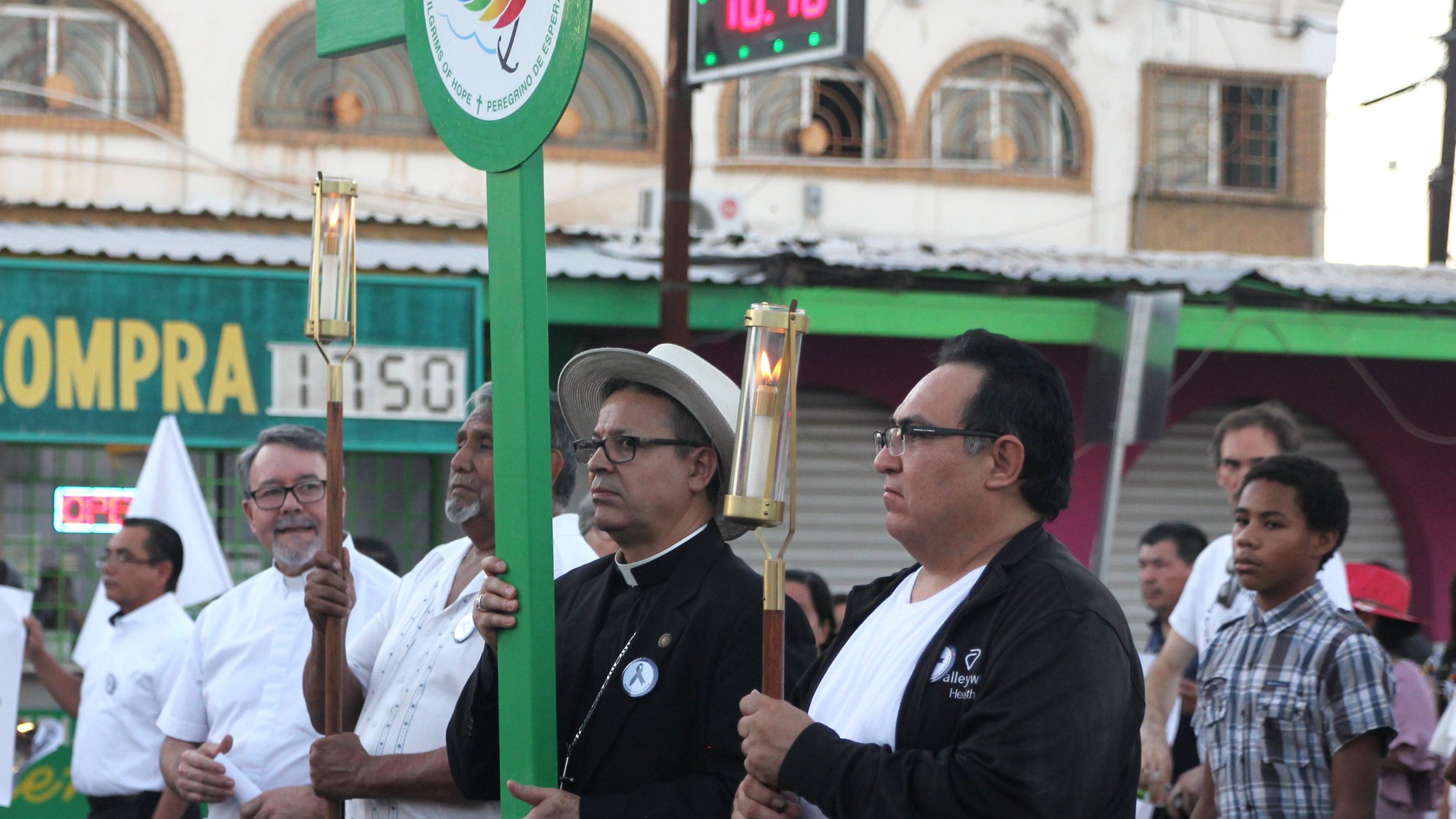 Along the route the bishops took turns carrying the cross, stopping at makeshift stations commemorating symbols of the migrant journey. Several hundred joined in the procession.