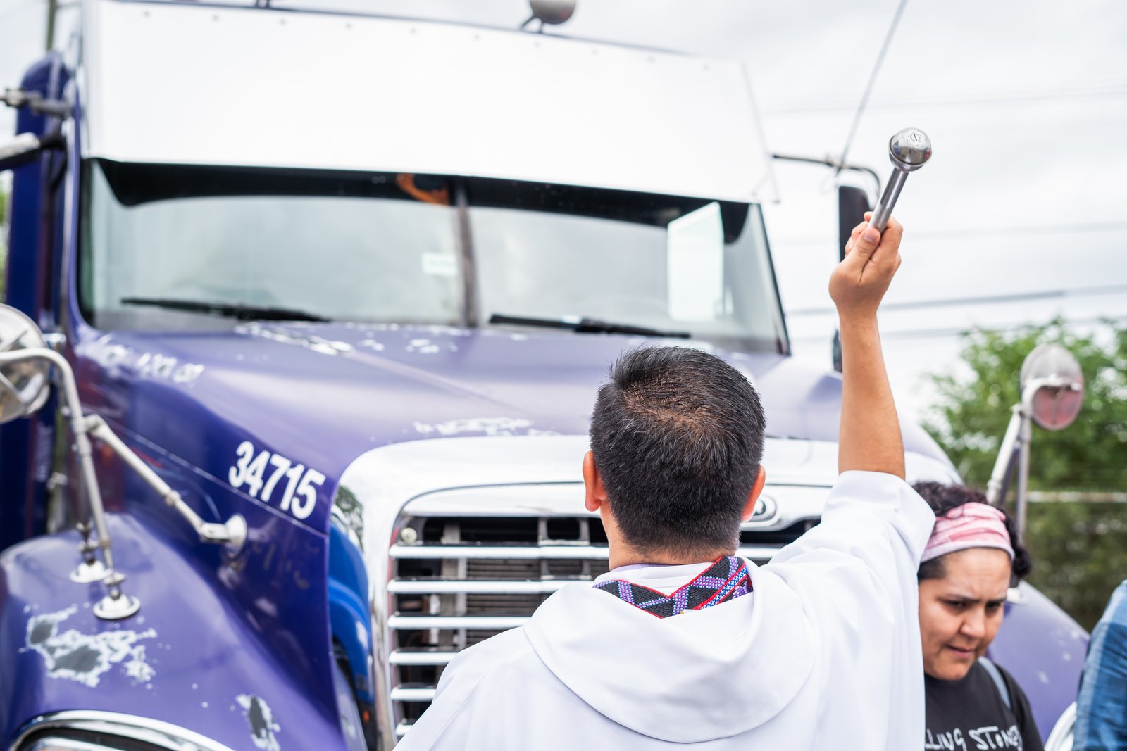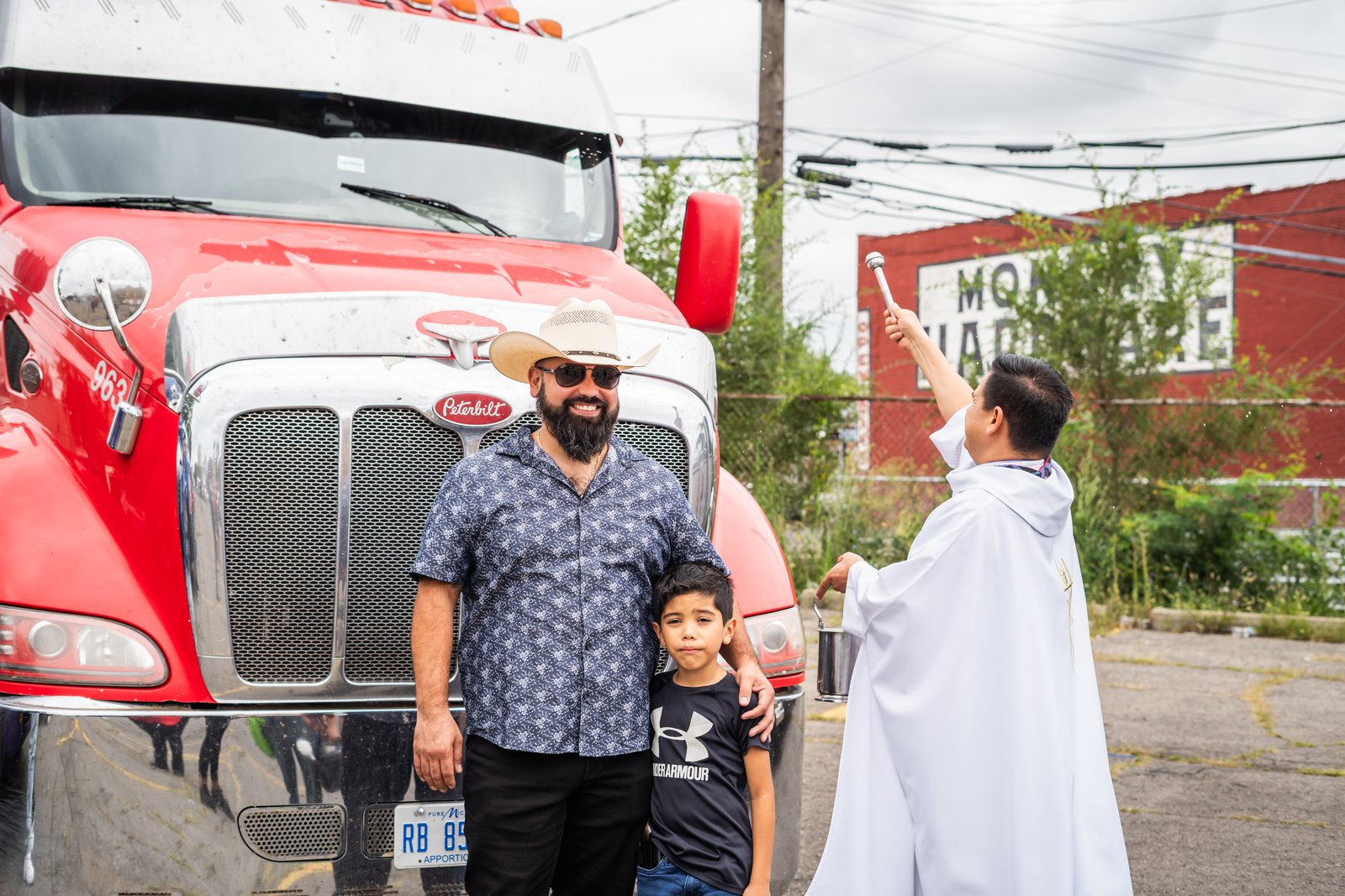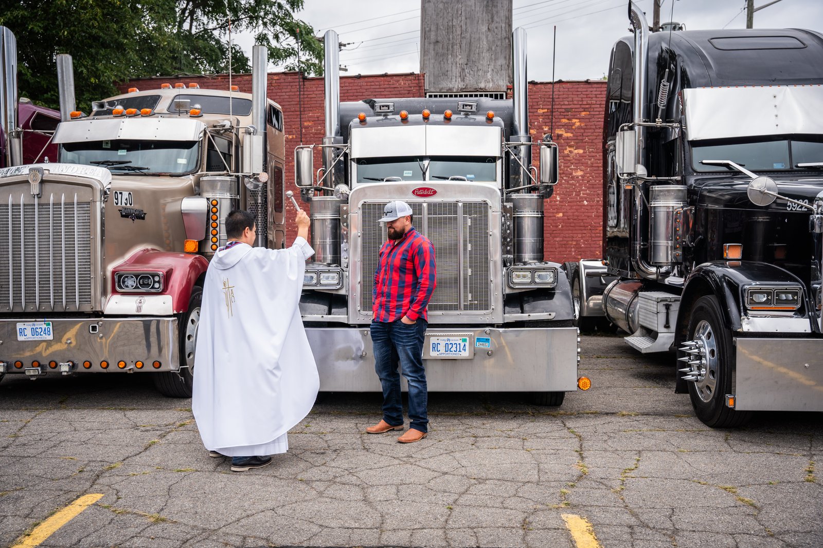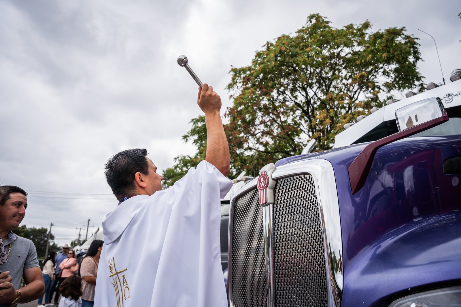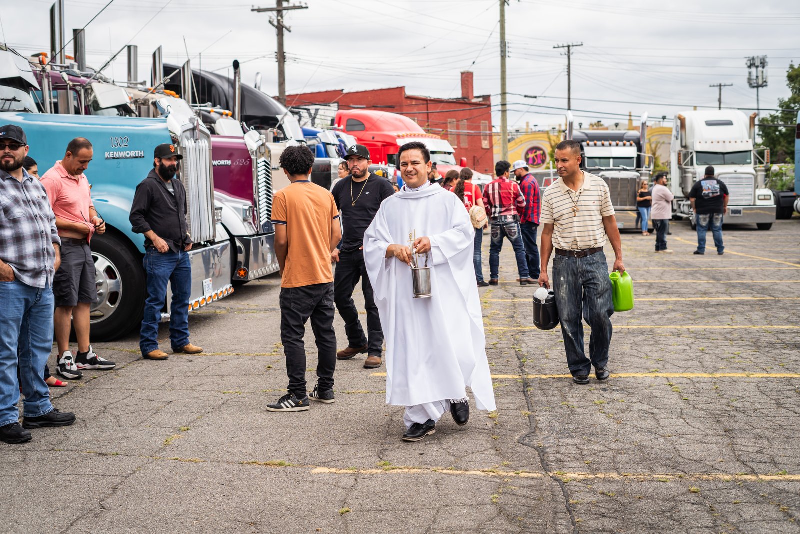Afterward, the drivers and their families go outside, stand in front of their rigs, and wait their turn as a priest makes his way around the parking lot, holy water sprinkler in hand, to bless each truck and the people connected to it.
