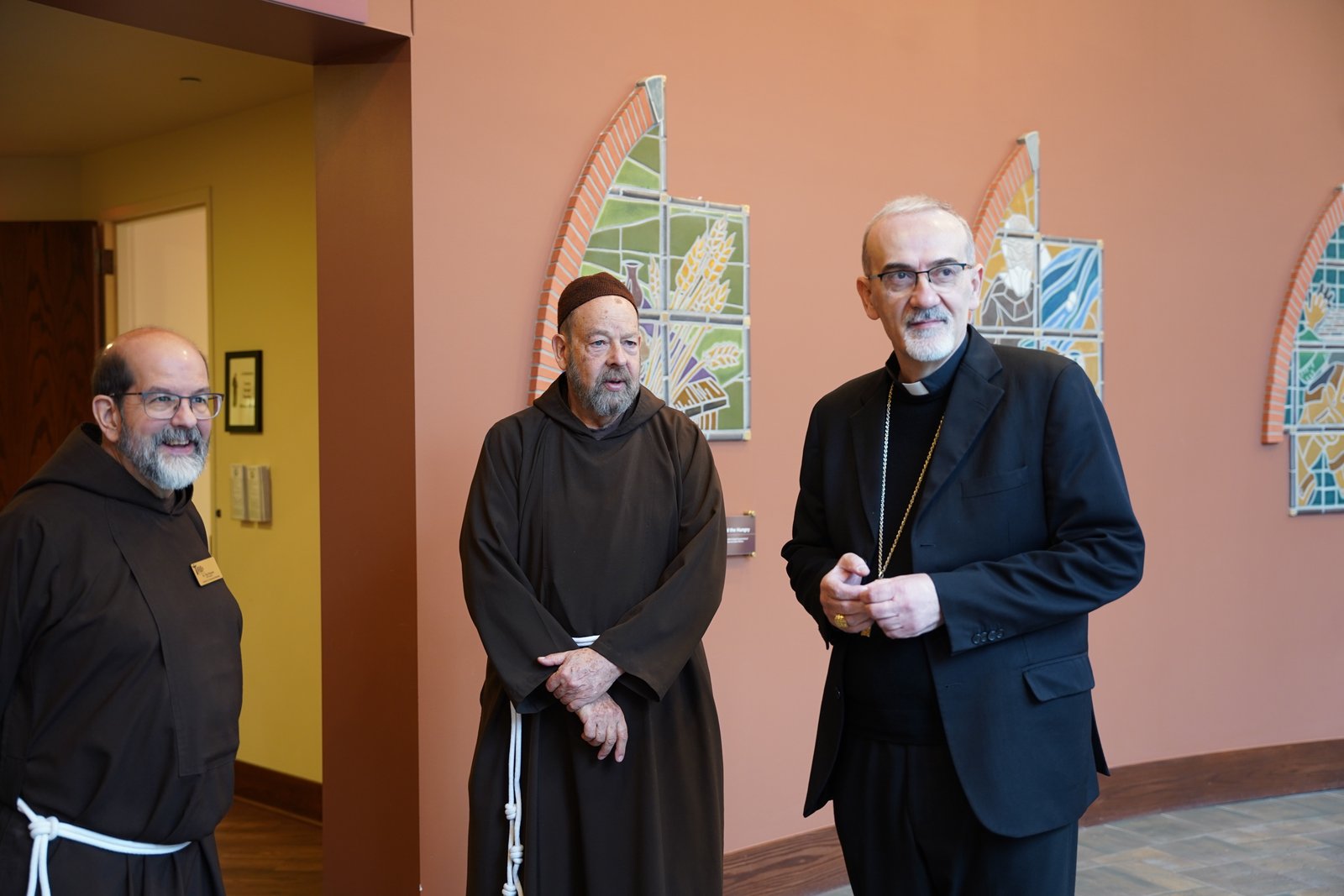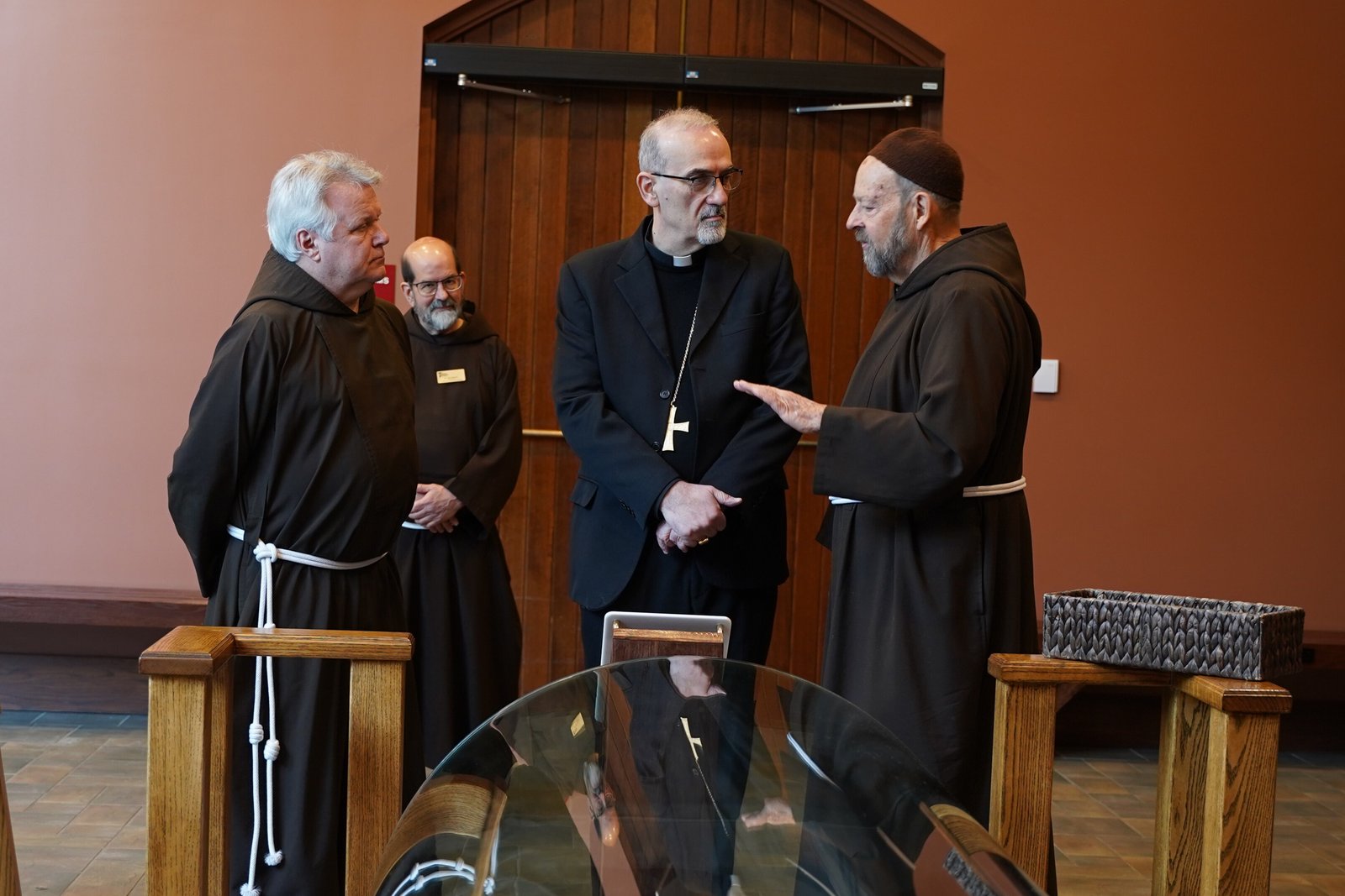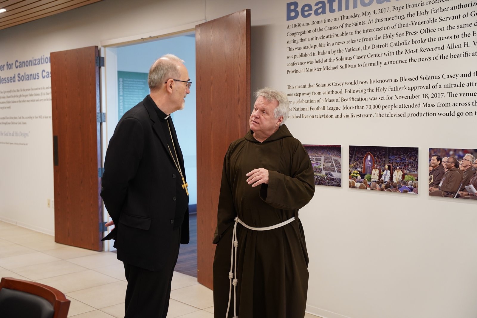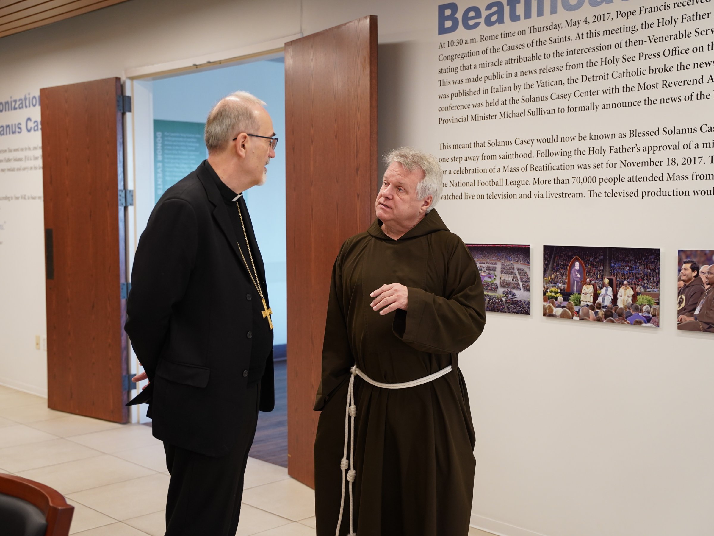 The Latin Patriarch of Jerusalem was given a tour of the Solanus Casey Center at St. Bonaventure Monastery by Bro. Rob Roemer, OFM Cap., guardian of St. Bonaventure Monastery, and Fr. Mark Joseph Costello, OFM Cap., provincial minister of the Capuchin Franciscan Province of St. Joseph.