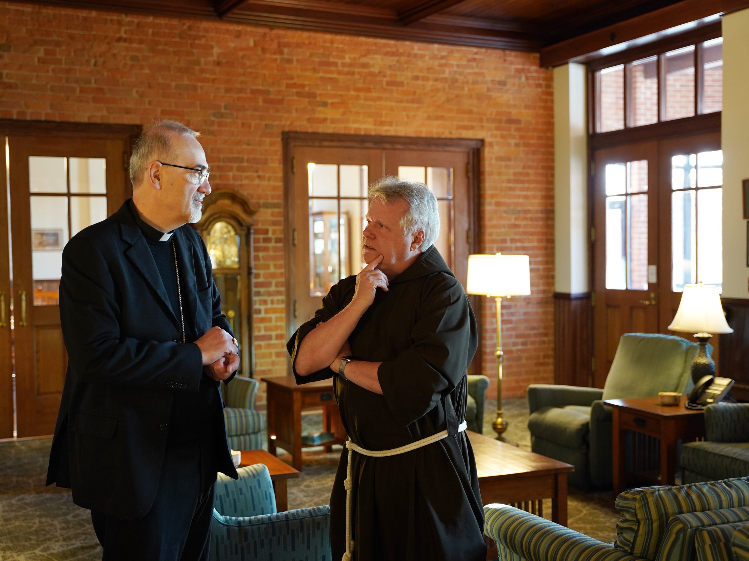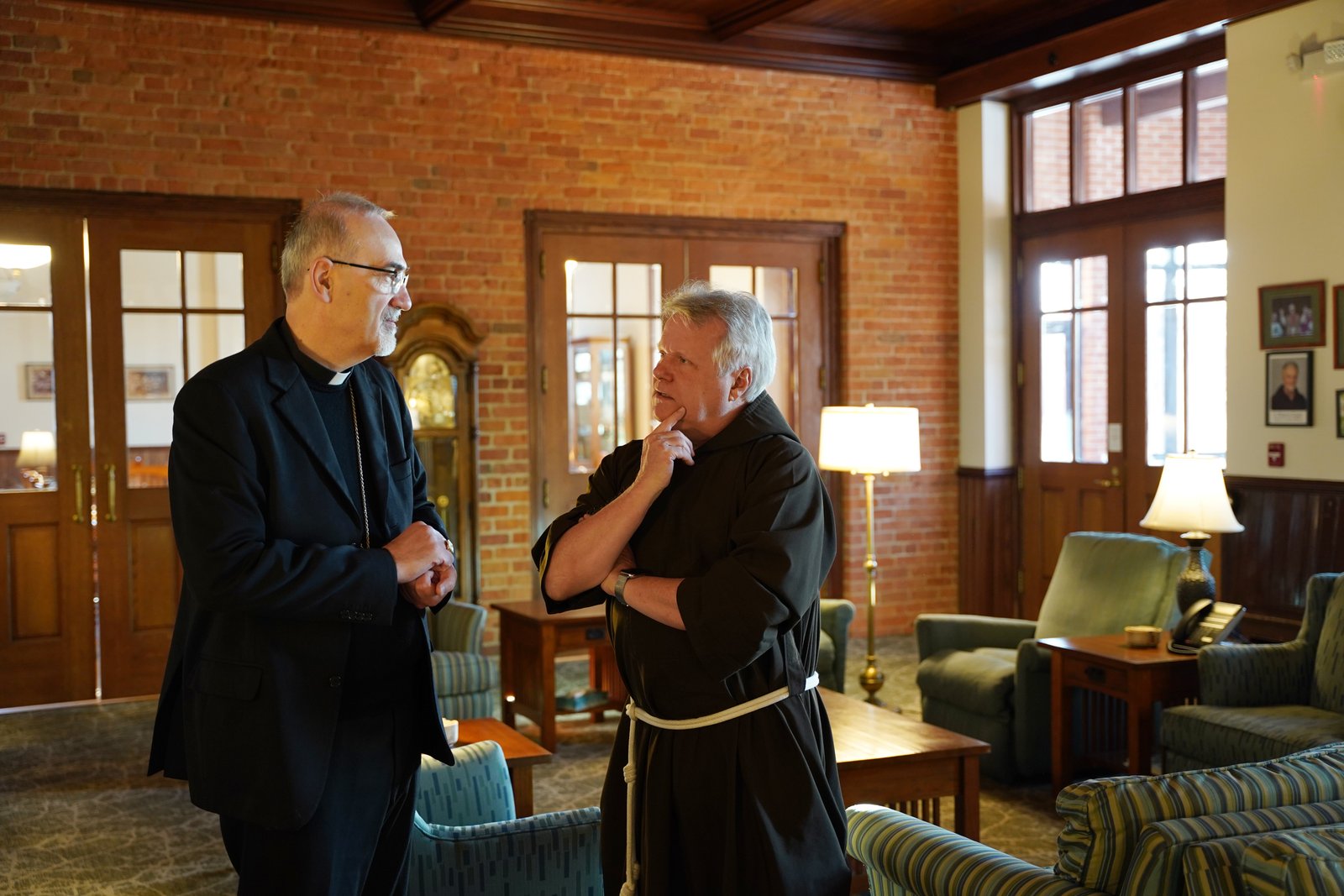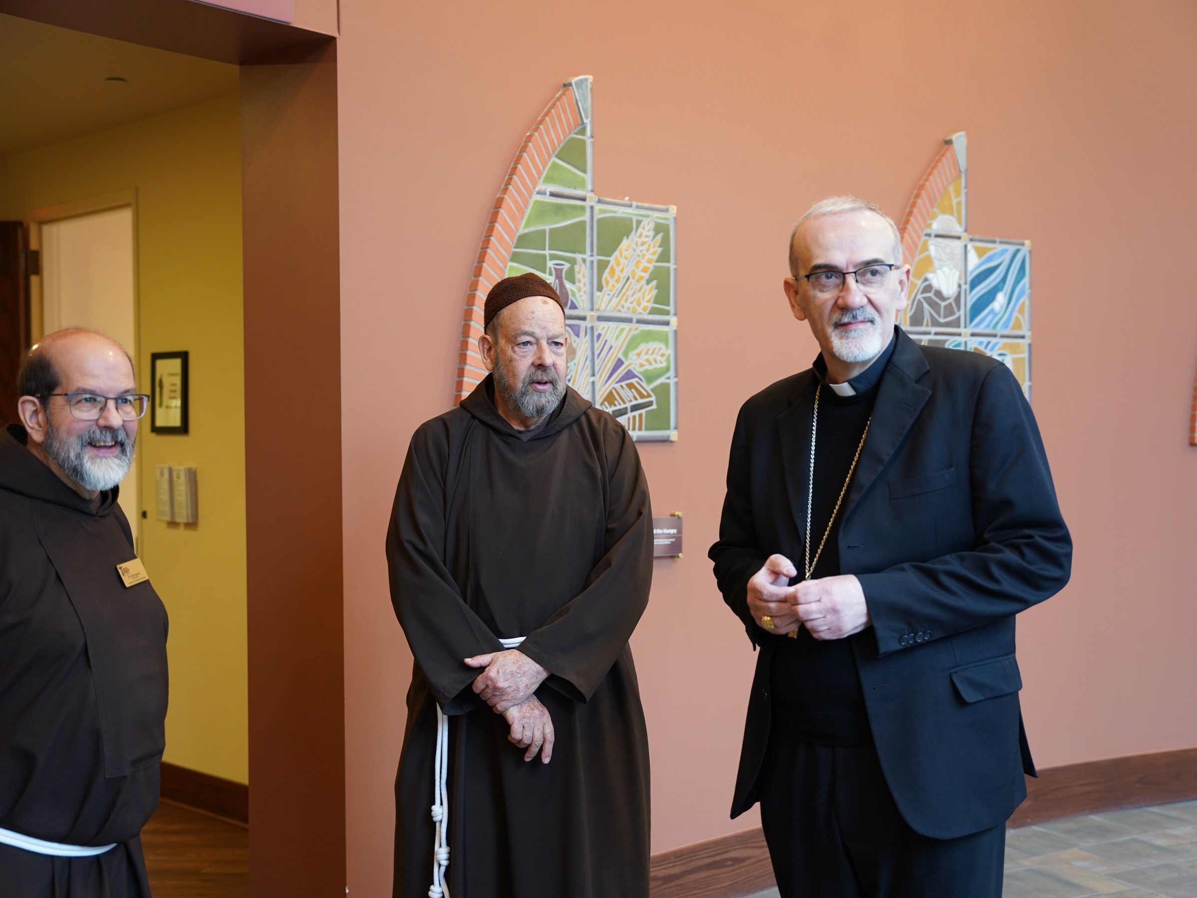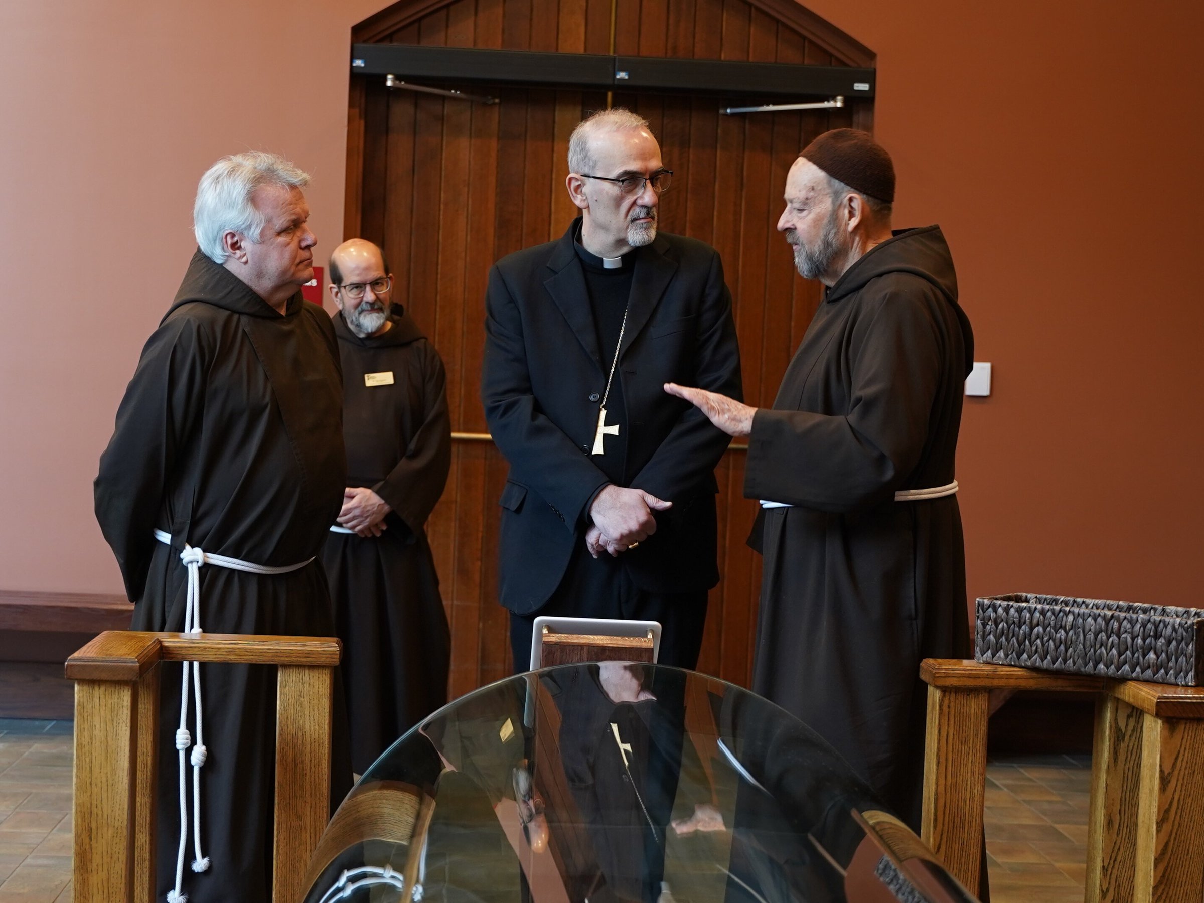 The Latin Patriarch of Jerusalem was given a tour of the Solanus Casey Center at St. Bonaventure Monastery by Bro. Rob Roemer, OFM Cap., guardian of St. Bonaventure Monastery, and Fr. Mark Joseph Costello, OFM Cap., provincial minister of the Capuchin Franciscan Province of St. Joseph.