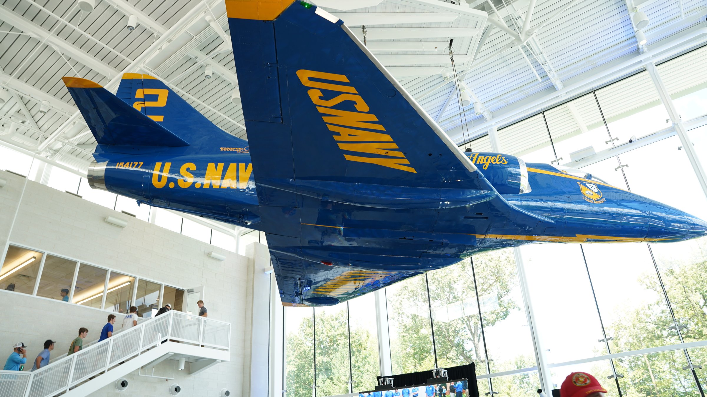 The George and Mary Turek Hall of Science makes an impression right away as visitors enter the building, with a Blue Angels aircraft hanging overhead a competitive robotics floor space.