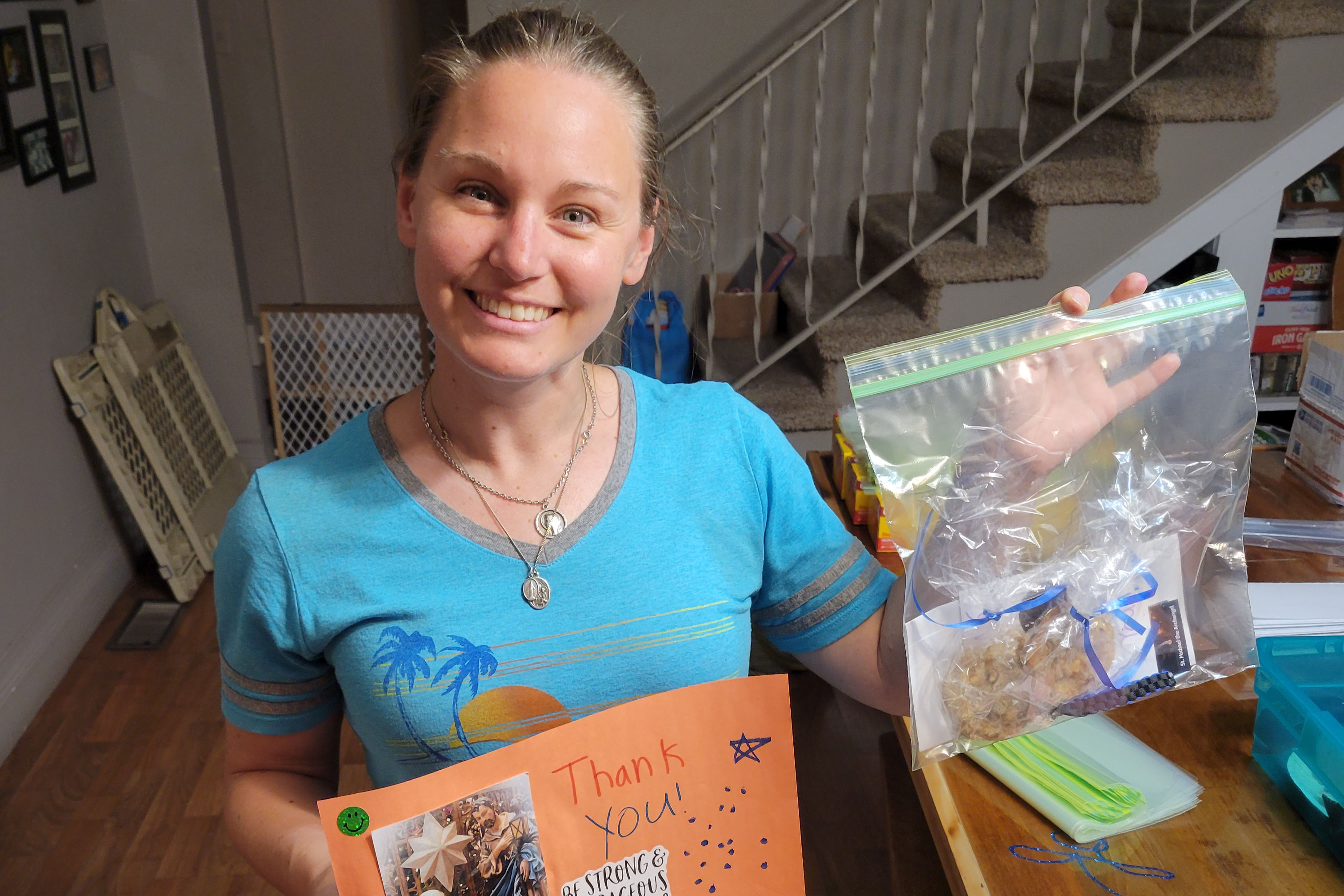 Within a few weeks, she and a friend had mobilized dozens of Catholic families, neighbors, friends and co-workers. Some made homemade cards. Some donated money for supplies. Others helped stuff goodie bags — 400 in all — which were delivered to five local police departments.